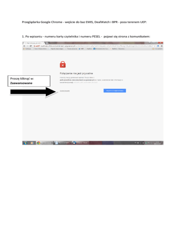 Przeglądarka Google Chrome - wejście do baz EMIS, DealWatch i BPR - poza terenem UEP: 1. Po wpisaniu - numeru karty czytelnika i numeru PESEL - pojawi się strona z komunikatem: Proszę kliknąć w: Zaawansowane 2. Po kliknięciu w Zaawansowane - pojawi się dodatkowa informacja z adresem URL bazy: Proszę kliknąć w Otwórz stronę… 3. Po kliknięciu w Otwórz stronę - pojawi się strona startowa bazy EMIS.
