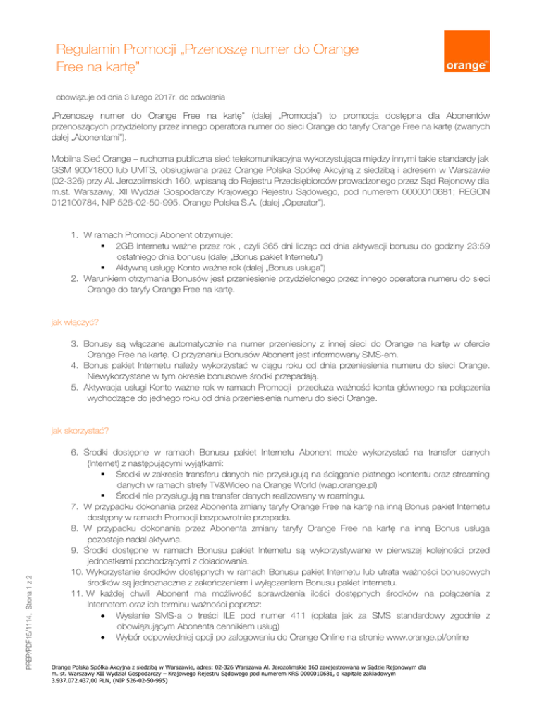 Regulamin Promocji „Przenoszę numer do Orange Free na kartę” obowiązuje od dnia 3 lutego 2017r. do odwołania „Przenoszę numer do Orange Free na kartę” (dalej „Promocja”) to promocja dostępna dla Abonentów przenoszących przydzielony przez innego operatora numer do sieci Orange do taryfy Orange Free na kartę (zwanych dalej „Abonentami”). Mobilna Sieć Orange – ruchoma publiczna sieć telekomunikacyjna wykorzystująca między innymi takie standardy jak GSM 900/1800 lub UMTS, obsługiwana przez Orange Polska Spółkę Akcyjną z siedzibą i adresem w Warszawie (02-326) przy Al. Jerozolimskich 160, wpisaną do Rejestru Przedsiębiorców prowadzonego przez Sąd Rejonowy dla m.st. Warszawy, XII Wydział Gospodarczy Krajowego Rejestru Sądowego, pod numerem 0000010681; REGON 012100784, NIP 526-02-50-995. Orange Polska S.A. (dalej „Operator”). 1. W ramach Promocji Abonent otrzymuje: 2GB Internetu ważne przez rok , czyli 365 dni licząc od dnia aktywacji bonusu do godziny 23:59 ostatniego dnia bonusu (dalej „Bonus pakiet Internetu”) Aktywną usługę Konto ważne rok (dalej „Bonus usługa”) 2. Warunkiem otrzymania Bonusów jest przeniesienie przydzielonego przez innego operatora numeru do sieci Orange do taryfy Orange Free na kartę. jak włączyć? 3. Bonusy są włączane automatycznie na numer przeniesiony z innej sieci do Orange na kartę w ofercie Orange Free na kartę. O przyznaniu Bonusów Abonent jest informowany SMS-em. 4. Bonus pakiet Internetu należy wykorzystać w ciągu roku od dnia przeniesienia numeru do sieci Orange. Niewykorzystane w tym okresie bonusowe środki przepadają. 5. Aktywacja usługi Konto ważne rok w ramach Promocji przedłuża ważność konta głównego na połączenia wychodzące do jednego roku od dnia przeniesienia numeru do sieci Orange. PREP/PDF15/1114, Strona 1 z 2 jak skorzystać? 6. Środki dostępne w ramach Bonusu pakiet Internetu Abonent może wykorzystać na transfer danych (Internet) z następującymi wyjątkami: Środki w zakresie transferu danych nie przysługują na ściąganie płatnego kontentu oraz streaming danych w ramach strefy TV&Wideo na Orange World (wap.orange.pl) Środki nie przysługują na transfer danych realizowany w roamingu. 7. W przypadku dokonania przez Abonenta zmiany taryfy Orange Free na kartę na inną Bonus pakiet Internetu dostępny w ramach Promocji bezpowrotnie przepada. 8. W przypadku dokonania przez Abonenta zmiany taryfy Orange Free na kartę na inną Bonus usługa pozostaje nadal aktywna. 9. Środki dostępne w ramach Bonusu pakiet Internetu są wykorzystywane w pierwszej kolejności przed jednostkami pochodzącymi z doładowania. 10. Wykorzystanie środków dostępnych w ramach Bonusu pakiet Internetu lub utrata ważności bonusowych środków są jednoznaczne z zakończeniem i wyłączeniem Bonusu pakiet Internetu. 11. W każdej chwili Abonent ma możliwość sprawdzenia ilości dostępnych środków na połączenia z Internetem oraz ich terminu ważności poprzez: Wysłanie SMS-a o treści ILE pod numer 411 (opłata jak za SMS standardowy zgodnie z obowiązującym Abonenta cennikiem usług) Wybór odpowiedniej opcji po zalogowaniu do Orange Online na stronie www.orange.pl/online Orange Polska Spółka Akcyjna z siedzibą w Warszawie, adres: 02-326 Warszawa Al. Jerozolimskie 160 zarejestrowana w Sądzie Rejonowym dla m. st. Warszawy XII Wydział Gospodarczy – Krajowego Rejestru Sądowego pod numerem KRS 0000010681, o kapitale zakładowym 3.937.072.437,00 PLN, (NIP 526-02-50-995) Kontakt z Orange Biurem Obsługi Klienta pod numerem *100 (opłata za połączenie zgodna z obowiązującym klienta cennikiem usług) ile kosztuje? 12. Promocja włączana jest bezpłatnie. 13. Po wykorzystaniu danych dostępnych w ramach Bonusu pakiet Internetu opłata za połączenia z Internetem jest zgodna z obowiązującym Abonenta cennikiem usług w taryfy Orange Free na kartę. dodatkowe informacje PREP/PDF15/1114, Strona 2 z 2 14. Promocja obowiązuje do odwołania. Operator zastrzega sobie możliwość odwołania, co nie będzie jednak naruszać praw nabytych przed odwołaniem Promocji. 15. Promocja łączy się z innymi, promocjami i usługami promocyjnymi dostępnym i w ofercie, z której Abonent korzysta, chyba, że warunki danej promocji lub usługi promocyjnej stanowią inaczej. 16. Niniejszy regulamin dostępny jest w siedzibie Orange Polska Spółka Akcyjna, na stronie internetowej www.orange.pl oraz w salonach Orange. 17. W zakresie nieuregulowanym niniejszym Regulaminem doświadczenia Promocji stosuje się obowiązujące Abonenta: Regulamin oferty Orange Free na kartę, Cennik produktów w ofercie Orange Free na kartę, Cennik usług w ofercie Orange Free na kartę, Regulamin usługi Konto ważne rok oraz Regulamin świadczenia usług telekomunikacyjnych dla Abonentów ofert na kartę. Orange Polska Spółka Akcyjna z siedzibą w Warszawie, adres: 02-326 Warszawa Al. Jerozolimskie 160 zarejestrowana w Sądzie Rejonowym dla m. st. Warszawy XII Wydział Gospodarczy – Krajowego Rejestru Sądowego pod numerem KRS 0000010681, o kapitale zakładowym 3.937.072.437,00 PLN, (NIP 526-02-50-995)