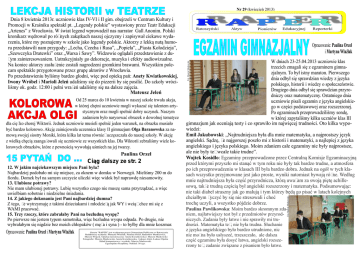 LEKCJA HISTORII w TEATRZE dla ciężko chorej Wiktorii. Jednak uczniowie musieli spełnić jeden warunek, na obrazku musiało być bardzo kolorowo. Akcję zainicjowała uczennica klasy II gimnazjum Olga Baranowska za namową swojej siostry Moniki, która kilka lat temu również uczęszczała do naszej szkoły. W akcję z wielką chęcią zaangażowali się uczniowie ze wszystkich klas. Dla Wiktorii zebraliśmy wiele kolorowych obrazków, które z pewnością wywołają uśmiech na jej twarzy. 15 PYTAŃ DO ... Paulina Orzeł Ciąg dalszy ze str. 2 12. W jakim najciekawszym miejscu Pani była? Najbardziej podobało mi się miejsce, za oknem w domku w Norwegii. Mieliśmy 200 m do fiordu. Domek był na samym szczycie uliczki więc widok był naprawdę niesamowity. 13. Ulubione potrawy? Nie mam ulubionej potrawy. Lubię wszystko czego nie muszę sama przyrządzać, a więc uwielbiam sobotnie i niedzielne śniadania. 14. Z jakiego dokonania jest Pani najbardziej dumna? Z tego, że wytrzymuję z takimi dzieciakami i młodzieżą jak WY i wciąż chce mi się z WAMI pracować. 15. Trzy rzeczy, które zabrałaby Pani na bezludną wyspę? Po pierwsze nie jestem typem samotnika, więc bezludna wyspa odpada. Po drugie, nie wybrałabym się nigdzie bez moich chłopaków ( męża i syna ) - to byłby dla mnie koszmar. Opracowanie: Paulina Orzeł i Martyna Wlaźlak Gazeta "RAPER" jest wydawana przez Gimnazjum Publiczne w Ratoszynie Redaktorzy wydania: Martyna Wlaźlak, Paulina Orzeł, Radosław Markiewicz, Marcin Wójcik. Opieka merytoryczna: Aneta Kwiatkowska i Marcin Markowski Fotografie: Marcin Markowski, Aneta Kwiatkowska, Łukasz Jeleń, Łukasz Opoka Skład komputerowy i wydruk: Marcin Markowski. Egzemplarz bezpłatny. Nakład: 30 egz. Aktyw Pionierówj Edukacyjnej EGZAMIN GIMNAZJALNY Reporterki Opracowanie: Paulina Orzeł i Martyna Wlaźlak W dniach 23-25.04.2013 uczniowie klas trzecich zmagali się z egzaminem gimnazjalnym. To był istny maraton. Pierwszego dnia odbył się sprawdzian wiedzy z języka polskiego, historii i wiedzy o społeczeństwie. Drugiego dnia odbył się sprawdzian przyrodniczy oraz matematyczny. Ostatniego dnia uczniowie pisali egzamin z języka angielskiego w części podstawowej oraz rozszerzonej. Po egzaminach przeprowadziliśmy sondę, w której zapytaliśmy kilku uczniów klas III gimnazjum jak oceniają testy i co sprawiło im najwięcej trudności. Oto kilka wypowiedzi: Emil Jakubowski: ,,Najtrudniejsza była dla mnie matematyka, a najprostszy język angielski. Sądzę, że najgorszej poszło mi z historii i matematyki, a najlepiej z języka angielskiego i języka polskiego. Moim zdaniem całe egzaminy nie były najprostsze, ale nie były też wcale takie trudne”. Wojtek Kosidło: Egzaminy przeprowadzone przez Centralną Komisje Egzaminacyjną przed którymi przyszło mi stanąć w tym roku nie były tak bardzo trudne, a atmosfera po ich przeprowadzeniu w klasach III była bardzo dobra. Jednak na ogół w tych klasach wszystko przyjmowane jest jako proste, wyniki natomiast bywają różne. Według mnie najtrudniejsza była część przyrodnicza, którą uważam za swoją piętę achillesową, także trudną częścią był angielski rozszerzony i matematyka. Podsumowując: nie taki diabeł straszny jak go malują i tym którzy będą go pisać w latach kolejnych chciałbym życzyć by się nie stresowali i choć trochę uczyli, a wszystko pójdzie dobrze. Fot. Marcin Markowski Od 25 marca do 10 kwietnia w naszej szkole trwała akcja, KOLOROWA w której chętni uczniowie mogli wykazać się talentem artystycznym oraz mogli spełnić dobry uczynek. Naszym AKCJA OLGI zadaniem było narysować obrazek o dowolnej tematyce R A P E R Ratoszyński Fot. Marcin Markowski Dnia 8 kwietnia 2013r. uczniowie klas IV-VI i II gim. obejrzeli w Centrum Kultury i Promocji w Kraśniku spektakl pt. „Legendy polskie” wystawiony przez Teatr Edukacji „Artenes” z Wrocławia. W świat legend wprowadził nas narrator Gall Anonim. Polski kronikarz wędrował po różnych zakątkach naszej ojczyzny i zapisywał ciekawe wydarzenia, które my poznajemy w szkole jako legendy polskie. Aktorzy z lekką nutą humoru przedstawili nam przygody: „Lecha, Czecha i Rusa”, „Popiela”, „Piasta Kołodzieja”, „Szewczyka Dratewki” oraz „Warsa i Sawy”. Widzowie oglądali przedstawienie z dużym zainteresowaniem. Uatrakcyjniały go dekoracje, muzyka i efekty audiowizualne. Na koniec aktorzy zasłużenie zostali nagrodzeni gromkimi brawami. Wszystkim polecam spektakle przygotowane przez grupę aktorów z Wrocławia. Po przedstawieniu byliśmy bardzo głodni, więc pod opieką pań: Anety Kwiatkowskiej, Iwony Wróbel i Marioli Jeleń udaliśmy się do pizzerii by się posilić. Do szkoły wróciliśmy ok. godz. 12:00 i pełni wrażeń udaliśmy się na dalsze zajęcia. Mateusz Jeleń Nr 29 (kwiecień 2013) Paulina Pawlikowska: Moim bardzo skromnym zdaniem, najłatwiejszy test był z przedmiotów przyrodniczych. Zadania były łatwe i nie sprawiły mi trudności. Matematyka też, nie była trudna. Słuchanie z języka angielskiego było bardzo utrudnione, nic nie można było usłyszeć, trzeszczało, ale dalsza część egzaminu była dosyć łatwa, angielski rozszerzony też, zadanie związane z pisaniem było łatwe. 15 PYTAŃ DO ... Dzisiaj na nasze pytania odpowiada pani Iwona WRÓBEL nauczyciel języka angielskiego Fot. Marcin Markowski 1. Ostatnio przeczytana książka? Moja ostatnio przeczytana książka to ''Żniwo Gniewu'' autorki Lucie Di Angeli-Ilovan. Jest to książka o sile przyjaźni i rodzinnych więzów w czasie II wojny. Kiedyś ktoś powiedział, że ''Nigdy więcej wojny'' to słowa często powtarzane z ust pokolenia, które przeżyło wojnę. Dla nas, tych których wojna nie dotknęła to wezwanie może być nie do końca zrozumiałe. Ale książki takie jak ''Żniwo gniewu'' w pełni uświadamiają jakie okropieństwa, dramaty i tragedie nas ominęły. Bo wojna to 