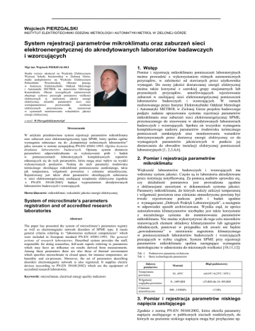 Wojciech PIERZGALSKI INSTYTUT ELEKTROTECHNIKI ODDZIAŁ METROLOGII I AUTOMATYKI METROL W ZIELONEJ GÓRZE System rejestracji parametrów mikroklimatu oraz zaburzeń sieci elektroenergetycznej do akredytowanych laboratoriów badawczych i wzorcujących Mgr inż. Wojciech PIERZGALSKI 1. Wstęp Studia wyższe ukończył na Wydziale Elektrycznym Wyższej Szkoły Inżynierskiej w Zielonej Górze, studia podyplomowe na Wydziale Elektrycznym Politechniki Wrocławskiej. Obecnie pracuje w Instytucie Elektrotechniki Oddział Metrologii i Automatyki METROL na stanowisku Głównego Konstruktora. Obszar szczególnych zainteresowań obejmuje cyfrowe przyrządy pomiarowe wielkości elektrycznych tj. analizatory jakości energii elektrycznej, mierniki parametrów sieci oraz wieloparametrowe przetworniki wielkości elektrycznych przeznaczone do zastosowań w systemach monitorowania wskaźników jakości energii elektrycznej. Pomiar i rejestrację mikroklimatu pomieszczeń laboratoryjnych można prowadzić z wykorzystaniem różnych autonomicznych przyrządów, w zależności od stawianych przez użytkownika wymagań. Do oceny jakości dostarczanej energii elektrycznej można także korzystać z szerokiej grupy stacjonarnych lub przenośnych przyrządów, umożliwiających rejestrowanie zaburzeń w zasilającej sieci elektroenergetycznej pomieszczeń laboratoriów badawczych i wzorcujących. W ramach realizowanego przez Instytut Elektrotechniki Oddział Metrologii i Automatyki METROL w Zielonej Górze projektu badawczego podjęto zadanie opracowania systemu rejestracji parametrów mikroklimatu oraz zaburzeń sieci elektroenergetycznej SPME, przeznaczonego do stosowania w akredytowanych laboratoriach badawczych i wzorcujących. Spełnia on wszystkie wymagania kompleksowego nadzoru parametrów środowiska termicznego pomieszczeń zamkniętych oraz monitorowania warunków dotrzymywanych przez dostawcę energii elektrycznej co do wymaganych parametrów jakościowych w punkcie jej dostarczania do obwodów instalacji elektrycznej pomieszczeń laboratoryjnych [1, 2,3,4,6]. e-mail: [email protected] Streszczenie W artykule przedstawiono system rejestracji parametrów mikroklimatu oraz zaburzeń sieci elektroenergetycznej typu SPME, który spełnia ogólne wymagania odnoszące się do „kompetencji technicznych laboratoriów” jakie zawarto w normie europejskiej PN-EN 45001:1993: Ogólne kryteria działania laboratoriów badawczych. Opisany system dostarcza personelowi odpowiedzialnemu za wykonywanie prób i badań w pomieszczeniach laboratoryjnych kompleksowych raportów odnoszących się do tych parametrów, które mogą mieć wpływ na wyniki wykonywanych pomiarów. Należą do nich parametry środowiska termicznego określające mikroklimat pomieszczenia zamkniętego, takie jak temperatura, wilgotność powietrza i ciśnienie atmosferyczne. Rejestrowany jest także zbiór parametrów określających zaburzenia w sieci elektroenergetycznej zasilającej urządzenia elektryczne (zgodnie z PN-EN 50160:2002) będące wyposażeniem akredytowanych laboratoriów badawczych i wzorcujących. Słowa kluczowe: mikroklimat, wskaźniki jakości energii elektrycznej System of microclimate’s parameters registration and of accredited research laboratories Abstract The paper has presented the system of microclimate’s parameters registry as well as electromagnetic network disorders of SPME type. It meets general criteria referring to “laboratories technical competencies” which were included in European standard PN-EN 45001:1993: The general actions of research laboratories. Described system provides the staff, responsible for doing researches, full-scale reports referring to parameters which may have an influence on results derived from measurements. Among these parameters there are also those of thermal environment which specifies microclimate in closed space, for instance temperature, air humidity and air-pressure. Moreover, the set of parameters describing disorders electromagnetic network is also registered. It supplies electric devices (according to PN-EN 50160:2002) which are the equipment of accredited research laboratories. Keywords: microclimate, electrical energy quality indicators 2. Pomiar i rejestracja parametrów mikroklimatu Większość laboratoriów badawczych i wzorcujących ma wdrożony system jakości. Często są to laboratoria akredytowane przez instytucję notyfikowaną. Za pomocą auditów sprawdza się, czy działalność pomiarowa jest prowadzona zgodnie z deklaracjami zawartymi w dokumentach systemu jakości. Parametry mikroklimatu, do których należy zaliczyć temperaturę i wilgotność powietrza oraz ciśnienie atmosferyczne powinny być trwale rejestrowane podczas prób i badań zgodnie z wymaganiami „Dobrych Praktyk Laboratoryjnych”, a następnie w odpowiedni sposób archiwizowane. Wynika stąd, że oprócz zainstalowania klimatyzatorów niezbędne jest także korzystanie z niezależnego systemu do monitorowania parametrów mikroklimatu. Nie można wykorzystywać do tego celu mierników stanowiących element składowy klimatyzatorów lub agregatów chłodniczych, ponieważ w przypadku ich awarii nie będzie „powiadomienia” o zaistnieniu zagrożenia klimatycznego w pomieszczeniach laboratoriów badawczych i wzorcujących pracujących w trybie ciągłym. System SPME przy rejestracji parametrów mikroklimatu spełnia następujące wymagania metrologiczne w odniesieniu do mierzonych wielkości [10,11,12]: Tab. 1. Tab. 1. Podstawowe parametry techniczne Basic technologicals parameterrs Zakresy pomiarowe Temperatura powietrza Wilgotność względna powietrza Ciśnienie atmosferyczne Wartość Błąd podstawowy 10...60ºC ±(0,4ºC+0,25ºC /10ºC) 0...100%RH ±2%RH dla 10..90%RH 800...1100hPa ±3 hPa 3. Pomiar i rejestracja parametrów niskiego napięcia zasilającego Zgodnie z normą PN-EN 50160:2002, która określa parametry napięcia zasilającego w publicznych sieciach rozdzielczych,