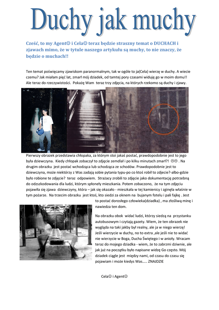 Cześć, to my Agent☺ ☺ i Cela☺ ☺ teraz będzie straszny temat o DUCHACH i zjawach mimo, że w tytule naszego artykułu są muchy, to nie znaczy, że będzie o muchach!! Ten temat poświęcamy zjawiskom paranormalnym, tak w ogóle to ja(Cela) wierzę w duchy. A wiecie czemu? Jak miałam pięć lat, zmarł mój dziadek, od tamtej pory czasami widuję go w moim domu!! Ale teraz do rzeczywistości. Pokażę Wam teraz trzy zdjęcia, na których rzekomo są duchy i zjawy. Pierwszy obrazek przedstawia chłopaka, za którym stoi jakaś postać, prawdopodobnie jest to jego była dziewczyna. Kiedy chłopak zobaczył to zdjęcie zemdlał i po kilku minutach zmarł?! . Na drugim obrazku jest postać wchodząca lub schodząca ze schodów. Prawdopodobnie jest to dziewczyna, może niektórzy z Was zadają sobie pytania typu-po co ktoś robił to zdjecie?-albo-gdzie było robione te zdjęcie? teraz odpowiem. Strażacy zrobili to zdjęcie jako dokumentację potrzebną do odzszkodowania dla ludzi, którym spłoneły mieszkania. Potem zobaczono, że na tym zdjęciu pojawiła się zjawa dziewczyny, która – jak się okazało - mieszkała w tej kamienicy i zginęła właśnie w tym pożarze. Na trzecim obrazku jest ktoś, kto siedzi za oknem na bujanym fotelu i pali fajkę . Jest to postać dorosłego człowieka(dziadka) , ma złośliwą minę i nawiedza ten dom. Na obrazku obok widać ludzi, którzy siedzą na przystanku autobusowym i czytają gazety. Wiem, że ten obrazek nie wygląda na taki jakby był realny, ale ja w niego wierzę! Jeśli wierzycie w duchy, no to extra ,ale jeśli nie to widać nie wierzycie w Boga, Ducha Świętego i w anioły. Wracam teraz do mojego dziadka - wiem, że to zabrzmi dziwnie, ale jak już na początku było napisane widzę Go często. Mój dziadek ciągle jest między nami, od czasu do czasu się pojawiam i może kiedys Was….. ZNAJDZIE Cela☺ i Agent☺