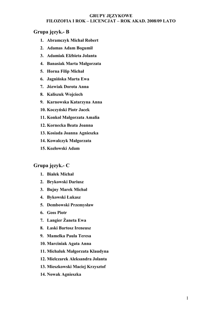 GRUPY JĘZYKOWE FILOZOFIA I ROK – LICENCJAT – ROK AKAD. 2008/09 LATO Grupa język.- B 1. Abramczyk Michał Robert 2. Adamas Adam Bogumił 3. Adamiak ElŜbieta Jolanta 4. Banasiak Marta Małgorzata 5. Horna Filip Michał 6. Jagnińska Marta Ewa 7. Józwiak Dorota Anna 8. Kaliszuk Wojciech 9. Karnowska Katarzyna Anna 10. Koczyński Piotr Jacek 11. Konkol Małgorzata Amalia 12. Kornecka Beata Joanna 13. Kosiada Joanna Agnieszka 14. Kowalczyk Małgorzata 15. Kozłowski Adam Grupa język.- C 1. Białek Michał 2. Brykowski Dariusz 3. Bujny Marek Michał 4. Bykowski Łukasz 5. Dembowski Przemysław 6. Goss Piotr 7. Langier śaneta Ewa 8. Łaski Bartosz Ireneusz 9. Mamełka Paula Teresa 10. Marciniak Agata Anna 11. Michaluk Małgorzata Klaudyna 12. Mielczarek Aleksandra Jolanta 13. Mieszkowski Maciej Krzysztof 14. Nowak Agnieszka 1 GRUPY JĘZYKOWE FILOZOFIA I ROK – LICENCJAT – ROK AKAD. 2008/09 LATO Grupa język. D 1. Nowogórska Katarzyna Agnieszka 2. Okrasa Dobromiła Maria 3. Orzechowski Szymon 4. Pawlak Mariusz 5. Piątek Joanna Maria 6. Pietrzak Adrian Patryk 7. Pilarek Weronika Paulina 8. Popek Katarzyna Małgorzata 9. Przybojewska Hanna ElŜbieta 10. Rakowski-Kłos Igor Janusz 11. Rogalska Roksana Luiza 12. Rusek Damian Andrzej 13. Sapija Kacper Andrzej 14. Sarnik Andrzej 15. Sendacki Piotr Grupa język.-. F 1. Stępień Jakub BłaŜej 2. Stępniak Dawid 3. Szaliński Jakub Dominik 4. Szuster Adam Piotr 5. Śliwiński Adam 6. Tryścień Rafał Józef 7. Wawrzyniak Dominik Krzysztof 8. Wiśniewska Violetta Anna 9. Woźniak Filip Iwo 10. Woźniakowska Karina Patrycja 11. Zając Marcin Franciszek 12. Zdunek Marcin 13. śuchowski Michał 14. śychliński Marcin 2