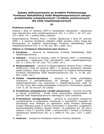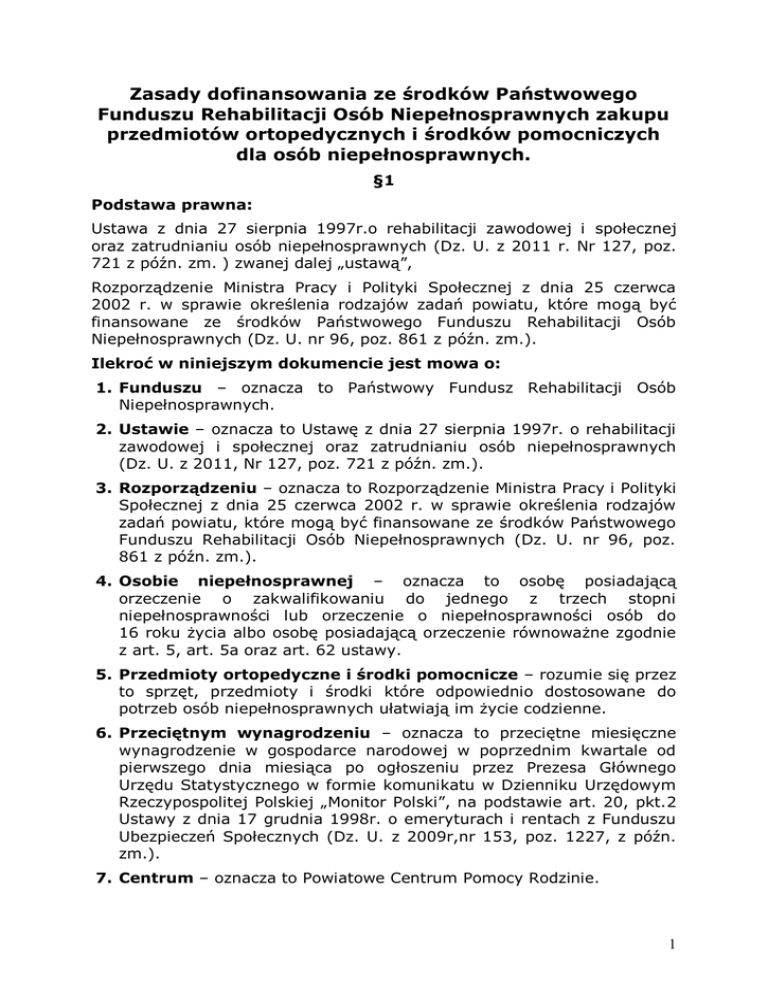 Zasady dofinansowania ze środków Państwowego Funduszu Rehabilitacji Osób Niepełnosprawnych zakupu przedmiotów ortopedycznych i środków pomocniczych dla osób niepełnosprawnych. §1 Podstawa prawna: Ustawa z dnia 27 sierpnia 1997r.o rehabilitacji zawodowej i społecznej oraz zatrudnianiu osób niepełnosprawnych (Dz. U. z 2011 r. Nr 127, poz. 721 z późn. zm. ) zwanej dalej „ustawą”, Rozporządzenie Ministra Pracy i Polityki Społecznej z dnia 25 czerwca 2002 r. w sprawie określenia rodzajów zadań powiatu, które mogą być finansowane ze środków Państwowego Funduszu Rehabilitacji Osób Niepełnosprawnych (Dz. U. nr 96, poz. 861 z późn. zm.). Ilekroć w niniejszym dokumencie jest mowa o: 1. Funduszu – oznacza to Państwowy Fundusz Rehabilitacji Osób Niepełnosprawnych. 2. Ustawie – oznacza to Ustawę z dnia 27 sierpnia 1997r. o rehabilitacji zawodowej i społecznej oraz zatrudnianiu osób niepełnosprawnych (Dz. U. z 2011, Nr 127, poz. 721 z późn. zm.). 3. Rozporządzeniu – oznacza to Rozporządzenie Ministra Pracy i Polityki Społecznej z dnia 25 czerwca 2002 r. w sprawie określenia rodzajów zadań powiatu, które mogą być finansowane ze środków Państwowego Funduszu Rehabilitacji Osób Niepełnosprawnych (Dz. U. nr 96, poz. 861 z późn. zm.). 4. Osobie niepełnosprawnej – oznacza to osobę posiadającą orzeczenie o zakwalifikowaniu do jednego z trzech stopni niepełnosprawności lub orzeczenie o niepełnosprawności osób do 16 roku życia albo osobę posiadającą orzeczenie równoważne zgodnie z art. 5, art. 5a oraz art. 62 ustawy. 5. Przedmioty ortopedyczne i środki pomocnicze – rozumie się przez to sprzęt, przedmioty i środki które odpowiednio dostosowane do potrzeb osób niepełnosprawnych ułatwiają im życie codzienne. 6. Przeciętnym wynagrodzeniu – oznacza to przeciętne miesięczne wynagrodzenie w gospodarce narodowej w poprzednim kwartale od pierwszego dnia miesiąca po ogłoszeniu przez Prezesa Głównego Urzędu Statystycznego w formie komunikatu w Dzienniku Urzędowym Rzeczypospolitej Polskiej „Monitor Polski”, na podstawie art. 20, pkt.2 Ustawy z dnia 17 grudnia 1998r. o emeryturach i rentach z Funduszu Ubezpieczeń Społecznych (Dz. U. z 2009r,nr 153, poz. 1227, z późn. zm.). 7. Centrum – oznacza to Powiatowe Centrum Pomocy Rodzinie. 1 8. DPS – oznacza to Dom Pomocy Społecznej. 9. Zespół- oznacza to Zespół powołany Zarządzeniem Nr 1/2009 z dnia 14 stycznia 2009 roku Dyrektora Powiatowego Centrum Pomocy Rodzinie w Łowiczu do rozpatrywania wniosków dot. dofinansowania ze środków Państwowego Funduszu Rehabilitacji Osób Niepełnosprawnych. §2 O dofinansowanie do zaopatrzenia w przedmioty ortopedyczny i środki pomocnicze, przyznawane na podstawie odrębnych przepisów mogą się ubiegać osoby niepełnosprawne stosownie do potrzeb wynikających z niepełnosprawności. 1. Przedmioty ortopedyczne to przyrządy ortopedyczne niezbędne osobie niepełnosprawnej w przypadku trwałego inwalidztwa, w okresie choroby lub usprawnienia leczniczego. Przedmioty ortopedyczne przysługują bezpłatnie lub częściowo odpłatnie ( w zależności od rodzaju przedmiotu) raz na 2,3,4 lub 5 lat. Do przedmiotów ortopedycznych zaliczamy np.: protezy kończyn dolnych i górnych, dodatkowe wyposażenie do protez, aparaty ortopedyczne na kończyny dolne i górne wraz z wyposażeniem dodatkowym, protezy kończyn, gorsety i kołnierze ortopedyczne, protezy tułowia i szyi, obuwie ortopedyczne, kule i laski inwalidzkie, balkoniki i podpórki do chodzenia, wózki inwalidzkie, foteliki dla dziecka do siedzenia, indywidualne przedmioty pionizujące, pełzak do raczkowania itp. 2. Środki pomocnicze to takie środki, które ułatwiają w znacznym stopniu, bądź też umożliwiają, funkcjonowanie osoby niepełnosprawnej w środowisku społecznym (są nimi np. soczewki, lupy, lunety, szkła do okularów, systemy wspomagające słuch, cewniki, worki do zbioru moczu, aparaty słuchowe, wkładki uszne, pieluchomajtki, protezy piersi, pasy przepuklinowe, pieluchy anatomiczne, poduszki przeciwodleżynowe, materace przeciwodleżynowe, peruki, inhalatory, krtań elektroniczna itp.) 3. Prawo do otrzymania określonego rodzaju przedmiotu ortopedycznego lub środka pomocniczego (bezpłatnie lub częściowo odpłatnie) mają osoby ubezpieczone oraz osoby pozostające na ich utrzymaniu. Przedmioty ortopedyczne i środki pomocnicze przyznawane są uprawnionemu na własność. Ponowne przyznanie zaopatrzenia może nastąpić po upływie okresu jego używalności, zgodnie z obowiązującymi przepisami. 4. W sytuacji, gdy cena przedmiotów ortopedycznych i środków pomocniczych jest wyższa niż limit określony przez rozporządzenie – różnicę pokrywa uprawniony, ale może skorzystać z dofinansowania, przyznawanego przez Centrum pod warunkiem, że jest osobą niepełnosprawną. O dofinansowanie można się ubiegać jeżeli dany przedmiot lub środek jest przyznawany na podstawie odrębnych przepisów. Oznacza to, że dany przedmiot musi 2 się znajdować na niepełnosprawnej z w rozporządzeniach. liście świadczeń przysługujących osobie ubezpieczenia zdrowotnego wymienionych §3 Procedura ubiegania się o zaopatrzenie ortopedyczne i środki pomocnicze. w przedmioty 1. Podstawą do uzyskania refundowanego przedmiotu ortopedycznego lub środka pomocniczego jest zlecenie wystawione przez lekarza ubezpieczenia zdrowotnego. 2. Zlecenie na przedmioty ortopedyczne i środki pomocnicze wymaga, przed przyjęciem do realizacji, potwierdzenia przez NFZ właściwy ze względu na miejsce zamieszkania świadczeniobiorcy. 3. Z potwierdzonym przez NFZ zleceniem udajemy się do świadczeniodawcy- firmy bądź sklepu, gdzie chcemy je zrealizować. Świadczeniodawca, u którego chcemy zrealizować zlecenie, musi mieć podpisaną umowę z Narodowym Funduszem Zdrowia. 4. NFZ finansuje cenę przedmiotu ortopedycznego lub środka pomocniczego do wysokości 