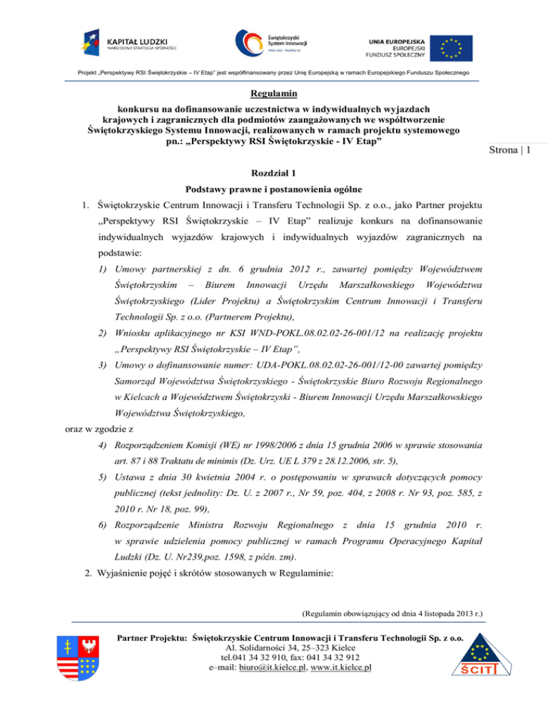 Projekt „Perspektywy RSI Świętokrzyskie – IV Etap” jest współfinansowany przez Unię Europejską w ramach Europejskiego Funduszu Społecznego Regulamin konkursu na dofinansowanie uczestnictwa w indywidualnych wyjazdach krajowych i zagranicznych dla podmiotów zaangażowanych we współtworzenie Świętokrzyskiego Systemu Innowacji, realizowanych w ramach projektu systemowego pn.: „Perspektywy RSI Świętokrzyskie - IV Etap” Rozdział 1 Podstawy prawne i postanowienia ogólne 1. Świętokrzyskie Centrum Innowacji i Transferu Technologii Sp. z o.o., jako Partner projektu „Perspektywy RSI Świętokrzyskie – IV Etap” realizuje konkurs na dofinansowanie indywidualnych wyjazdów krajowych i indywidualnych wyjazdów zagranicznych na podstawie: 1) Umowy partnerskiej z dn. 6 grudnia 2012 r., zawartej pomiędzy Województwem Świętokrzyskim – Biurem Innowacji Urzędu Marszałkowskiego Województwa Świętokrzyskiego (Lider Projektu) a Świętokrzyskim Centrum Innowacji i Transferu Technologii Sp. z o.o. (Partnerem Projektu), 2) Wniosku aplikacyjnego nr KSI WND-POKL.08.02.02-26-001/12 na realizację projektu „Perspektywy RSI Świętokrzyskie – IV Etap”, 3) Umowy o dofinansowanie numer: UDA-POKL.08.02.02-26-001/12-00 zawartej pomiędzy Samorząd Województwa Świętokrzyskiego - Świętokrzyskie Biuro Rozwoju Regionalnego w Kielcach a Województwem Świętokrzyski - Biurem Innowacji Urzędu Marszałkowskiego Województwa Świętokrzyskiego, oraz w zgodzie z 4) Rozporządzeniem Komisji (WE) nr 1998/2006 z dnia 15 grudnia 2006 w sprawie stosowania art. 87 i 88 Traktatu de minimis (Dz. Urz. UE L 379 z 28.12.2006, str. 5), 5) Ustawa z dnia 30 kwietnia 2004 r. o postępowaniu w sprawach dotyczących pomocy publicznej (tekst jednolity: Dz. U. z 2007 r., Nr 59, poz. 404, z 2008 r. Nr 93, poz. 585, z 2010 r. Nr 18, poz. 99), 6) Rozporządzenie Ministra Rozwoju Regionalnego z dnia 15 grudnia 2010 r. w sprawie udzielenia pomocy publicznej w ramach Programu Operacyjnego Kapitał Ludzki (Dz. U. Nr239,poz. 1598, z późn. zm). 2. Wyjaśnienie pojęć i skrótów stosowanych w Regulaminie: (Regulamin obowiązujący od dnia 4 listopada 2013 r.) Partner Projektu: Świętokrzyskie Centrum Innowacji i Transferu Technologii Sp. z o.o. Al. Solidarności 34, 25–323 Kielce tel.041 34 32 910, fax: 041 34 32 912 e–mail: [email protected], www.it.kielce.pl Strona | 1 Projekt „Perspektywy RSI Świętokrzyskie – IV Etap” jest współfinansowany przez Unię Europejską w ramach Europejskiego Funduszu Społecznego Projekt – projekt systemowy pn.: „Perspektywy RSI Świętokrzyskie – IV Etap”, finansowany z Europejskiego Funduszu Społecznego w ramach Programu Operacyjnego Kapitał Ludzki, Priorytet VIII Regionalne Kadry Gospodarki, Działania 8.2 Transfer wiedzy, Poddziałania 8.2.2 Regionalne Strategie Innowacji (Umowa nr: UDA-POKL.08.02.02-26-001/12-00), realizowany w okresie od 1.10.2012 r. do 30.06.2015 r. na terenie województwa świętokrzyskiego; Konkurs – procedura naboru wniosków zgłoszeniowych i wybór Beneficjentów indywidualnych wyjazdów krajowych i zagranicznych dofinansowanych w ramach projektu systemowego „Perspektywy RSI Świętokrzyskie – IV Etap”; Organizator konkursu – Świętokrzyskie Centrum Innowacji i Transferu Technologii Sp. z o.o., partner projektu systemowego „Perspektywy RSI Świętokrzyskie – IV Etap”; Indywidualny wyjazd krajowy - przedsięwzięcie zgłoszone w ramach konkursu i polegające między innymi na udziale w organizowanej na terenie Polski, wybranej konferencji, seminarium, spotkaniu eksperckim, spotkaniu informacyjnym, spotkaniu biznesowym, targach, służące w szczególności poszukiwaniu polskich rozwiązań wspierających rozwój kluczowych branż regionu, które zostały wskazane w dokumencie „Innowacyjne specjalizacje województwa świętokrzyskiego”, tworzeniu projektów biznesowych oraz nawiązaniu kontaktów biznesowych; Indywidualny wyjazd zagraniczny - przedsięwzięcie zgłoszone w ramach konkursu polegające między innymi na udziale w organizowanej poza obszarem Polski, wybranej konferencji, seminarium, spotkaniu eksperckim, spotkaniu informacyjnym, spotkaniu biznesowym, targach, służące w szczególności poszukiwaniu zagranicznych rozwiązań wspierających rozwój kluczowych branż regionu, które zostały wskazane w dokumencie „Innowacyjne specjalizacje województwa świętokrzyskiego”, (dostępny na stronie www.spinno.eu) tworzeniu projektów biznesowych oraz nawiązaniu kontaktów biznesowych; Wnioskodawca – uczestnik konkursu, ubiegający się o dofinansowanie indywidualnego wyjazdu krajowego lub zagranicznego, którym może być: a) Przedsiębiorca mikro, mały, średni definiowany zgodnie z zapisami Rozporządzenia Komisji (WE) Nr 800/2008 z dnia 6 sierpnia 2008 roku uznającym niektóre rodzaje pomocy za zgodne ze wspólnym rynkiem w zastosowaniu art. 87 i 88 Traktatu (WE); b) Instytucja otoczenia biznesu, tj. podmiot nie działający dla zysku lub przeznaczający zysk na cele statutowe, którego głównym celem funkcjonowania jest szeroko rozumiane (Regulamin obowiązujący od dnia 4 listopada 2013 r.) Partner Projektu: Świętokrzyskie Centrum Innowacji i Transferu Technologii Sp. z o.o. Al. Solidarności 34, 25–323 Kielce tel.041 34 32 910, fax: 041 34 32 912 e–mail: [email protected], www.it.kielce.pl Strona | 2 Projekt „Perspektywy RSI Świętokrzyskie – IV Etap” jest współfinansowany przez Unię Europejską w ramach Europejskiego Funduszu Społecznego wsparcie sektora przedsiębiorstw w prowadzeniu, aktywizacji, nawiązywaniu współpracy i dywersyfikacji rozwoju działalności gospodarczej na rynkach krajowym i zagranicznych oraz inwestowania w aktywa i rozwój kapitału ludzkiego; c) Uczelnia wyższa z regionu świętokrzyskiego; d) Jednostka naukowo – badawcza z regionu świętokrzyskiego. Strona | 3 Beneficjent – Wnioskodawca, który w wyniku rozstrzygnięcia ko