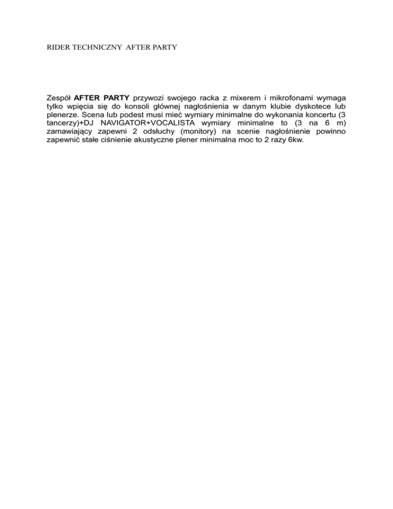 RIDER TECHNICZNY AFTER PARTY Zespół AFTER PARTY przywozi swojego racka z mixerem i mikrofonami wymaga tylko wpięcia się do konsoli głównej nagłośnienia w danym klubie dyskotece lub plenerze. Scena lub podest musi mieć wymiary minimalne do wykonania koncertu (3 tancerzy)+DJ NAVIGATOR+VOCALISTA wymiary minimalne to (3 na 6 m) zamawiający zapewni 2 odsłuchy (monitory) na scenie nagłośnienie powinno zapewnić stałe ciśnienie akustyczne plener minimalna moc to 2 razy 6kw. 1