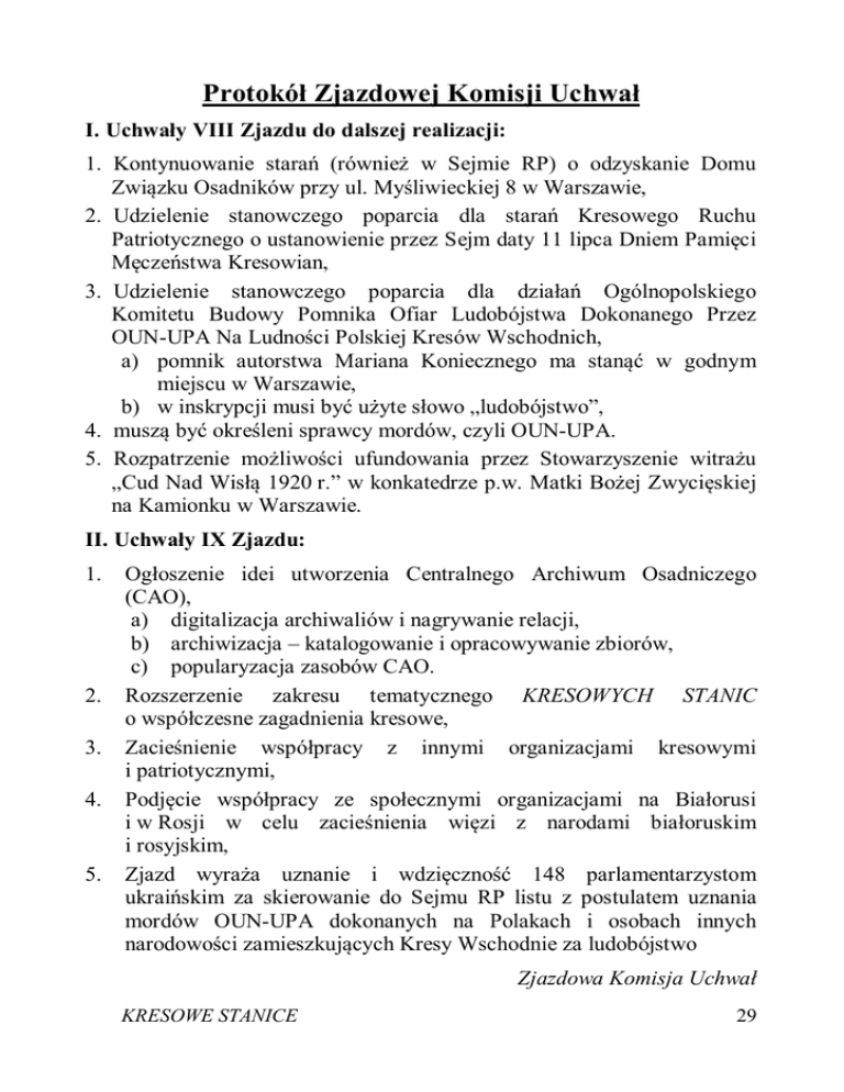 Protokół Zjazdowej Komisji Uchwał I. Uchwały VIII Zjazdu do dalszej realizacji: 1. Kontynuowanie starań (również w Sejmie RP) o odzyskanie Domu Związku Osadników przy ul. Myśliwieckiej 8 w Warszawie, 2. Udzielenie stanowczego poparcia dla starań Kresowego Ruchu Patriotycznego o ustanowienie przez Sejm daty 11 lipca Dniem Pamięci Męczeństwa Kresowian, 3. Udzielenie stanowczego poparcia dla działań Ogólnopolskiego Komitetu Budowy Pomnika Ofiar Ludobójstwa Dokonanego Przez OUN-UPA Na Ludności Polskiej Kresów Wschodnich, a) pomnik autorstwa Mariana Koniecznego ma stanąć w godnym miejscu w Warszawie, b) w inskrypcji musi być użyte słowo „ludobójstwo”, 4. muszą być określeni sprawcy mordów, czyli OUN-UPA. 5. Rozpatrzenie możliwości ufundowania przez Stowarzyszenie witrażu „Cud Nad Wisłą 1920 r.” w konkatedrze p.w. Matki Bożej Zwycięskiej na Kamionku w Warszawie. II. Uchwały IX Zjazdu: 1. 2. 3. 4. 5. Ogłoszenie idei utworzenia Centralnego Archiwum Osadniczego (CAO), a) digitalizacja archiwaliów i nagrywanie relacji, b) archiwizacja – katalogowanie i opracowywanie zbiorów, c) popularyzacja zasobów CAO. Rozszerzenie zakresu tematycznego KRESOWYCH STANIC o współczesne zagadnienia kresowe, Zacieśnienie współpracy z innymi organizacjami kresowymi i patriotycznymi, Podjęcie współpracy ze społecznymi organizacjami na Białorusi i w Rosji w celu zacieśnienia więzi z narodami białoruskim i rosyjskim, Zjazd wyraża uznanie i wdzięczność 148 parlamentarzystom ukraińskim za skierowanie do Sejmu RP listu z postulatem uznania mordów OUN-UPA dokonanych na Polakach i osobach innych narodowości zamieszkujących Kresy Wschodnie za ludobójstwo Zjazdowa Komisja Uchwał KRESOWE STANICE 29 Uczestnicy IX Zjazdu (31 VIII – 1 IX 2013 r.) Woj. białostockie Pow. Grodno 1. 2. 3. 4. 5. 6. 7. 8. 9. Dębska Bronisława z d. Zrębska os. Lerypol córka os. Polska Kaczanowska Irena z d. Tyburek os. Willa Nowa córka os. Polska Piwońska Krystyna z d. Kaczanowska os. Willa Nowa wnuczka Polska Piwońska Kalina os. Willa Nowa prawnuczka Polska Szuba Janusz os. Budowla wnuk Polska Trąbska Zofia zaścianek Strupino synowa Polska Trąbski Tadeusz zaścianek Strupino syn Polska Zarębski Zygmunt os. Lerypol syn Polska Skarżyński Czesław os. Martowo wnuk Polska Pow. Wołkowysk 10. 11. 12. 13. Kacpura Bożenna Horodek Jolanta Engler Stanisław Sass Krystyna z d. Zienkiewicz os. Pieniuga os. Ostrów os. Ostrów os. Nowosiółki bratanica Polska wnuczka Polska prawnuk Polska córka W. Brytania Woj. lwowskie Pow. Bobrka 14. Gwazdacz Edward os. Kabarowce syn Polska Woj. nowogródzkie Pow. Baranowicze 15. 16. 17. 18. 19. Czyżewicz Czesław Haciski Wiesław Muszyńska Wanda Pawłowska Zofia Adamuszek Jerzy os. Horodyszcze os. Stołowicze os. Zosin os. Stołowicze os. Zosin syn syn wnuczka córka Polska Polska Kanada Polska Polska Pow. Lida 20. Głuszek Krystyna z d. Toboła 21. Siemiątkowski Bolesław 22. Siemiątkowska Anna 30 os. Nieciecz córka Polska os. Aksamitowszczyzna syn Polska os. Aksamitowszczyzna wnuczka Polska KRESOWE STANICE Msza św. w Sanktuarium Matki Bożej Zwycięskiej na Kamionku Pow. Nieśwież 23. Rudziński Jan 24. Szpunar Janusz 25. Wierzbicki Wacław os. Narucewicze os. Malawszczyzna os. Kuchczyce wnuk wnuk syn Polska Polska USA Pow. Nowogródek 26. 27. 28. 29. 30. 31. 32. 33. Kot Jadwiga z d. Polkowska Kułakowski Tadeusz Kostro Wanda Powroźnik Barbara Karaś Maria Łopata Jan Michalczyk Marek Włodarski Józef os. Delatycze córka Polska os. Wielmowo syn Polska os Zajelnia synowa Polska os. Międzygórze córka Polska os. Międzygórze Polska os Burdygowszczyzna syn W. Brytania os. Burdygowszczyzna syn Polska os. Puzieniewicze syn Polska Pow. Wołożyn 34. Benhard Antoni KRESOWE STANICE os. Skrzypliwo syn Polska 31 Woj. poleskie Pow. Brześć n/Bugiem 35. 36. 37. 38. Łysy Łucja Helena Deląg Grażyna Deląg Marta Wojnas Dorota os. Zbunin os. Zbunin os. Zbunin os. Zbunin córka wnuczka prawnuczka prawnuczka Polska Polska Polska Polska wnuk Polska Pow. Drohiczyn Pol. 39. Jankowski Tadeusz os. Karłowicze Pow. Prużana 40. Kędzia Joanna z d. Dedejczyk-Macielińska os. Laskowice Wielkie córka Polska Woj. tarnopolskie Pow. Pohajce 41. Roźnicki Stanisław os Ogińskiego syn Kanada Woj. wileńskie Pow. Oszmiana 42. Łazarska Alicja z d. Kupczołojć 43. Wyrwa Regina 44. Zagrobelny Jan os. Nowopole os. Antonowo os. Antonowo córka córka Polska Polska Polska Woj. wołyńskie Pow. Dubno 45. 46. 47. 48. 49. 50. 32 Dobosz Henryka Kozaczuk Leokadia z d. Dobosz Siemiginowska Wanda z d. Peszek Biedrzycka Bożena Kopczyńska Krystyna Wójcik Mieczysław os. Wola Piłsudskiego córka os. Wola Piłsudskiego córka os. Bortnica córka os. Bortnica wnuczka os. Bortnica wnuczka os. Radziwiłłów bratanek Polska Polska Polska Polska Polska Polska KRESOWE STANICE Uroczystości przy pomniku „W Hołdzie Osadnikom Wojskowym Kresów Wschodnich” Pow. Horochów 51. Kornecka Józefa z d. Czaja 52. Szynczyszyn Kazimiera os. Płaszów os. Płaszów córka córka Polska Polska Pow. Krzemieniec 53. 54. 55. 56. 57. 58. 59. Niedzielski Piotr Grobelska Agnieszka Gałczyńska Beata Grobelski Dariusz Walicka Bagniewska Ksenia Radomińska Julita Szreffel Zofia os. Weteranówka prawnuk os. Weteranówka wnuczka os. Weteranówka żona wnuczka os. Weteranówka mąż wnuczki os. Orłopol wnuczka os. Orłopol wnuczka os. Orłopol córka Polska Polska Polska Polska Polska Polska Polska os. Mylsk os. Mylsk os. Piastów Polska Polska Polska Pow. Łuck 60. Misztak Mirosław 61. Misztak Wincenty 62. Kaczmarek Stanisław KRESOWE STANICE syn syn syn 33 Przy pomniku „Poległym i Pomordowanym na Wschodzie” 63. Jankowska Rozalia os. Piastów Polska Pow. Równe 64. 65. 66. 67. 68. 69. 70. 71. 72. 73. 74. 75. 76. 77. 78. 79. 80. 34 Bronowicki Michał Grzybowska Czesława Grzybowski Ryszard Górczak-Mechlińska Maria Mechlińska Anna Dobek Halina Dobek Mieczysław Jankowska Tere
