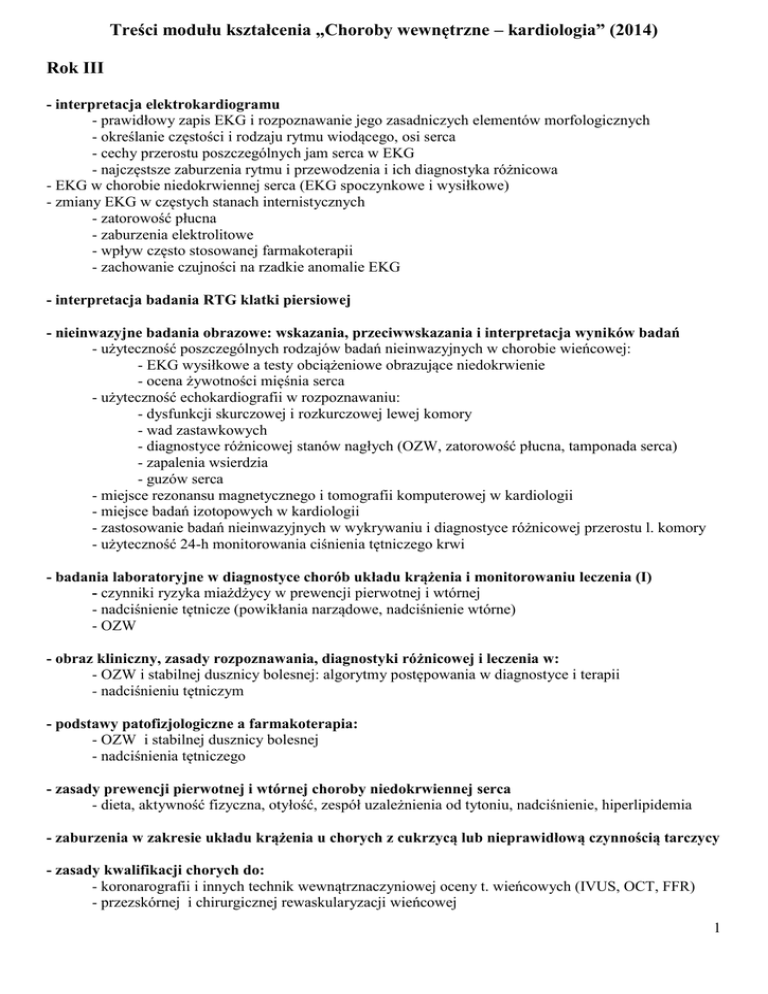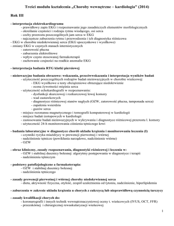 Treści modułu kształcenia „Choroby wewnętrzne – kardiologia” (2014) Rok III - interpretacja elektrokardiogramu - prawidłowy zapis EKG i rozpoznawanie jego zasadniczych elementów morfologicznych - określanie częstości i rodzaju rytmu wiodącego, osi serca - cechy przerostu poszczególnych jam serca w EKG - najczęstsze zaburzenia rytmu i przewodzenia i ich diagnostyka różnicowa - EKG w chorobie niedokrwiennej serca (EKG spoczynkowe i wysiłkowe) - zmiany EKG w częstych stanach internistycznych - zatorowość płucna - zaburzenia elektrolitowe - wpływ często stosowanej farmakoterapii - zachowanie czujności na rzadkie anomalie EKG - interpretacja badania RTG klatki piersiowej - nieinwazyjne badania obrazowe: wskazania, przeciwwskazania i interpretacja wyników badań - użyteczność poszczególnych rodzajów badań nieinwazyjnych w chorobie wieńcowej: - EKG wysiłkowe a testy obciążeniowe obrazujące niedokrwienie - ocena żywotności mięśnia serca - użyteczność echokardiografii w rozpoznawaniu: - dysfunkcji skurczowej i rozkurczowej lewej komory - wad zastawkowych - diagnostyce różnicowej stanów nagłych (OZW, zatorowość płucna, tamponada serca) - zapalenia wsierdzia - guzów serca - miejsce rezonansu magnetycznego i tomografii komputerowej w kardiologii - miejsce badań izotopowych w kardiologii - zastosowanie badań nieinwazyjnych w wykrywaniu i diagnostyce różnicowej przerostu l. komory - użyteczność 24-h monitorowania ciśnienia tętniczego krwi - badania laboratoryjne w diagnostyce chorób układu krążenia i monitorowaniu leczenia (I) - czynniki ryzyka miażdżycy w prewencji pierwotnej i wtórnej - nadciśnienie tętnicze (powikłania narządowe, nadciśnienie wtórne) - OZW - obraz kliniczny, zasady rozpoznawania, diagnostyki różnicowej i leczenia w: - OZW i stabilnej dusznicy bolesnej: algorytmy postępowania w diagnostyce i terapii - nadciśnieniu tętniczym - podstawy patofizjologiczne a farmakoterapia: - OZW i stabilnej dusznicy bolesnej - nadciśnienia tętniczego - zasady prewencji pierwotnej i wtórnej choroby niedokrwiennej serca - dieta, aktywność fizyczna, otyłość, zespół uzależnienia od tytoniu, nadciśnienie, hiperlipidemia - zaburzenia w zakresie układu krążenia u chorych z cukrzycą lub nieprawidłową czynnością tarczycy - zasady kwalifikacji chorych do: - koronarografii i innych technik wewnątrznaczyniowej oceny t. wieńcowych (IVUS, OCT, FFR) - przezskórnej i chirurgicznej rewaskularyzacji wieńcowej 1 Rok IV - postępowanie w nagłym zatrzymaniu krążenia - zasady prewencji pierwotnej i wtórnej nagłej śmierci sercowej - wskazania do i szczegółowe postępowanie w kardiowersji elektrycznej / farmakologicznej - wskazania do sztucznej stymulacji serca i wszczepienia ICD - wskazania i podstawowe zasady interpretacji badania elektrofizjologicznego (EPS) - podstawy interpretacji EKG u chorego ze sztucznym stymulatorem serca - użyteczność monitorowania EKG metodą Holtera w praktyce kardiologicznej - badania laboratoryjne w diagnostyce chorób układu krążenia i monitorowaniu leczenia (II) - ostra i przewlekła niewydolność serca - obraz kliniczny, zasady rozpoznawania, diagnostyki różnicowej i leczenia w następujących jednostkach chorobowych: - niewydolność serca (ostra i przewlekła) - cor pulmonale - zatorowość płucna - migotanie i trzepotanie przedsionków - częstoskurcze z szerokimi i wąskimi zespołami QRS - podstawy patofizjologiczne a farmakoterapia: - niewydolności serca - migotania i trzepotania przedsionków - częstoskurczów z szerokimi i wąskimi zespołami QRS - zasady leczenia przeciwzakrzepowego i przeciwpłytkowego: - heparyny - antagoniści witaminy K - nowe leki przeciwzakrzepowe - aspiryna i antagoniści receptora P2Y12 - kojarzenie wzajemne leków przeciwpłytkowych oraz z lekami przeciwkrzepliwymi - zasady kwalifikacji chorych do: - terapii resynchronizacyjnej ± ICD - wspomagania czynności lewej komory - transplantacji serca - zasady kwalifikacji chorych do ablacji przezskórnej: - w częstoskurczach nadkomorowych - drogi dodatkowej (AVRT) i drogi wolnej (AVNRT) - w trzepotaniu przedsionków - cieśni trójdzielno-żylnej - w migotaniu przedsionków - okrążającej ujścia żył płucnych i łącza AV - komorowego ogniska arytmii 2 Rok V - obraz kliniczny, zasady rozpoznawania, diagnostyki różnicowej i leczenia w następujących jednostkach chorobowych: - najczęstsze wrodzone i nabyte wady serca - nadciśnienie płucne z uwzględnieniem aktualnego podziału - zapalenie mięśnia serca, wsierdzia i osierdzia - kardiomiopatie ze szczególnym uwzględnieniem najczęstszych przyczyn - tętniak rozwarstwiający aorty - omdlenia - zasady kwalifikacji chorych do: - zabiegów kardiochirurgicznych w najczęstszych nabytych i wrodzonych wadach serca - TAVI, przezskórnej walwuloplastyki mitralnej, Mitra-Clip - przezskórnego zamykania ubytków w przegrodach serca (PFO, ASD, VSD) - zaburzenia w zakresie układu krążenia u chorych z: - niewydolnością nerek - chorobami tkanki łącznej - wpływ leków niekardiologicznych na układ krążenia - NLPZ - glikokortykosteroidy - leki onkologiczne - odrębności farmakoterapii chorób układu krążenia u chorych w podeszłym wieku - wskazania do angiografii aorty i tętnic obwodowych - chory kardiologiczny z zaawansowaną miażdżycą tętnic obwodowych – specyfika problemu - zasady kwalifikacji kardiologicznej oraz przygotowania chorych do zabiegów pozasercowych - zasady postępowania u kobiet w ciąży ze schorzeniami kardiologicznymi - zasady postępowania z dorosłymi chorymi z wrodzoną wadą serca - zmiany w zakresie układu krążenia stwierdzane u osób uprawiających sport 3 Rok VI w ramach praktycznego nauczania klinicznego (ekwiwalent stażu podyplomowego) - powtórzenie i zastosowanie w praktyce głównych zasad postępowania na podstawie aktualnych wytycznych Towarzystw Kardiologicznych w następujących schor