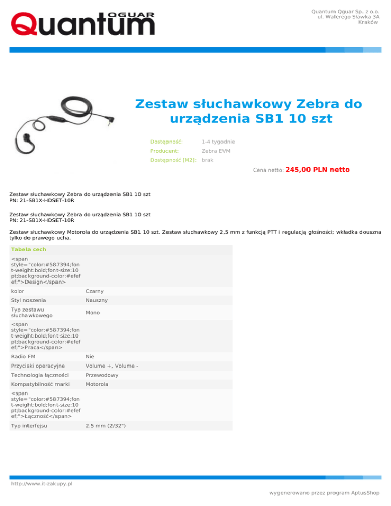 Quantum Qguar Sp. z o.o. ul. Walerego Sławka 3A Kraków Zestaw słuchawkowy Zebra do urządzenia SB1 10 szt Dostępność: 1-4 tygodnie Producent: Zebra EVM Dostępność [M2]: brak Cena netto: 245,00 PLN netto Zestaw słuchawkowy Zebra do urządzenia SB1 10 szt PN: 21-SB1X-HDSET-10R Zestaw słuchawkowy Zebra do urządzenia SB1 10 szt PN: 21-SB1X-HDSET-10R Zestaw słuchawkowy Motorola do urządzenia SB1 10 szt. Zestaw słuchawkowy 2,5 mm z funkcją PTT i regulacją głośności; wkładka douszna tylko do prawego ucha. Tabela cech <span style="color:#587394;fon t-weight:bold;font-size:10 pt;background-color:#efef ef;">Design</span> kolor Czarny Styl noszenia Nauszny Typ zestawu słuchawkowego Mono <span style="color:#587394;fon t-weight:bold;font-size:10 pt;background-color:#efef ef;">Praca</span> Radio FM Nie Przyciski operacyjne Volume +, Volume - Technologia łączności Przewodowy Kompatybilność marki Motorola <span style="color:#587394;fon t-weight:bold;font-size:10 pt;background-color:#efef ef;">Łączność</span> Typ interfejsu 2.5 mm (2/32") http://www.it-zakupy.pl wygenerowano przez program AptusShop Quantum Qguar Sp. z o.o. ul. Walerego Sławka 3A Kraków <span style="color:#587394;fon t-weight:bold;font-size:10 pt;background-color:#efef ef;">Zestaw słuchawkowy</span> Złączka rurowa Intrafonetyczny <span style="color:#587394;fon t-weight:bold;font-size:10 pt;background-color:#efef ef;">Pakowanie danych</span> Liczba dołączonych produktów 10 szt. <span style="color:#587394;fon t-weight:bold;font-size:10 pt;background-color:#efef ef;">Pozostałe właściwości</span> Obsługiwane produkty Motorola SB1 Głośnik Nie http://www.it-zakupy.pl wygenerowano przez program AptusShop