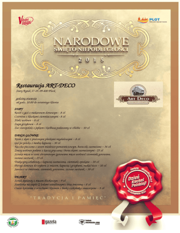 Restauracja ART-DECO Stary Rynek 17-19, 09-400 Płock godziny otwarcia od godz. 10.00 do ostatniego klienta ZUPY Rosół z gęsi z makaronem domowym - 8 zł Czernina z kluskami ziemniaczanymi - 8 zł Flaki wołowe – 8 zł Zupa grzybowa – 8 zł Żur staropolski z jajkiem i kiełbasą podawany w chlebie – 10 zł DANIA GŁÓWNE Krem z dyni z prażonymi płatkami migdałowymi – 8 zł Gęś po polsku z modrą kapustą – 30 zł Kaczka pieczona z sosem miodowo-pomarańczowym, buraczki zasmażane – 36 zł Zrazy wołowe podane z kaszą gryczaną i buraczkami zasmażanymi - 25 zł Sztuka mięsa w sosie chrzanowym (gotowane mięso wołowe) ziemniaki gotowane, zestaw surówek – 25 zł Tradycyjny schabowy z kapustą zasmażaną, ziemniaki opiekane – 20 zł Pierogi domowe do wyboru (z mięsem, kapustą i grzybami, ruskie) 6szt – 10 zł Sandacz w śmietanie, ziemniaki gotowane, zestaw surówek – 30 zł DESERY Sernik dyniowy z musem śliwkowym – 9 zł Szarlotka na ciepło Z lodami waniliowymi i bitą śmietaną – 8 zł Ciasto korzenne z orzechami i kremem z białej czekolady i mascarpone – 9 zł