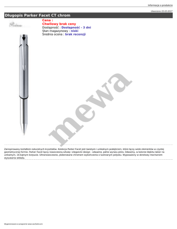 Informacje o produkcie Utworzono 03-03-2017 Długopis Parker Facet CT chrom Cena : Chwilowy brak ceny m ew a Dostępność : Dostępność - 3 dni Stan magazynowy : niski Średnia ocena : brak recenzji Zainspirowany kształtem naturalnych kryształów. Kolekcja Parker Facet jest świeżym i unikalnym podejściem, które łączy wiele elementów w czystej geometrycznej formie. Parker Facet łączy nowoczesną sztukę i elegancki design - odważne, pełne wyrazu pióra. Odważny, w kolorze błękitu lakier na unikalnym, 16-kątnym korpusie. Ultranowoczesne, platerowane chromem wykończenia o lustrzanym połysku. Wyposażony w obrotowy mechanizm wysuwania wkładu. Wygenerowano w programie www.oscGold.com