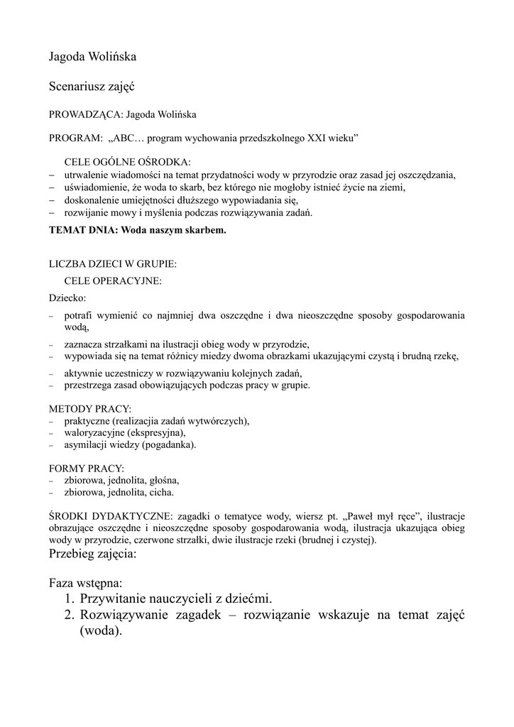 Jagoda Wolińska Scenariusz zajęć PROWADZĄCA: Jagoda Wolińska PROGRAM: „ABC… program wychowania przedszkolnego XXI wieku” − − − − CELE OGÓLNE OŚRODKA: utrwalenie wiadomości na temat przydatności wody w przyrodzie oraz zasad jej oszczędzania, uświadomienie, Ŝe woda to skarb, bez którego nie mogłoby istnieć Ŝycie na ziemi, doskonalenie umiejętności dłuŜszego wypowiadania się, rozwijanie mowy i myślenia podczas rozwiązywania zadań. TEMAT DNIA: Woda naszym skarbem. LICZBA DZIECI W GRUPIE: CELE OPERACYJNE: Dziecko: − potrafi wymienić co najmniej dwa oszczędne i dwa nieoszczędne sposoby gospodarowania wodą, − zaznacza strzałkami na ilustracji obieg wody w przyrodzie, wypowiada się na temat róŜnicy miedzy dwoma obrazkami ukazującymi czystą i brudną rzekę, − − − aktywnie uczestniczy w rozwiązywaniu kolejnych zadań, przestrzega zasad obowiązujących podczas pracy w grupie. METODY PRACY: − praktyczne (realizacjia zadań wytwórczych), − waloryzacyjne (ekspresyjna), − asymilacji wiedzy (pogadanka). FORMY PRACY: − zbiorowa, jednolita, głośna, − zbiorowa, jednolita, cicha. ŚRODKI DYDAKTYCZNE: zagadki o tematyce wody, wiersz pt. „Paweł mył ręce”, ilustracje obrazujące oszczędne i nieoszczędne sposoby gospodarowania wodą, ilustracja ukazująca obieg wody w przyrodzie, czerwone strzałki, dwie ilustracje rzeki (brudnej i czystej). Przebieg zajęcia: Faza wstępna: 1. Przywitanie nauczycieli z dziećmi. 2. Rozwiązywanie zagadek – rozwiązanie wskazuje na temat zajęć (woda). Faza zasadnicza: 1. Nauczyciel prezentuje uczniom ilustracje obrazujące oszczędne oraz nieoszczędne sposoby gospodarowania wodą. Uczniowie opisują co przedstawia ilustracja, następnie przyporządkowują ilustracje do dwóch grup (oszczędne i nieoszczędne gospodarowanie wodą). 2. Praca plastyczna. Nauczyciel prezentuje dzieciom ilustrację obrazującą obieg wody w przyrodzie, tłumaczy na czym polega obieg. Następnie uczniowie samodzielnie przyklejają strzałki w odpowiednich miejscach na rysunkach i kolorują prace. 3. Uczniowie wypowiadają się na temat róŜnicy między dwoma obrazkami ukazującymi czystą i brudną rzekę. Wskazują jakie zachowania ludzi mogą powodować zanieczyszczenia rzek, jezior i mórz. Faza końcowa: 1. Prowadząca ocenia pracę dzieci na zajęciu. 2. Zakończenie zajęcia wierszem pt. „Paweł mył ręce”. Wiersz pt. „Paweł mył ręce” (znalezione w zasobach Internetu) Paweł mył ręce i nie zakręcił wody w łazience. Kapie, kapie woda, wody bardzo szkoda. Nie moŜna marnować wody, lepiej z niej zrobić lody. MoŜna nią podlać kwiatki, strzelać z wodnej armatki. Napoić moŜna pieska, wykąpie się Tereska. Mama zrobi pranie, będzie czyste ubranie, weźmie prysznic dla ochłody, nie moŜna marnować wody! Zagadki: SłuŜy do mycia , słuŜy do picia Bez niej na Ziemi nie byłoby Ŝycia. (woda) Chłodzi nas, myje nas, poi ludzi, pole, las. (woda) Cieszy się gleba, gdy on spada z nieba. (deszcz) Konewki mu nie trzeba, a podlewa kwiaty, warzywa i drzewa. (deszcz) Co tak wygląd zmieniać moŜe: gdy jej duŜo - zwie się morzem, a gdy ilość jest niewielka - to jest kropla lub kropelka. (woda) Gdy jest ciepło wtedy płynie, a na lód twardnieje w zimie. (woda) Spogląda z wysoka na kurki, na wannę, gdy go uŜywasz, udaje fontannę. (prysznic)