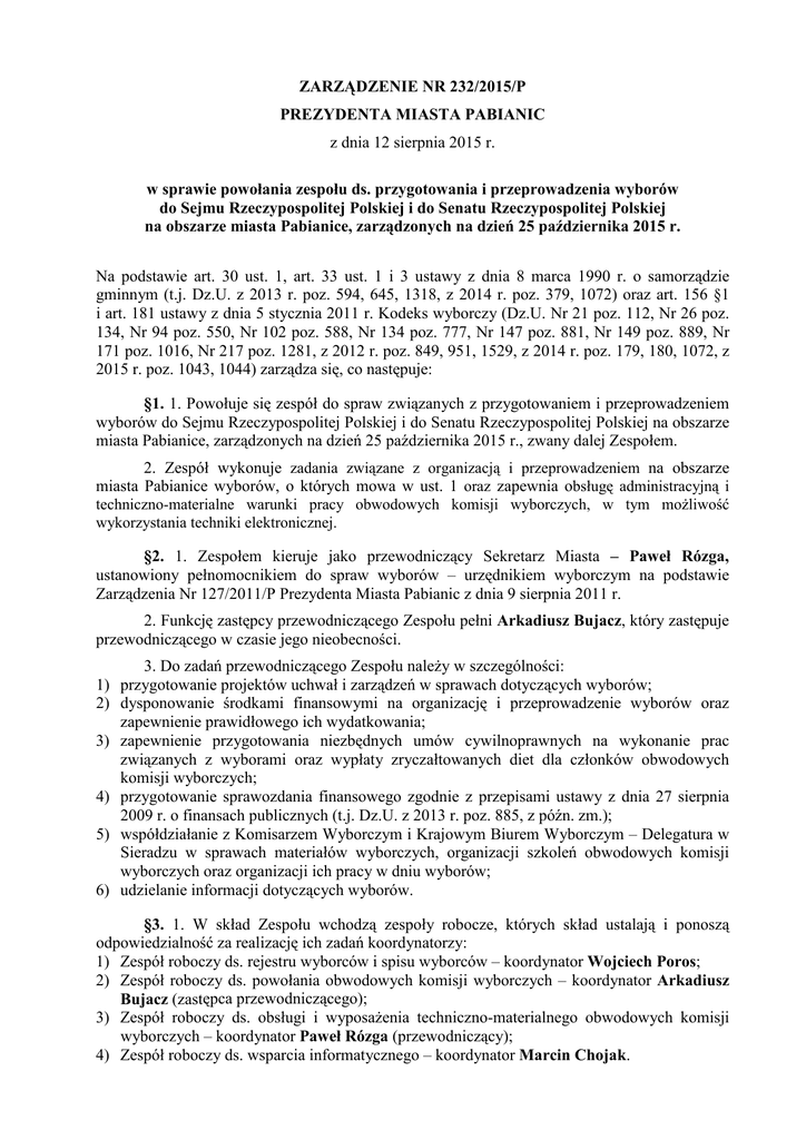 ZARZĄDZENIE NR 232/2015/P PREZYDENTA MIASTA PABIANIC z dnia 12 sierpnia 2015 r. w sprawie powołania zespołu ds. przygotowania i przeprowadzenia wyborów do Sejmu Rzeczypospolitej Polskiej i do Senatu Rzeczypospolitej Polskiej na obszarze miasta Pabianice, zarządzonych na dzień 25 października 2015 r. Na podstawie art. 30 ust. 1, art. 33 ust. 1 i 3 ustawy z dnia 8 marca 1990 r. o samorządzie gminnym (t.j. Dz.U. z 2013 r. poz. 594, 645, 1318, z 2014 r. poz. 379, 1072) oraz art. 156 §1 i art. 181 ustawy z dnia 5 stycznia 2011 r. Kodeks wyborczy (Dz.U. Nr 21 poz. 112, Nr 26 poz. 134, Nr 94 poz. 550, Nr 102 poz. 588, Nr 134 poz. 777, Nr 147 poz. 881, Nr 149 poz. 889, Nr 171 poz. 1016, Nr 217 poz. 1281, z 2012 r. poz. 849, 951, 1529, z 2014 r. poz. 179, 180, 1072, z 2015 r. poz. 1043, 1044) zarządza się, co następuje: §1. 1. Powołuje się zespół do spraw związanych z przygotowaniem i przeprowadzeniem wyborów do Sejmu Rzeczypospolitej Polskiej i do Senatu Rzeczypospolitej Polskiej na obszarze miasta Pabianice, zarządzonych na dzień 25 października 2015 r., zwany dalej Zespołem. 2. Zespół wykonuje zadania związane z organizacją i przeprowadzeniem na obszarze miasta Pabianice wyborów, o których mowa w ust. 1 oraz zapewnia obsługę administracyjną i techniczno-materialne warunki pracy obwodowych komisji wyborczych, w tym możliwość wykorzystania techniki elektronicznej. §2. 1. Zespołem kieruje jako przewodniczący Sekretarz Miasta – Paweł Rózga, ustanowiony pełnomocnikiem do spraw wyborów – urzędnikiem wyborczym na podstawie Zarządzenia Nr 127/2011/P Prezydenta Miasta Pabianic z dnia 9 sierpnia 2011 r. 2. Funkcję zastępcy przewodniczącego Zespołu pełni Arkadiusz Bujacz, który zastępuje przewodniczącego w czasie jego nieobecności. 1) 2) 3) 4) 5) 6) 3. Do zadań przewodniczącego Zespołu należy w szczególności: przygotowanie projektów uchwał i zarządzeń w sprawach dotyczących wyborów; dysponowanie środkami finansowymi na organizację i przeprowadzenie wyborów oraz zapewnienie prawidłowego ich wydatkowania; zapewnienie przygotowania niezbędnych umów cywilnoprawnych na wykonanie prac związanych z wyborami oraz wypłaty zryczałtowanych diet dla członków obwodowych komisji wyborczych; przygotowanie sprawozdania finansowego zgodnie z przepisami ustawy z dnia 27 sierpnia 2009 r. o finansach publicznych (t.j. Dz.U. z 2013 r. poz. 885, z późn. zm.); współdziałanie z Komisarzem Wyborczym i Krajowym Biurem Wyborczym – Delegatura w Sieradzu w sprawach materiałów wyborczych, organizacji szkoleń obwodowych komisji wyborczych oraz organizacji ich pracy w dniu wyborów; udzielanie informacji dotyczących wyborów. §3. 1. W skład Zespołu wchodzą zespoły robocze, których skład ustalają i ponoszą odpowiedzialność za realizację ich zadań koordynatorzy: 1) Zespół roboczy ds. rejestru wyborców i spisu wyborców – koordynator Wojciech Poros; 2) Zespół roboczy ds. powołania obwodowych komisji wyborczych – koordynator Arkadiusz Bujacz (zastępca przewodniczącego); 3) Zespół roboczy ds. obsługi i wyposażenia techniczno-materialnego obwodowych komisji wyborczych – koordynator Paweł Rózga (przewodniczący); 4) Zespół roboczy ds. wsparcia informatycznego – koordynator Marcin Chojak. 2. Do zadań zespołu roboczego ds. rejestru wyborców i spisów wyborców należy w szczególności: 1) prowadzenie i aktualizacja rejestru wyborców; 2) sporządzenie i aktualizacja spisów wyborców; 3) rozpatrywanie reklamacji na nieprawidłowości w rejestrze wyborców i spisie wyborców; 4) powiadomienie wyborców o sporządzeniu spisu wyborców i udostępnianie spisów wyborców; 5) przekazywanie informacji o wyborach wyborcom niepełnosprawnym; 6) wydawanie zaświadczeń o prawie do głosowania; 7) sporządzanie pełnomocnictwa do głosowania; 8) przyjmowanie zgłoszeń do głosowania korespondencyjnego i doręczanie pakietu wyborczego. 3. Do zadań zespołu roboczego ds. powołania obwodowych komisji wyborczych należy w szczególności: 1) przyjmowanie zgłoszeń do obwodowych komisji wyborczych; 2) sporządzanie wykazu kandydatów zgłaszanych do obwodowych komisji wyborczych; 3) przygotowanie losowania składów oraz uzupełnienia składów obwodowych komisji wyborczych; 4) zorganizowanie pierwszego posiedzenia obwodowych komisji wyborczych. 4. Do zadań zespołu roboczego ds. obsługi i wyposażenia techniczno-materialnego obwodowych komisji wyborczych należy w szczególności: 1) zapewnienie miejsc na bezpłatne umieszczanie urzędowych obwieszczeń wyborczych i plakatów komitetów wyborczych; 2) rozplakatowanie urzędowych obwieszczeń, w szczególności o okręgach wyborczych oraz o zarejestrowanych listach kandydatów na posłów i senatorów; 3) wykonanie i rozplakatowanie urzędowych obwieszczeń o obwodach głosowania, 4) dostarczenie kart do głosowania obwodowym komisjom wyborczym; 5) wyposażenie lokali wyborczych w niezbędny sprzęt i materiały; 6) przyjmowanie w depozyt dokumentów z głosowania i pieczęci obwodowych komisji wyborczych; 7) archiwizacja dokumentacji wyborczej. 5. Do zadań zespołu roboczego ds. wsparcia informatycznego należy w szczególności: 1) zamieszczanie obwieszczeń i innych informacji wyborczych w Biuletynie Informacji Publicznej; 2) organizacja informatycznej obsługi prac związanych z wyborami; 3) przeprowadzenie szkolenia osób, które będą wykonywały obsługę informatyczną obwodowych komisji wyborczych; 4) zapewnienie utrzymania bieżącego kontaktu i współpraca z operatorami obwodowych komisji wyborczych; 5) współdziałanie z Krajowym Biurem Wyborczym – Delegaturą w Sieradzu w sprawach przeprowadzenia testów programu informatycznego w zakresie wprowadzenia treści protokołów obwodowych komisji wyborczych na platformę wyborczą. §4. Osobom wykonującym zadania wyborcze przysługuje wynagrodzenie określone w zawartych umowach cywilnoprawnych, płatne ze ś