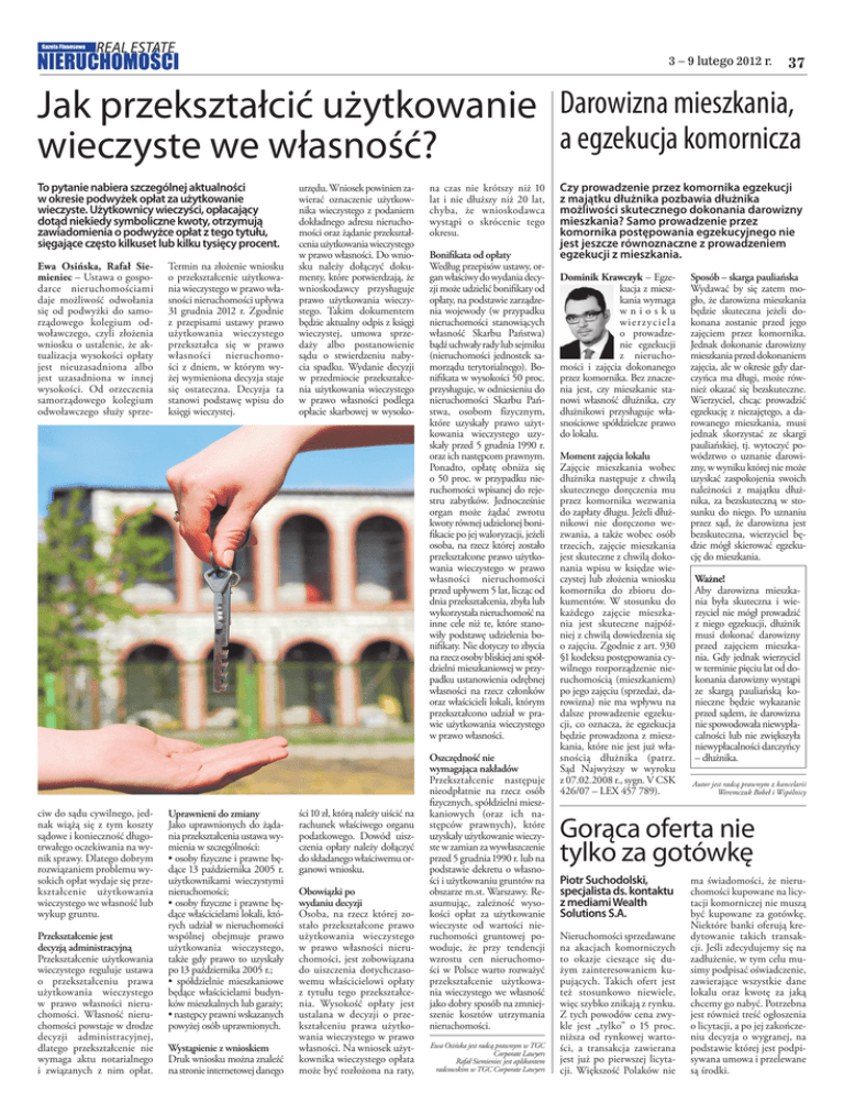 Gazeta Finansowa 3 – 9 lutego 2012 r. 37 Jak przekształcić użytkowanie Darowizna mieszkania, a egzekucja komornicza wieczyste we własność? To pytanie nabiera szczególnej aktualności w okresie podwyżek opłat za użytkowanie wieczyste. Użytkownicy wieczyści, opłacający dotąd niekiedy symboliczne kwoty, otrzymują zawiadomienia o podwyżce opłat z tego tytułu, sięgające często kilkuset lub kilku tysięcy procent. Ewa Osińska, Rafał Siemieniec – Ustawa o gospodarce nieruchomościami daje możliwość odwołania się od podwyżki do samorządowego kolegium odwoławczego, czyli złożenia wniosku o ustalenie, że aktualizacja wysokości opłaty jest nieuzasadniona albo jest uzasadniona w innej wysokości. Od orzeczenia samorządowego kolegium odwoławczego służy sprze- ciw do sądu cywilnego, jednak wiążą się z tym koszty sądowe i konieczność długotrwałego oczekiwania na wynik sprawy. Dlatego dobrym rozwiązaniem problemu wysokich opłat wydaje się przekształcenie użytkowania wieczystego we własność lub wykup gruntu. Przekształcenie jest decyzją administracyjną Przekształcenie użytkowania wieczystego reguluje ustawa o przekształceniu prawa użytkowania wieczystego w prawo własności nieruchomości. Własność nieruchomości powstaje w drodze decyzji administracyjnej, dlatego przekształcenie nie wymaga aktu notarialnego i związanych z nim opłat. Termin na złożenie wniosku o przekształcenie użytkowania wieczystego w prawo własności nieruchomości upływa grudnia r. Zgodnie z przepisami ustawy prawo użytkowania wieczystego przekształca się w prawo własności nieruchomości z dniem, w którym wyżej wymieniona decyzja staje się ostateczna. Decyzja ta stanowi podstawę wpisu do księgi wieczystej. Uprawnieni do zmiany Jako uprawnionych do żądania przekształcenia ustawa wymienia w szczególności: • osoby fizyczne i prawne będące października r. użytkownikami wieczystymi nieruchomości; • osoby fizyczne i prawne będące właścicielami lokali, których udział w nieruchomości wspólnej obejmuje prawo użytkowania wieczystego, także gdy prawo to uzyskały po października r.; • spółdzielnie mieszkaniowe będące właścicielami budynków mieszkalnych lub garaży; • następcy prawni wskazanych powyżej osób uprawnionych. Wystąpienie z wnioskiem Druk wniosku można znaleźć na stronie internetowej danego urzędu. Wniosek powinien zawierać oznaczenie użytkownika wieczystego z podaniem dokładnego adresu nieruchomości oraz żądanie przekształcenia użytkowania wieczystego w prawo własności. Do wniosku należy dołączyć dokumenty, które potwierdzają, że wnioskodawcy przysługuje prawo użytkowania wieczystego. Takim dokumentem będzie aktualny odpis z księgi wieczystej, umowa sprzedaży albo postanowienie sądu o stwierdzeniu nabycia spadku. Wydanie decyzji w przedmiocie przekształcenia użytkowania wieczystego w prawo własności podlega opłacie skarbowej w wysoko- ści zł, którą należy uiścić na rachunek właściwego organu podatkowego. Dowód uiszczenia opłaty należy dołączyć do składanego właściwemu organowi wniosku. Obowiązki po wydaniu decyzji Osoba, na rzecz której zostało przekształcone prawo użytkowania wieczystego w prawo własności nieruchomości, jest zobowiązana do uiszczenia dotychczasowemu właścicielowi opłaty z tytułu tego przekształcenia. Wysokość opłaty jest ustalana w decyzji o przekształceniu prawa użytkowania wieczystego w prawo własności. Na wniosek użytkownika wieczystego opłata może być rozłożona na raty, na czas nie krótszy niż lat i nie dłuższy niż lat, chyba, że wnioskodawca wystąpi o skrócenie tego okresu. Bonifikata od opłaty Według przepisów ustawy, organ właściwy do wydania decyzji może udzielić bonifikaty od opłaty, na podstawie zarządzenia wojewody (w przypadku nieruchomości stanowiących własność Skarbu Państwa) bądź uchwały rady lub sejmiku (nieruchomości jednostek samorządu terytorialnego). Bonifikata w wysokości proc. przysługuje, w odniesieniu do nieruchomości Skarbu Państwa, osobom fizycznym, które uzyskały prawo użytkowania wieczystego uzyskały przed grudnia r. oraz ich następcom prawnym. Ponadto, opłatę obniża się o proc. w przypadku nieruchomości wpisanej do rejestru zabytków. Jednocześnie organ może żądać zwrotu kwoty równej udzielonej bonifikacie po jej waloryzacji, jeżeli osoba, na rzecz której zostało przekształcone prawo użytkowania wieczystego w prawo własności nieruchomości przed upływem lat, licząc od dnia przekształcenia, zbyła lub wykorzystała nieruchomość na inne cele niż te, które stanowiły podstawę udzielenia bonifikaty. Nie dotyczy to zbycia na rzecz osoby bliskiej ani spółdzielni mieszkaniowej w przypadku ustanowienia odrębnej własności na rzecz członków oraz właścicieli lokali, którym przekształcono udział w prawie użytkowania wieczystego w prawo własności. Oszczędność nie wymagająca nakładów Przekształcenie następuje nieodpłatnie na rzecz osób fizycznych, spółdzielni mieszkaniowych (oraz ich następców prawnych), które uzyskały użytkowanie wieczyste w zamian za wywłaszczenie przed grudnia r. lub na podstawie dekretu o własności i użytkowaniu gruntów na obszarze m.st. Warszawy. Reasumując, zależność wysokości opłat za użytkowanie wieczyste od wartości nieruchomości gruntowej powoduje, że przy tendencji wzrostu cen nieruchomości w Polsce warto rozważyć przekształcenie użytkowania wieczystego we własność jako dobry sposób na zmniejszenie kosztów utrzymania nieruchomości. Ewa Osińska jest radcą prawnym w TGC Corporate Lawyers Rafał Siemieniec jest aplikantem radcowskim w TGC Corporate Lawyers Czy prowadzenie przez komornika egzekucji z majątku dłużnika pozbawia dłużnika możliwości skutecznego dokonania darowizny mieszkania? Samo prowadzenie przez komornika postępowania egzekucyjn
