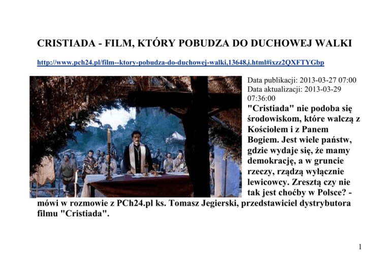 CRISTIADA - FILM, KTÓRY POBUDZA DO DUCHOWEJ WALKI http://www.pch24.pl/film--ktory-pobudza-do-duchowej-walki,13648,i.html#ixzz2QXFTYGbp Data publikacji: 2013-03-27 07:00 Data aktualizacji: 2013-03-29 07:36:00 "Cristiada" nie podoba się środowiskom, które walczą z Kościołem i z Panem Bogiem. Jest wiele państw, gdzie wydaje się, że mamy demokrację, a w gruncie rzeczy, rządzą wyłącznie lewicowcy. Zresztą czy nie tak jest choćby w Polsce? mówi w rozmowie z PCh24.pl ks. Tomasz Jegierski, przedstawiciel dystrybutora filmu "Cristiada". 1 Film „Ku większej chwale: prawdziwa historia Cristiady", który w Polsce będzie dystrybuowany pod tytułem "Cristiada", nie jest z otwartymi rękoma przyjmowany przez wiele środowisk, choć jest to film ze wspaniałą obsadą, bardzo dobrze zrobiony. Dlaczego? Film „Cristiada” to pierwsza fabularna historia o powstaniu katolików w Meksyku w latach 1926-1929 i najdroższa produkcja w historii meksykańskiego kina. Film został przygotowany z hollywoodzkim rozmachem. W rolach głównych występują m.in. znany ze swojego antykomunizmu oraz przywiązania do chrześcijaństwa hollywoodzki aktor i reżyser Andy Garcia, a także Eva Longoria i Peter O'Toole. Za realizacją filmu stoi meksykański producent Pablo Jose Barroso, który wcześniej zrealizował głośny film „Guadalupe”. Mimo imponującego rozmachu filmu i wielkich nazwisk w obsadzie, film ma trudności, aby przebić się do szerokiego widza. Dlaczego? Odpowiedź jest prosta, nie podoba się środowiskom, które w obecnym czasie walczą z Kościołem, z Panem Bogiem. Jeśli spojrzymy na mapę świata, to zobaczymy, że w wielu krajach rządzą ludzie lewicy. Jest też wiele państw, gdzie wydaje się, że mamy demokrację, a w gruncie rzeczy, także i tam rządzą lewicowcy. Zresztą czy nie tak jest choćby w Polsce? 2 I film „Cristiada” jest niejako dlatego, żeby pokazać prawdę, pokazać, że jeśli ta lewicowa rewolucja przybierze na sile, poczuje, że ma większość, to pokaże swoje prawdziwe oblicze. Jakie? Zapraszam do zobaczenia w filmie. Gdyby ksiądz miał pokrótce opowiedzieć fabułę, to co by wypunktował? Film opowiada historię prześladowań jakich doświadczyli katolicy w lewicowym Meksyku na początku XX wieku. W 1926 roku prezydent Meksyku Plutarco Elias Calles, mason i socjalista, zaczął wprowadzać antyklerykalne przepisy, które uderzały w Kościół katolicki - zamykano kościoły, szkoły katolickie, zarządzono przymusową rejestrację wszystkich księży. To co się działo w Meksyku, spowodowało, że wielu mieszkańców tego państwa uważało prezydenta Callles wręcz za „antychrysta”. W odpowiedzi na prześladowania powstała „Krajowa Liga Obrony Wolności Religijnej”, która zorganizowała akcję obywatelskiego nieposłuszeństwa. Dwa miliony mieszkańców Meksyku podpisało petycję do władz z żądaniem anulowania antykatolickich zapisów konstytucji. Wówczas wybuchło powstanie, które przeszło do historii pod nazwą „cristiady”, a jej uczestnicy 3 zasłynęli jako „cristeros”, czyli chrystusowcy. W ciągu kilku lat w walce z socjalistami zginęło około 90 tysięcy ludzi! Czyli oglądając film poznajemy męczenników, Kościół prześladowany? Dokładnie tak. I myślę, że niezwykłe jest to, że film wchodzi na ekrany polskich kin, gdy papieżem został wybrany kardynał z Ameryki Południowej, z Kościoła, który doskonale wie, czym są prześladowania chrześcijan. Ludzie tam mieszkający, choć doświadczyli niezwykłych cierpień, stoją przy Chrystusie, dają nam przykład jak trzeba wierzyć. Dla nas to niezwykły dar. A film, który chcemy pokazać Polakom, to wspaniałe narzędzie ewangelizacyjne. Skorzystajmy z niego. Nie bójmy się, idźmy do kin, by zobaczyć jak bohatersko nasi bracia w wierze bronili Chrystusa, swoich przekonań, swojego prawa do wyznawania wiary. A komu nie uda się pójść do kina, niech zakupi płytę DVD z filmem, niech zobaczy go z całą rodziną. Owszem, może nie nadaje się on dla małych dzieci, ale już dziesięciolatkowie, niech uczą się heroizmu wiary! 4 Prawa do dystrybucji filmów Polsce nabyła firma FT Films. W polskich kinach pojawi się już niebawem, bo 5 kwietnia. Dlaczego Ksiądz zajął się tak mocno dystrybucją tego filmu? Dla mnie kino to narzędzie świadectwa i apostolatu. W filmie „Cristiada” połączono szacunek dla najważniejszych wartości z wysokiej jakości sztuką filmową. Chcę promować filmy, w których jest obecne takie połączenie. ”Cristiada” to krzepiąca historia pobudzająca do walki duchowej i obrony wiary. Warto zobaczyć ten film. Dziękuję za rozmowę 5