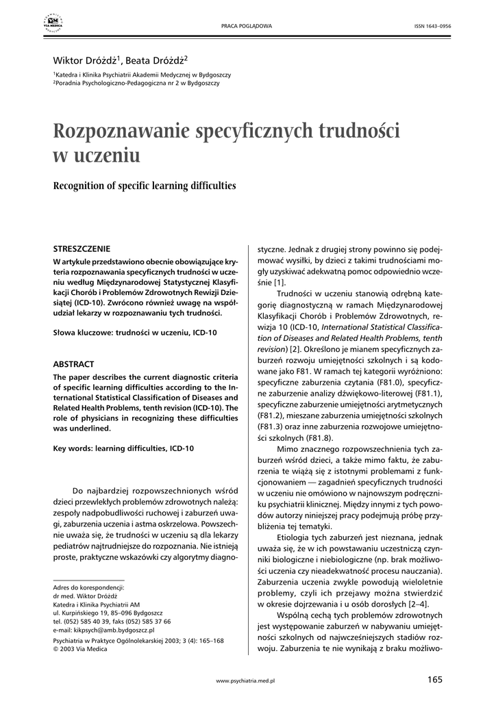 PRACA POGLĄDOWA ISSN 1643–0956 Wiktor Dróżdż1, Beata Dróżdż2 1Katedra i Klinika Psychiatrii Akademii Medycznej w Bydgoszczy Psychologiczno-Pedagogiczna nr 2 w Bydgoszczy 2Poradnia Rozpoznawanie specyficznych trudności w uczeniu Recognition of specific learning difficulties STRESZCZENIE W artykule przedstawiono obecnie obowiązujące kryteria rozpoznawania specyficznych trudności w uczeniu według Międzynarodowej Statystycznej Klasyfikacji Chorób i Problemów Zdrowotnych Rewizji Dziesiątej (ICD-10). Zwrócono również uwagę na współudział lekarzy w rozpoznawaniu tych trudności. Słowa kluczowe: trudności w uczeniu, ICD-10 ABSTRACT The paper describes the current diagnostic criteria of specific learning difficulties according to the International Statistical Classification of Diseases and Related Health Problems, tenth revision (ICD-10). The role of physicians in recognizing these difficulties was underlined. Key words: learning difficulties, ICD-10 Do najbardziej rozpowszechnionych wśród dzieci przewlekłych problemów zdrowotnych należą: zespoły nadpobudliwości ruchowej i zaburzeń uwagi, zaburzenia uczenia i astma oskrzelowa. Powszechnie uważa się, że trudności w uczeniu są dla lekarzy pediatrów najtrudniejsze do rozpoznania. Nie istnieją proste, praktyczne wskazówki czy algorytmy diagno- Adres do korespondencji: dr med. Wiktor Dróżdż Katedra i Klinika Psychiatrii AM ul. Kurpińskiego 19, 85–096 Bydgoszcz tel. (052) 585 40 39, faks (052) 585 37 66 e-mail: [email protected] Psychiatria w Praktyce Ogólnolekarskiej 2003; 3 (4): 165–168 © 2003 Via Medica styczne. Jednak z drugiej strony powinno się podejmować wysiłki, by dzieci z takimi trudnościami mogły uzyskiwać adekwatną pomoc odpowiednio wcześnie [1]. Trudności w uczeniu stanowią odrębną kategorię diagnostyczną w ramach Międzynarodowej Klasyfikacji Chorób i Problemów Zdrowotnych, rewizja 10 (ICD-10, International Statistical Classification of Diseases and Related Health Problems, tenth revision) [2]. Określono je mianem specyficznych zaburzeń rozwoju umiejętności szkolnych i są kodowane jako F81. W ramach tej kategorii wyróżniono: specyficzne zaburzenia czytania (F81.0), specyficzne zaburzenie analizy dźwiękowo-literowej (F81.1), specyficzne zaburzenie umiejętności arytmetycznych (F81.2), mieszane zaburzenia umiejętności szkolnych (F81.3) oraz inne zaburzenia rozwojowe umiejętności szkolnych (F81.8). Mimo znacznego rozpowszechnienia tych zaburzeń wśród dzieci, a także mimo faktu, że zaburzenia te wiążą się z istotnymi problemami z funkcjonowaniem — zagadnień specyficznych trudności w uczeniu nie omówiono w najnowszym podręczniku psychiatrii klinicznej. Między innymi z tych powodów autorzy niniejszej pracy podejmują próbę przybliżenia tej tematyki. Etiologia tych zaburzeń jest nieznana, jednak uważa się, że w ich powstawaniu uczestniczą czynniki biologiczne i niebiologiczne (np. brak możliwości uczenia czy nieadekwatność procesu nauczania). Zaburzenia uczenia zwykle powodują wieloletnie problemy, czyli ich przejawy można stwierdzić w okresie dojrzewania i u osób dorosłych [2–4]. Wspólną cechą tych problemów zdrowotnych jest występowanie zaburzeń w nabywaniu umiejętności szkolnych od najwcześniejszych stadiów rozwoju. Zaburzenia te nie wynikają z braku możliwo- www.psychiatria.med.pl 165 Psychiatria w Praktyce Ogólnolekarskiej 2003, tom 3, nr 4 ści uczenia się ani też nie są bezpośrednim wynikiem urazów mózgu lub chorób czy deficytów percepcyjnych, mogą natomiast współistnieć z nimi, a także z innymi zespołami klinicznymi (takimi jak zaburzenia uwagi czy zaburzenia zachowania). Są najprawdopodobniej skutkiem nieprawidłowego przebiegu procesów poznawczych i wynikają z pewnego rodzaju dysfunkcji biologicznych. Występują częściej u chłopców niż u dziewcząt lub też są częściej rozpoznawane u płci męskiej. Istotnym kryterium diagnostycznym jest obecność którejś z form tych zaburzeń już we wczesnym okresie szkolnym [2, 5]. Objawy trudności w uczeniu ujawniają się zazwyczaj w pierwszych latach nauki szkolnej [6]. Wczesne rozpoznanie trudności w uczeniu ma często kluczowe znaczenie dla możliwości zastosowania odpowiednich programów terapeutycznych, a także dla zmniejszenia urazów psychicznych, które mogą wynikać z niezrozumienia problemu przez opiekunów i otoczenie dziecka [4, 6]. Ważną rolę w tym zakresie mogą odgrywać lekarze zajmujący się dziećmi. W trakcie wizyt u lekarza u pacjentów ujawniają się niekiedy problemy związane z trudnościami w uczeniu. Wprawdzie lekarze nie są w stanie precyzyjnie stawiać rozpoznania trudności w uczeniu, jednak mogą — dzięki posiadanej wiedzy w tym zakresie — znacząco wspomóc postawienie odpowiedniej diagnozy, a także ułatwić skierowanie dziecka do specjalistycznej placówki (zwykle poradni psychologiczno-pedagogicznej). Natomiast po ustaleniu rozpoznania trudności w uczeniu, jeśli mają stały kontakt z rodziną dziecka, mogą nakłaniać do stosowania zaleconych ćwiczeń i metod terapii. W ten sposób mogą spełniać istotną rolę w dbaniu o prawidłowy rozwój dziecka z trudnościami w uczeniu. W tabeli 1 przedstawiono kryteria diagnostyczne dla specyficznych zaburzeń rozwoju umiejętności szkolnych według ICD-10 [2]. Autorzy ICD-10 podkreślają pięć trudności wyłaniających się w związku z diagnozowaniem specyficznych zaburzeń rozwoju umiejętności szkolnych. 1. Należy odróżnić te zaburzenia od jeszcze prawidłowych wariantów rozwoju umiejętności szkolnych. 2. Należy uwzględniać dynamikę zaburzeń i ich znaczenie w poszczególnych fazach rozwoju. 3. Należy uwzględniać fakt, że umiejętności szkolne są zdobywane w ramach aktywnego procesu uczenia i nie są prostą pochodną biologicznego dojrzewania. W dużej mierze zależą od warunków rodzinnych i szkolnych. 4. W wypadk