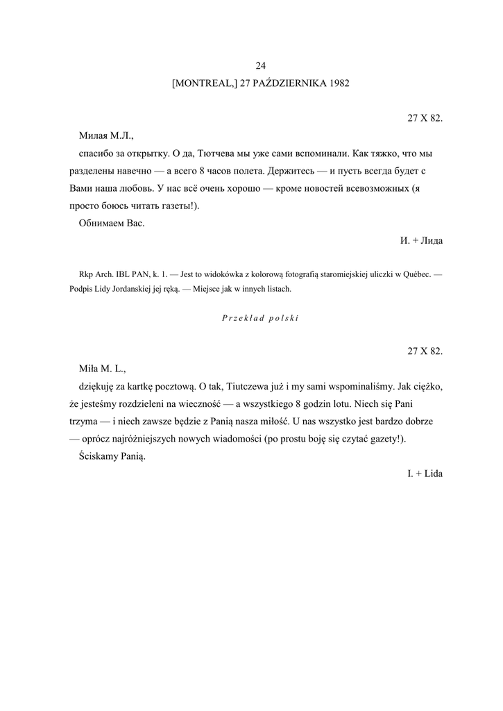 24 [MONTREAL,] 27 PAŹDZIERNIKA 1982 27 X 82. Милая М.Л., спасибо за открытку. О да, Тютчева мы уже сами вспоминали. Как тяжко, что мы разделены навечно — а всего 8 часов полета. Держитесь — и пусть всегда будет с Вами наша любовь. У нас всё очень хорошо — кроме новостей всевозможных (я просто боюсь читать газеты!). Обнимаем Вас. И. + Лида Rkp Arch. IBL PAN, k. 1. — Jest to widokówka z kolorową fotografią staromiejskiej uliczki w Québec. — Podpis Lidy Jordanskiej jej ręką. — Miejsce jak w innych listach. Przekład polski 27 X 82. Miła M. L., dziękuję za kartkę pocztową. O tak, Tiutczewa już i my sami wspominaliśmy. Jak ciężko, że jesteśmy rozdzieleni na wieczność — a wszystkiego 8 godzin lotu. Niech się Pani trzyma — i niech zawsze będzie z Panią nasza miłość. U nas wszystko jest bardzo dobrze — oprócz najróżniejszych nowych wiadomości (po prostu boję się czytać gazety!). Ściskamy Panią. I. + Lida