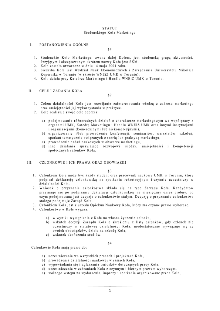 STATUT Studenckiego Koła Marketingu I. POSTANOWIENIA