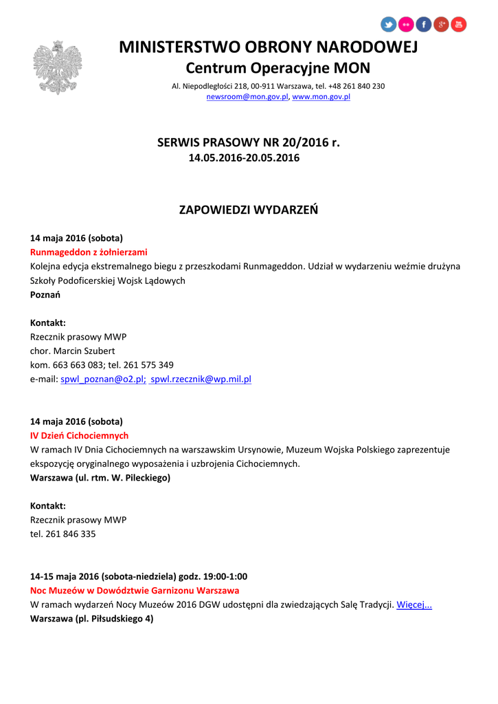 MINISTERSTWO OBRONY NARODOWEJ Centrum Operacyjne MON Al. Niepodległości 218, 00-911 Warszawa, tel. +48 261 840 230 [email protected], www.mon.gov.pl SERWIS PRASOWY NR 20/2016 r. 14.05.2016-20.05.2016 ZAPOWIEDZI WYDARZEŃ 14 maja 2016 (sobota) Runmageddon z żołnierzami Kolejna edycja ekstremalnego biegu z przeszkodami Runmageddon. Udział w wydarzeniu weźmie drużyna Szkoły Podoficerskiej Wojsk Lądowych Poznań Kontakt: Rzecznik prasowy MWP chor. Marcin Szubert kom. 663 663 083; tel. 261 575 349 e-mail: [email protected]; [email protected] 14 maja 2016 (sobota) IV Dzień Cichociemnych W ramach IV Dnia Cichociemnych na warszawskim Ursynowie, Muzeum Wojska Polskiego zaprezentuje ekspozycję oryginalnego wyposażenia i uzbrojenia Cichociemnych. Warszawa (ul. rtm. W. Pileckiego) Kontakt: Rzecznik prasowy MWP tel. 261 846 335 14-15 maja 2016 (sobota-niedziela) godz. 19:00-1:00 Noc Muzeów w Dowództwie Garnizonu Warszawa W ramach wydarzeń Nocy Muzeów 2016 DGW udostępni dla zwiedzających Salę Tradycji. Więcej... Warszawa (pl. Piłsudskiego 4) Kontakt: Rzecznik prasowy DGW ppłk Joanna Klejszmit-Bodziuch kom.721 810 749 tel. 261 879 603 e-mail: [email protected] 14-15 maja 2016 (sobota-niedziela) godz. 19:00-1:00 Noc Muzeów w Centrum Weterana W ramach wydarzeń Nocy Muzeów 2016 Centrum Weterana udostępni swoją siedzibę dla zwiedzających. W programie również zaplanowano pokazy grup rekonstrukcji historycznej Więcej... Warszawa (ul. Puławska 4) Kontakt: Kierownik Zespołu Edukacyjno-Promocyjnego Centrum Weterana Andrzej Korus tel. 261 842 073 16 maja 2016 (poniedziałek) Szkolenie kierowców wojskowych Szkolenie kierowców z załadunku na platformę kolejową. Świętoszów Kontakt: Oficer prasowy 10 BKPanc. kpt. Adriana Wołyńska tel.261 685 033 e-mail: [email protected] 16 maja 2016 (poniedziałek) Wręczenie broni Wręczenie broni żołnierzom służby przygotowawczej Zegrze (CSŁiI, ul. Juzistek 2) Kontakt: Oficer prasowy CSŁiI kpt Krzysztof Baran kom. 722 380 054 e-mail: [email protected] 16-20 maja 2016 (poniedziałek-piątek) Ćwiczenie pk. HALNY-16 Ćwiczenie dowódczo-sztabowe pk. HALNY-16. Dęblin Kontakt: Oficer prasowy 4 SLSz mjr Grzegorz Grabarczuk tel. 519 038 407 e-mail: [email protected] 17-19 maja 2016 (wtorek-czwartek) Ćwiczenie pk. PRZEPRAWA-16 Ćwiczenie taktyczno-specjalne Przeprawa-16. W szkoleniu weźmie udział 65 żołnierzy 1 Brzeskiego Pułku Saperów Prędocin k. Brzegu Kontakt: Rzecznik prasowy dowódcy 1 Psap kpt. Jacek Obierzyński kom. 727 016 577, tel. 261 637 221 e-mail: [email protected] 17-19 maja 2016 (wtorek-czwartek) Szkolenie polsko-kanadyjskie Wspólne polsko-kanadyjskie szkolenie z wykorzystaniem śmigłowców. W ćwiczeniu udział wezmą żołnierze 7 Batalionu Kawalerii Powietrznej Nowy Glinnik Kontakt: Oficer prasowy 25 BKPow kpt. Tomasz Pierzak kom. 601 066 829 e-mail: [email protected] 17-20 maja 2016 (wtorek-piątek) Ćwiczenie pk. Pantera 16 Ćwiczenie wspomagane komputerowo pk. Pantera 16 Przemyśl Kontakt: Oficer prasowy 21 BSP kpt. Konrad Radzik kom. 691 677 515 17-26 maja 2016 Ćwiczenie pk. Brilliant Jump Ćwiczenie międzynarodowe pk. Brilliant Jump Żagań, Świętoszów Kontakt: mjr Michał Romańczuk kom. 602 173 866 e-mail: [email protected] 19-21 maja 2016 (czwartek-sobota) Zawody sprawnościowo-obronne 39. Wojewódzkie Zawody Sprawnościowo-Obronne „Sprawni jak żołnierze 2016” Koszalin Kontakt: kpt. Katarzyna Kaźmierczak kom. 668 515 479 e-mail: [email protected] 20 maja 2016 (piątek), godz. 10:00 Święto 21 Brygady Strzelców Podhalańskich Obchody święta połączone będą z 23. rocznicą powstania formacji. Więcej... Rzeszów Kontakt: Oficer prasowy 21 BSP kpt. Konrad Radzik kom. 691 677 515 20-21 maja 2016 (piątek-sobota) Święto 12 Brygady Zmechanizowanej Święto jednostki połączone z Biegiem Hallerczyka, który odbędzie się 21 maja br. w okolicach Lasu Arkońskiego Szczecin (Jasne Błonia, Las Arkoński) Kontakt: Oficer prasowy 12 BZ kpt. Janusz Błaszczak kom. 727 012 658 e-mail: [email protected] 23 maja 2016 (poniedziałek) Akredytacje na ćwiczenie Anakonda 16 Akredytacje na najważniejsze szkolenie Sił Zbrojnych RP, Anakonda 16, trwają do 23 maja. Więcej... Warszawa Kontakt: Rzecznik prasowy DO ppłk Piotr Walatek kom. 607 388 937 e-mail: [email protected] 23 maja 2016 (poniedziałek) Konferencja nt. kierunków rozwoju szkolnictwa wojskowego Konferencja nt. kierunków rozwoju szkolnictwa wojskowego z udziałem wiceministra, prof. Wojciecha Fałkowskiego i rektorów polskich uczelni wojskowych. Więcej... Warszawa (Klub AON, al. gen. A. Chruściela „Montera” 103) Kontakt: Rzecznik AON tel.261 814 000 e-mail: [email protected] 2-5 czerwca 2016 (czwartek-niedziela) Targi Pro Defense Jedyne targi proobronne w Polsce połączone z Kongresem Organizacji Proobronnych, w którym wezmą udział przedstawiciele organizacji z krajów członkowskich NATO. Więcej... Ostróda (CTK Expo-Mazury, ul. Grunwaldzka 55) Kontakt: Artur Wróbel kom. 722 389 596 e-mail: [email protected] Targi Pro Defense Dagmara Alsztyniuk tel. 667 779 330 e-mail: [email protected] 23 czerwca 2016 (czwartek) Akredytacje na szczyt NATO Akredytacje dla dziennikarzy na lipcowy szczyt NATO w Warszawie trwają do 23 czerwca. Więcej... Warszawa Kontakt: Joanna Wajda Tel.: +48 22 523 71 83 Email: [email protected] KRONIKA 7 maja 2016 (sobota) Uroczystości w Bąkowej Górze W narodzie polskim jest tak wielka siła, tak wielka moc, że walka o niepodległość jest nakazem tak silnym, iż nigdy się nie podda – powiedział minister obrony narodowej Antoni Macierewicz podczas obchodów 70. rocznicy mordu dokonanego na dwunastu żołnierzach Konspiracyjnego Wojska Polskiego. Więcej... 8 maja 2016 (niedziela) Pamięci żołnierzy 34 Pułku Piechoty Dzisiaj, kiedy oddajemy hołd żołnierzom, którzy bronili Białej Podlaskiej, kiedy minister obrony narodowej podejmuje decyzję, żeby wzmocnić wschodnią ścianę Polski 