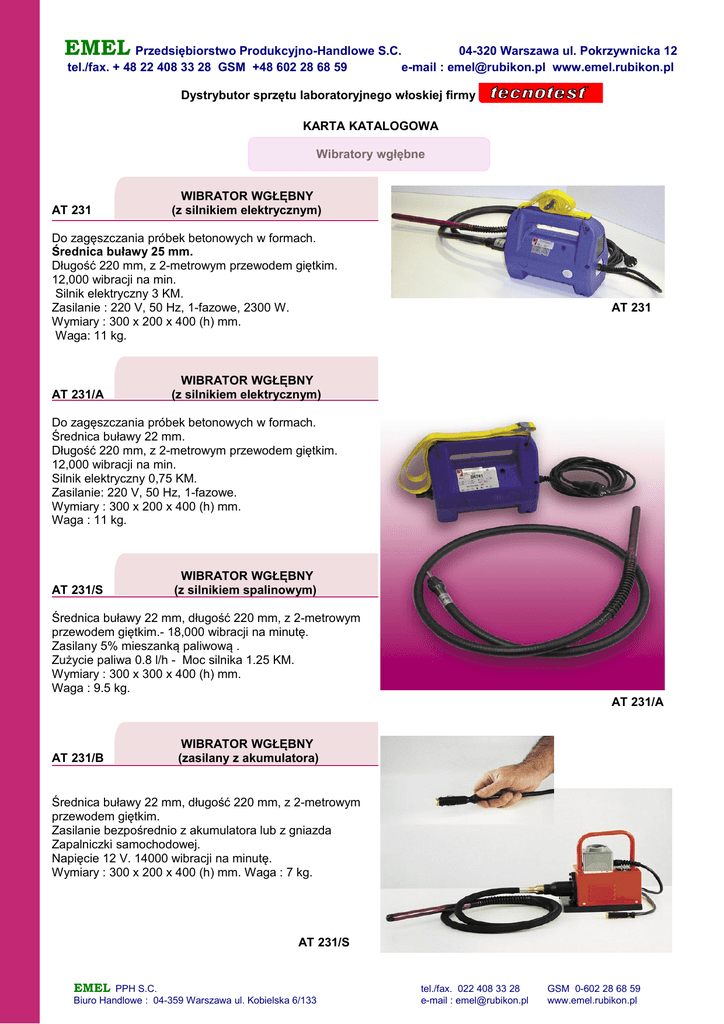 EMEL Przedsiębiorstwo Produkcyjno-Handlowe S.C. tel./fax. + 48 22 408 33 28 GSM +48 602 28 68 59 04-320 Warszawa ul. Pokrzywnicka 12 e-mail : [email protected] www.emel.rubikon.pl Dystrybutor sprzętu laboratoryjnego włoskiej firmy KARTA KATALOGOWA Wibratory wgłębne AT 231 WIBRATOR WGŁĘBNY (z silnikiem elektrycznym) Do zagęszczania próbek betonowych w formach. Średnica buławy 25 mm. Długość 220 mm, z 2-metrowym przewodem giętkim. 12,000 wibracji na min. Silnik elektryczny 3 KM. Zasilanie : 220 V, 50 Hz, 1-fazowe, 2300 W. Wymiary : 300 x 200 x 400 (h) mm. Waga: 11 kg. AT 231/A AT 231 WIBRATOR WGŁĘBNY (z silnikiem elektrycznym) Do zagęszczania próbek betonowych w formach. Średnica buławy 22 mm. Długość 220 mm, z 2-metrowym przewodem giętkim. 12,000 wibracji na min. Silnik elektryczny 0,75 KM. Zasilanie: 220 V, 50 Hz, 1-fazowe. Wymiary : 300 x 200 x 400 (h) mm. Waga : 11 kg. AT 231/S WIBRATOR WGŁĘBNY (z silnikiem spalinowym) Średnica buławy 22 mm, długość 220 mm, z 2-metrowym przewodem giętkim.- 18,000 wibracji na minutę. Zasilany 5% mieszanką paliwową . Zużycie paliwa 0.8 l/h - Moc silnika 1.25 KM. Wymiary : 300 x 300 x 400 (h) mm. Waga : 9.5 kg. AT 231/A AT 231/B WIBRATOR WGŁĘBNY (zasilany z akumulatora) Średnica buławy 22 mm, długość 220 mm, z 2-metrowym przewodem giętkim. Zasilanie bezpośrednio z akumulatora lub z gniazda Zapalniczki samochodowej. Napięcie 12 V. 14000 wibracji na minutę. Wymiary : 300 x 200 x 400 (h) mm. Waga : 7 kg. AT 231/S EMEL PPH S.C. Biuro Handlowe : 04-359 Warszawa ul. Kobielska 6/133 tel./fax. 022 408 33 28 e-mail : [email protected] GSM 0-602 28 68 59 www.emel.rubikon.pl EMEL Przedsiębiorstwo Produkcyjno-Handlowe S.C. tel./fax. + 48 22 408 33 28 GSM +48 602 28 68 59 04-320 Warszawa ul. Pokrzywnicka 12 e-mail : [email protected] www.emel.rubikon.pl Dystrybutor sprzętu laboratoryjnego włoskiej firmy Części zapasowe do AT 231/A - AT 231/S - AT 231/B AT 231/R 2-metrowy przewód giętki z buławą Ø 22x220 mm AT 231/P 2-metrowy przewód giętki z buławą Ø 22x270 mm (interchangeable) Części zapasowe do AT 231 AT 231/T 2-metrowy przewód giętki z buławą Ø 22x290 mm EMEL PPH S.C. Biuro Handlowe : 04-359 Warszawa ul. Kobielska 6/133 tel./fax. 022 408 33 28 e-mail : [email protected] GSM 0-602 28 68 59 www.emel.rubikon.pl