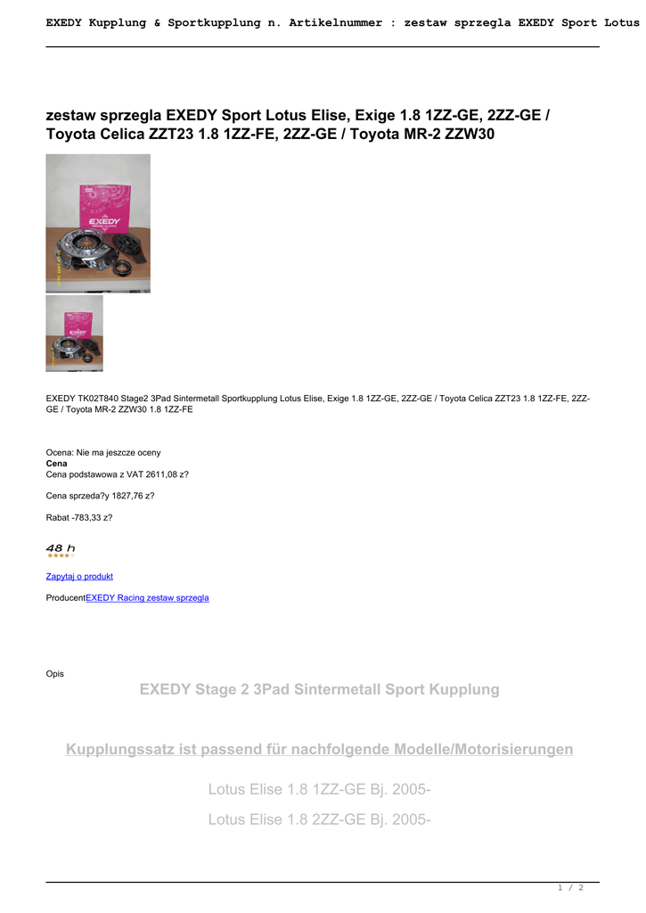 EXEDY Kupplung & Sportkupplung n. Artikelnummer : zestaw sprzegla EXEDY Sport Lotus zestaw sprzegla EXEDY Sport Lotus Elise, Exige 1.8 1ZZ-GE, 2ZZ-GE / Toyota Celica ZZT23 1.8 1ZZ-FE, 2ZZ-GE / Toyota MR-2 ZZW30 EXEDY TK02T840 Stage2 3Pad Sintermetall Sportkupplung Lotus Elise, Exige 1.8 1ZZ-GE, 2ZZ-GE / Toyota Celica ZZT23 1.8 1ZZ-FE, 2ZZGE / Toyota MR-2 ZZW30 1.8 1ZZ-FE Ocena: Nie ma jeszcze oceny Cena Cena podstawowa z VAT 2611,08 z? Cena sprzeda?y 1827,76 z? Rabat -783,33 z? Zapytaj o produkt ProducentEXEDY Racing zestaw sprzegla Opis EXEDY Stage 2 3Pad Sintermetall Sport Kupplung Kupplungssatz ist passend für nachfolgende Modelle/Motorisierungen Lotus Elise 1.8 1ZZ-GE Bj. 2005Lotus Elise 1.8 2ZZ-GE Bj. 2005- 1 / 2 EXEDY Kupplung & Sportkupplung n. Artikelnummer : zestaw sprzegla EXEDY Sport Lotus Lotus Exige 1.8 2ZZ-GE Bj. 2004Toyota Celica ZZT23 1.8 1ZZ-FE Bj. 1999-2006 Toyota Celica ZZT23 1.8 2ZZ-GE Bj. 1999-2006 Toyota MR-2 ZZW30 1.8 1ZZ-FE Bj. 2000-2007 W opakowaniu1 2 / 2 Powered by TCPDF (www.tcpdf.org)