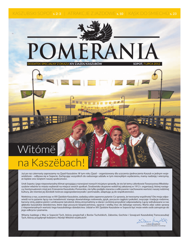 KASZUBSKI SOPOT s. 2‒3 | ATRAKCJE ZJAZDOWE s. 10 | KĄSK DO SMIECHÙ s. 23 DODATEK SPECJALNY Z OKAZJI XIV ZJAZDU KASZUBÓW SOPOT, 7 LIPCA 2012 Witómë na Kaszëbach! Już po raz czternasty zapraszamy na Zjazd Kaszubów. W tym roku Zjazd – organizowany dla uczczenia zjednoczenia Kaszub w jednym województwie – odbywa się w Sopocie. Zachęcając wszystkich do radosnego udziału w tym niezwykłym wydarzeniu, mamy nadzieję i wierzymy, że będzie ono świętem naszej społeczności. Urok Sopotu i jego niepowtarzalny klimat sprzyjający rozwojowi nowych inicjatyw sprawiły, że sto lat temu członkowie Towarzystwa Młodokaszubów właśnie to miasto wybierali na miejsce swoich spotkań. Środowisko skupione wokół tej założonej w 1912 r. organizacji, której następcą i kontynuatorem misji jest Zrzeszenie Kaszubsko-Pomorskie, nie tylko podjęło starania o odkrywanie i zachowanie wartości naszej rodzimej kultury, ale również jej dorobek twórczo zagospodarowywało i pomnażało, adaptując ją do współczesności. Niektórzy z nas, uczestnicząc w XIV Zjeździe Kaszubów, zadadzą sobie zapewne pytanie: Co sprawia, że tworzymy wspólnotę? Oto moja odpowiedź na to pytanie: łączy nas świadomość starego słowiańskiego rodowodu, język, poczucie ciągłości pokoleń, zwyczaje i tradycje rodzinne, barwny strój, piękne pieśni i umiłowanie tatczëznë, którą otrzymaliśmy w darze i za której przyszłość odpowiadamy. Łączy wdrukowane w nas głęboko kaszubskie dziedzictwo, które daje poczucie bezpieczeństwa, oparcie i wielką moc do dalszego wzrostu. Warto zdać sobie sprawę z niepowtarzalnych wartości tego kaszubskiego dziedzictwa. Udział w XIV Zjeździe Kaszubów w Sopocie być może wiele osób zainspiruje do jego odkrycia i poznania. Witamy każdego z Was w Sopocie! Tych, którzy przyjechali z Borów Tucholskich, Zaborów, Gochów i Szwajcarii Kaszubskiej Transcassubią! Tych, którzy przypłynęli łodziami z Nordy! Witómë wszëtczich! Łukasz Grzędzicki Prezes Zrzeszenia Kaszubsko-Pomorskiego 1 Drodzy Kaszubi, Szanowni Goście, Tczëwôrtny Drëszë! Sopot – kurort na Kaszubach – ma przyjemność gościć uczestników XIV Zjazdu Kaszubów. Oblicze miasta podobne jest do współczesnej kaszubszczyzny – zakorzenione w swej historii i tradycji, jednocześnie otwarte na nowe inspiracje, wyzwania i niezwykłych ludzi. Jestem ogromnie zadowolony, że nasze miasto pełne życia wypełnili dziś Kaszubi z żywotną kulturą i pięknym językiem. W Sopocie w 1913 roku powstało Muzeum Kaszubsko-Pomorskie, tu organizowało się Towarzystwo Młodokaszubów z dr. Aleksandrem Majkowskim i Janem Karnowskim na czele. Dbali oni o zachowanie tradycji i języka kaszubskiego dla kultury polskiej, kultury ogólnonarodowej. Jednocześnie domagali się upodmiotowienia Kaszubów i zabiegali o samorządność Pomorza. Dzięki ich wysiłkowi dziś – w wolnej, demokratycznej Polsce – kolejne pokolenie Majkowskich, Grzędzickich, Struków czy Karnowskich może korzystać z potencjału, jaki daje samorząd terytorialny, oraz rozwijać gospodarczo, społecznie i kulturowo Pomorze. To właśnie z radości objęcia obszaru kaszubskiego jednym województwem zrodziła się inicjatywa corocznych Zjazdów Kaszubów, święta radosnego i barwnego. Z Sopotem związani byli również inni wybitni Kaszubi: król Antoni Abraham, redaktor Tadeusz Bolduan, ksiądz prałat Franciszek Grucza czy urodzony w Malarach nieopodal Wiela, Młodokaszuba, obywatel honorowy Miasta Sopotu, wybitny marynista prof. Marian Mokwa. To również dzięki ich wysiłkowi i twórczości Sopot jest bogatszy i trwale osadzony w kaszubskiej wspólnocie. 2 3 Myśląc o Kaszubach i Sopocie, nie mogę pominąć wizyty Ojca Świętego Jana Pawła II w 1999 roku na sopockim hipodromie. I tym razem mogliśmy usłyszeć gorące wezwanie do zachowania i rozwoju kultury i języka kaszubskiego. To zadanie jest wciąż aktualne, i cieszę się, że dziś w Sopocie pozytywnie odpowiadamy na ten apel Papieża – Polaka. Tak jak Sopot jest perłą Bałtyku, tak Kaszubi z całą pewnością są Perłą Pomorza i Polski. Witómë w Sopòce! Jacek Karnowski 4 Prezydent Miasta Sopotu Kaszubska mapa Sopotu Aleksander Gosk Aleksandrowi Majkowskiemu poświęcono dwie tablice pamiątkowe na budynkach związanych z jego sopocką aktywnością. Pierwsza kamienna tablica, znajdująca się na budynku przy ul. Jana Jerzego Haffnera 11 1 , opatrzona jest napisem: „W tym domu mieszkał w latach 1912–1921 Aleksander Majkowski, pisarz i działacz kaszubski, zasłużony w walce o polskość Pomorza. W setną rocznicę urodzin – Zrzeszenie Kaszubsko-Pomorskie, Towarzystwo Przyjaciół Sopotu, 1976”. Druga, przy ul. Bohaterów Monte Cassino 28 2 , upamiętnia placówkę muzealną powstałą staraniem Aleksandra Majkowskiego. Znajduje się na niej wizerunek gryfa oraz napis: „W tym domu w latach 1913–1914 mieściło się Muzeum Kaszubsko-Pomorskie założone przez Aleksandra Majkowskiego”. Wizerunek gryfa ozdabia także tablicę poświęconą Romanowi Jancie-Połczyńskiemu, działaczowi społecznemu, współtwórcy Towarzystwa Młodokaszubów i Muzeum Kaszubsko-Pomorskiego. Na tablicy wmurowanej na budynku przy ul. Grunwaldzkiej 19 3 , którego był właścicielem, napisano: „W tym domu mieszkał i zmarł 30 września 1916 roku Roman Stanisław Janta-Połczyński, działacz i poseł ziemi kaszubskiej do parlamentu niemieckiego w latach 1890–1911. Zrzeszenie Kaszubsko-Pomorskie, 1981”. Z Sopotem związany był także wybitny badacz kaszubszczyzny, niemiecki uczony Friedrich Lorentz. Jest autorem m.in. takich dzieł, jak Teksty słowińskie, Zarys ogólnej pisowni i składni pomorsko-kaszubskiej, Zarys etnografii kaszubskiej. Założył Kaszubskie Towarzystwo Ludoznawcze, do którego należeli polscy i niemieccy badacze kultury kaszubskiej. Mieszkał przy ul. Jana Jerzego Haffnera 35 4 , dom istnieje do dziś, a w 1992 r