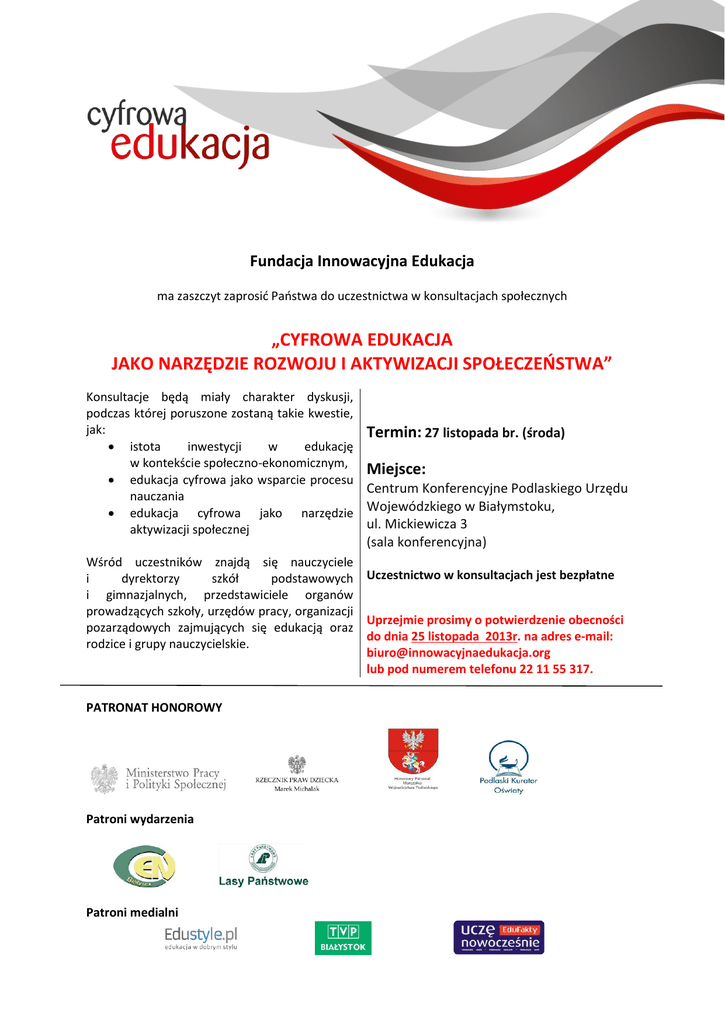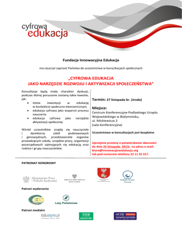 Fundacja Innowacyjna Edukacja ma zaszczyt zaprosić Państwa do uczestnictwa w konsultacjach społecznych „CYFROWA EDUKACJA JAKO NARZĘDZIE ROZWOJU I AKTYWIZACJI SPOŁECZEŃSTWA” Konsultacje będą miały charakter dyskusji, podczas której poruszone zostaną takie kwestie, jak: Termin: 27 listopada br. (środa) istota inwestycji w edukację w kontekście społeczno-ekonomicznym, Miejsce: edukacja cyfrowa jako wsparcie procesu Centrum Konferencyjne Podlaskiego Urzędu nauczania edukacja cyfrowa jako narzędzie Wojewódzkiego w Białymstoku, ul. Mickiewicza 3 aktywizacji społecznej (sala konferencyjna) Wśród uczestników znajdą się nauczyciele i dyrektorzy szkół podstawowych Uczestnictwo w konsultacjach jest bezpłatne i gimnazjalnych, przedstawiciele organów prowadzących szkoły, urzędów pracy, organizacji Uprzejmie prosimy o potwierdzenie obecności pozarządowych zajmujących się edukacją oraz do dnia 25 listopada 2013r. na adres e-mail: rodzice i grupy nauczycielskie. [email protected] lub pod numerem telefonu 22 11 55 317. PATRONAT HONOROWY Patroni wydarzenia Patroni medialni PROGRAM 10.00 – 10.05 Przywitanie gości 10.05 – 10.20 WPROWADZENIE Rachunek społeczno –ekonomiczny – czy Polskę stać na pasywne społeczeństwo? /Omówienie materiału przygotowanego przez Instytut Badań Nad Gospodarką Rynkową, Agata Tyszkiewicz, Fundacja Innowacyjna Edukacja/ 10.20– 10.35 ZIDENTYFIKOWANE KLUCZOWE KOMPONENTY „CYFROWEJ SZKOŁY” /Agata Tyszkiewicz, Fundacja Innowacyjna Edukacja/ Zdiagnozowane problemy: dostęp do internetu wystarczająca ilość i odpowiednia jakość sprzętu komputerowego/ informatycznych pomocy dydaktycznych wyposażenie w umiejętności / szkolenia nauczycieli, umożliwiające korzystanie z TIK e-podręczniki finansowanie PATRONAT HONOROWY Patroni wydarzenia Patroni medialni 10:35– 11.15 TEZY – Studia Przypadków / Witold Kołodziejczyk - Collegium Futurum/ Cyfryzacja edukacji (szeroko pojęta jako kompleksowe rozwiązanie systemowe): o Wsparcie podstawy programowej w edukacji obowiązkowej poprzez kształcenie umiejętności – innowacyjności, kreatywności i współpracy (SZKOCJA) o Budowanie potencjału regionu w oparciu o edukację na poziomie podstawowym (MAINE, USA) o Wsparcie kształcenia dzieci ze specjalnymi potrzebami edukacyjnymi – wyrównywanie szans oraz wspieranie uzdolnionych dzieci (NOWY TOMYŚL, PODIEBRADY) o Wsparcie kształcenia ustawicznego rodziców w celu podwyższenia kwalifikacji i aktywności zawodowej, wyrównywania szans na rynku pracy, w dalszej perspektywie dzieci poprzez stworzenie dla nich wsparcia w domu (REGIONALNE STUDIA PRZYPADKÓW) o Stworzenie modelu współpracy oraz wzmacnianie partycypacji w życiu społecznym, poczucia tożsamości i potencjału lokalnego (ESSA Academy - Film) 11.15 – 12.35 NARZĘDZIA WSPIERANIA EDUKACJI 11.15– 11.45 Internet / Rafał Banaszkiewicz, T-Mobile Polska S.A., Ekspert ds. ICT/ /Artur Tracz, Cisco Systems Poland Sp. z o.o../ PATRONAT HONOROWY Patroni wydarzenia Patroni medialni o o o o o Dlaczego optymalny przesył danych i infrastruktura są tak ważne? Dlaczego bez internetu nie ma możliwości zbudowania nowoczesnego systemu edukacji? Jakie możliwości daje internet i jakie perspektywy otwiera? Panel/dyskusja z udziałem nauczycieli/dyrektorów szkół, przedsiębiorców. Demonstracja, co się dzieje kiedy nie działa nam Internet i jakie są najczęstsze problemy? Prezentacja możliwości wdrożeń i zastosowania rozwiązań umożliwiających optymalne wykorzystanie internetu w szkole 11:45– 12.30 Zasoby /Daniel Makus - Szkoły L. Piwoniego w Szczecinie/ Repozytorium, aplikacje i metodologia o Koncepcja repozytorium oraz prezentacja zasobów dostępnych/opracowanych przez resorty i inne podmioty administracji publicznej o Prezentacja przykładowych aplikacji oraz sposobów ich wykorzystania w edukacji o Panel - wypowiedzi dyrektorów/nauczycieli zaangażowanych w wykorzystywanie cyfrowych narzędzi w edukacji, wraz z prezentacją przykładów metodologii i wykorzystanie nowoczesnych aplikacji 12.30 – 13.00 LUNCH PATRONAT HONOROWY Patroni wydarzenia Patroni medialni 13.00 – 14:30 PANEL I 13.00 – 14:30 PANEL II WARSZTAT FINANSOWANIE o Wykorzystanie nowoczesnych technologii w pracy w szkole i poza szkołą /Daniel Makus – Szkoły L. Piwoniego w Szczecinie/ /Dr Jan Polak- Apple Education Mentor/ Kadra o o o Nauczyciele Organizacje wspierające Rodzice o Finansowanie oparte na współpracy pomiędzy resortami, szkołami, JST, NGO oraz PUP w kontekście edukacji – dyskusja /Agata Tyszkiewicz, Edukacja/ o Fundacja Innowacyjna Finansowanie regionalne – fundusze europejskie /Agnieszka Piesowicz, Główny Informacyjny Funduszy Europejskich, Marszałkowski Woj. Podlaskiego / Punkt Urząd o Inne źródła i sposoby finansowania: optymalizacja kosztów i sposoby na uzyskanie dodatkowego finansowania /Radosław Solan, niezależny ekspert finansowy/ 14.30 – 14.40 PODSUMOWANIE /Agata Tyszkiewicz, Fundacja Innowacyjna Edukacja/ PATRONAT HONOROWY Patroni wydarzenia Patroni medialni 14.40 – 16.00 OTWARTE KONSULTACJE Sesja pytań i odpowiedzi, dyskusja z prelegentami PRELEGENCI WITOLD KOŁODZIEJCZYK COLLEGIUM FUTURUM Apple Education Mentor. Redaktor naczelny miesięcznika „Edukacja i Dialog” Twórca Laboratorium Edukacji Medialnej w CODN (platforma z wideowykładami dla nauczycieli. Współpracownik WSiP i Wydawnictw Szkolnych PWN w wielu projektach związanych ze szkoleniem nauczycieli. Stworzył i wdraża nowatorski projekt Collegium Futurum - gimnazjum i liceum w Słupsku wykorzystujący nowe modele dydaktyczne oparte na technologii informacyjno - komunikacyjnej. Przygotował na zlecenie Instytutu Obywatelskiego raport "Jak będzie zmieniać się edukacja? Wyzwania na polskiej szkoły i ucznia." Autor (miedzy innymi) książki "Gra o szkołę. W poszukiwaniu zasad zarządzania w nowych czasach" i poradnika dla uczniów "Jak skutecznie zarządzać swoi