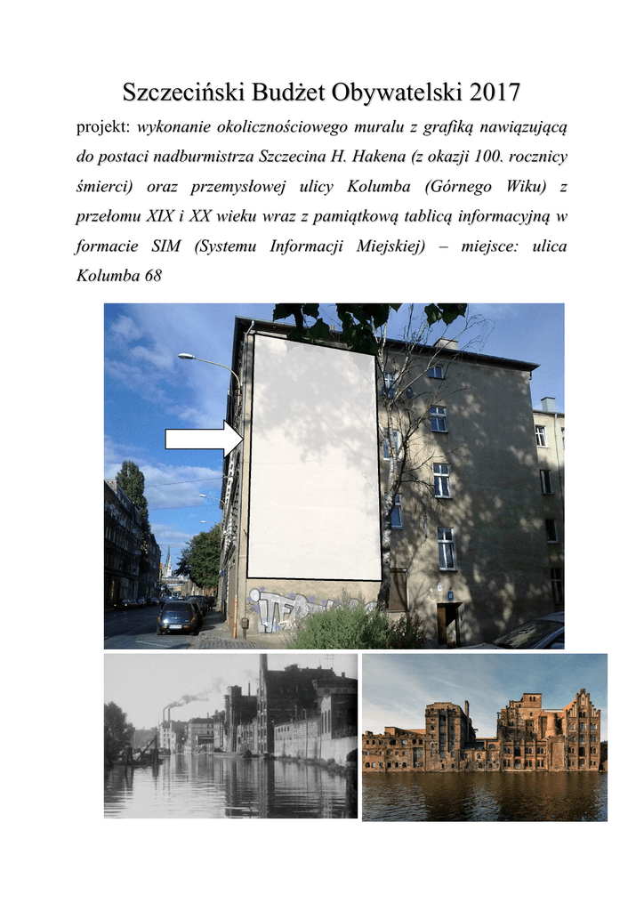 Szczeciński Budżet Obywatelski 2017 projekt: wykonanie okolicznościowego muralu z grafiką nawiązującą do postaci nadburmistrza Szczecina H. Hakena (z okazji 100. rocznicy śmierci) oraz przemysłowej ulicy Kolumba (Górnego Wiku) z przełomu XIX i XX wieku wraz z pamiątkową tablicą informacyjną w formacie SIM (Systemu Informacji Miejskiej) – miejsce: ulica K o l u mb a 6 8 przykładowy tekst: Hermannowi Hakenowi, nadburmistrzowi Szczecina w latach 1878 – 1907, w setną rocznicę śmierci szczecinianie projekt wykonano w ramach Szczecińskiego Budżetu Obywatelskiego 2017 głosowanie – jesień 2016 przykładowe realizacje: (w Szczecinie): (w innych miastach): harmonogram: - uzyskanie zgodny wspólnoty mieszkaniowej na zgłoszenie projektu w magistracie [udział Gminy (lokale komunalne) – 754/1000 udziałów we wspólnocie mieszkaniowej (ponad 75%)] - zgłoszenie projektu do Szczecińskiego Budżetu Obywatelskiego 2017 - akceptacja komisji i włączenie projektu do listy zadań (w przypadku powodzenia w głosowaniu): - zapytanie do Wydziału Urbanistyki i Administracji Budowlanej Urzędu Miasta Szczecin o zgodność pomysłu z zapisami Miejscowego Planu Zagospodarowania Przestrzennego (forma/definicja reklamy?) - złożenie do Biura Miejskiego Konserwatora Zabytków wniosku o wydanie zaleceń konserwatorskich określających sposób korzystania z zabytku, jego zabezpieczenia i wykonania prac konserwatorskich a także zakres dopuszczalnych zmian, które mogą być wprowadzone w tym zabytku dotyczącego „wykonania okolicznościowego muralu z grafiką nawiązującą do postaci nadburmistrza Szczecina H. Hakena (z okazji 100. rocznicy śmierci) oraz przemysłowej ulicy Kolumba (Górnego Wiku) z przełomu XIX i XX wieku wraz z pamiątkową tablicą informacyjną w formacie SIM (Systemu Informacji Miejskiej)” - zdobycie rekomendacji od różnych środowisk (instytucji, stowarzyszeń, fundacji, organizacji pozarządowych, itp.) - ogłoszenie konkursu skierowanego do środowisk artystycznych Szczecina (np. studentów Akademii Sztuki, uczniów Liceum Plastycznego, szkół policealnych, osób wykonujących graffiti, absolwentów wyższych szkół) i innych zainteresowanych na opracowanie grafiki muralu - ogłoszenie wyników konkursu - opracowanie projektu budowlanego - zgłoszenie do Wydziału Urbanistyki i Administracji Budowlanej Urzędu Miasta Szczecin robót budowlanych nie wymagających pozwolenia na budowę w postaci zamiaru wykonania muralu na elewacji budynku (w związku z planowanym wejściem w życie uchwały ustalającej zasady i warunki sytuowania obiektów małej architektury, tablic reklamowych i urządzeń reklamowych na terenie miasta Szczecin) - wykonanie muralu ☺ - uroczystość odsłonięcia muralu w czasie trwania The Tall Ships Races (sierpień 2017), after party z krótkim filmem podsumowującym akcję i wystawą wszystkich projektów muralu nadesłanych na konkurs * inspiracją zadania była akcja crowdfundingowa na wykonanie muralu dla Davida Bowie w Warszawie wg pomysłu Stowarzyszenia Inicjatyw SpołecznoKulturalnych „Stacja Muranów”