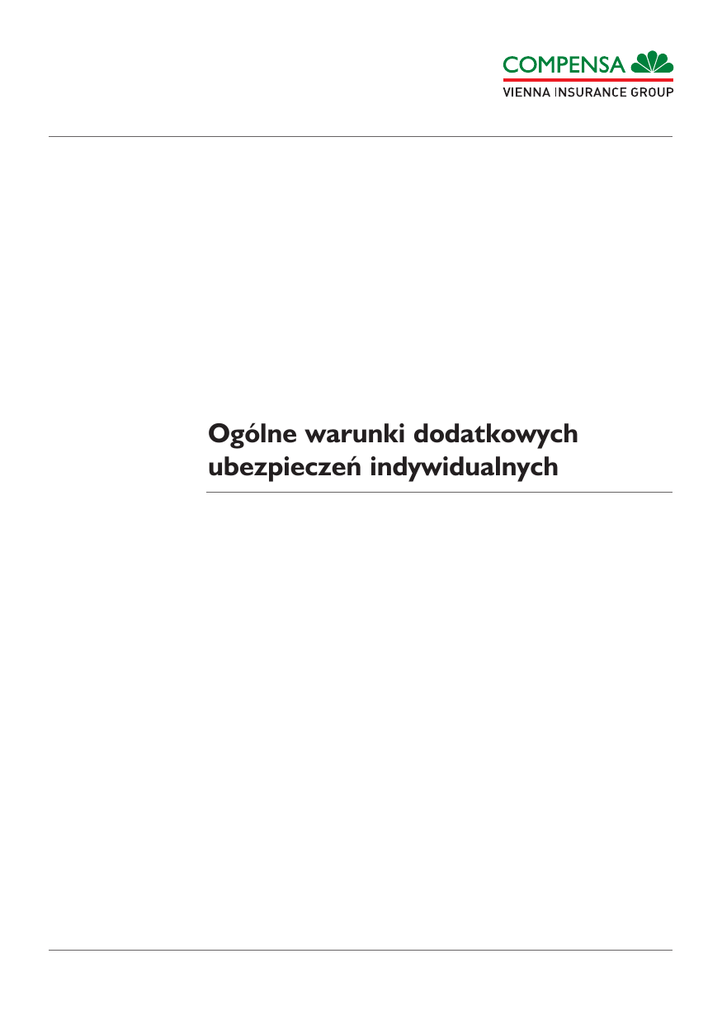 Ogólne warunki dodatkowych ubezpieczeń indywidualnych Szanowni Państwo, Przedstawiamy ogólne warunki dodatkowych ubezpieczeń indywidualnych. W ogólnych warunkach ubezpieczenia zamieszczony został wykaz dodatkowych ubezpieczeń indywidualnych, które mogą stanowić rozszerzenie zakresu ochrony z tytułu Ubezpieczenia podstawowego. Prosimy o wnikliwe zapoznanie się z treścią dokumentów. Prezes Zarządu Franz Fuchs Compensa Towarzystwo Ubezpieczeń na Życie S.A. Vienna Insurance Group Al. Jerozolimskie 162, 02-342 Warszawa KRS 43309, Sąd Rejonowy dla m.st. Warszawy XII Wydzia∏ Gospodarczy KRS, NIP 527 20 52 806 Kapita∏ zak∏adowy: 122.980.914,00 z∏ - op∏acony w ca∏ości Tel.: +48 22 501 60 00, 801 120 000 Agent Imię i nazwisko Agenta Nr rejestru Agenta w KNF Ubezpieczający Imię i nazwisko Nr wniosku: 1 Spis treści 1. Ogólne warunki dodatkowego indywidualnego ubezpieczenia na wypadek śmierci w następstwie nieszczęśliwego wypadku 2. Ogólne warunki dodatkowego indywidualnego ubezpieczenia na wypadek śmierci w następstwie wypadku komunikacyjnego 3. Ogólne warunki dodatkowego indywidualnego ubezpieczenia na wypadek poważnego zachorowania 4. Aneks nr 1 do Ogólnych warunków dodatkowego indywidualnego ubezpieczenia na wypadek poważnego zachorowania o symbolu BRP-1212 5. Ogólne warunki dodatkowego indywidualnego ubezpieczenia na wypadek pobytu w szpitalu w następstwie nieszczęśliwego wypadku 6. Ogólne warunki dodatkowego indywidualnego ubezpieczenia na wypadek pobytu w szpitalu w następstwie nieszczęśliwego wypadku lub choroby 7. Ogólne warunki dodatkowego indywidualnego ubezpieczenia na wypadek trwałej utraty zdrowia w następstwie nieszczęśliwego wypadku 8. Aneks nr 1 do Ogólnych warunków dodatkowego indywidualnego ubezpieczenia na wypadek trwałej utraty zdrowia w następstwie nieszczęśliwego wypadku o symbolu BRP-1612 9. Ogólne warunki dodatkowego indywidualnego ubezpieczenia na wypadek ciężkiej trwałej utraty zdrowia w następstwie nieszczęśliwego wypadku 10. Ogólne warunki dodatkowego indywidualnego ubezpieczenia na wypadek całkowitej niezdolności ubezpieczonego do pracy z przejęciem opłacania składek 11. Ogólne warunki dodatkowego indywidualnego ubezpieczenia na wypadek całkowitej niezdolności ubezpieczającego do pracy z przejęciem opłacania składek 12 . Ogólne warunki dodatkowego indywidualnego ubezpieczenia na wypadek śmierci ubezpieczającego z przejęciem opłacania składek 2 BRP-1012 str. 3 BRP-1112 str. 7 BRP-1212 str. 11 str. 17 BRP-1312 str. 22 BRP-1412 str. 27 BRP-1612 str. 33 str. 45 BRP-2012 str. 52 BRP-1712 str. 56 BRP-1812 str. 64 BRP-1912 str. 72 OGÓLNE WARUNKI DODATKOWEGO INDYWIDUALNEGO UBEZPIECZENIA NA WYPADEK ŚMIERCI W NASTĘPSTWIE NIESZCZĘŚLIWEGO WYPADKU BRP-1012 § 1. POSTANOWIENIA OGÓLNE 1. Ogólne warunki dodatkowego indywidualnego ubezpieczenia na wypadek śmierci w następstwie nieszczęśliwego wypadku o symbolu BRP-1012 (zwane dalej OWDU) mają zastosowanie w przypadku rozszerzenia zakresu odpowiedzialności Compensa Towarzystwo Ubezpieczeń na Życie Spółka Akcyjna Vienna Insurance Group, zwanego dalej Towarzystwem, z tytułu Umów ubezpieczenia zawieranych na podstawie odpowiednich ogólnych warunków indywidualnego ubezpieczenia podstawowego na życie (zwanych dalej OWU). 2. Do Ubezpieczenia dodatkowego stosuje się odpowiednio postanowienia OWU, o ile OWDU nie stanowią inaczej. 3. Rozszerzenie zakresu odpowiedzialności Towarzystwa o dodatkowe indywidualne ubezpieczenie na wypadek śmierci w następstwie nieszczęśliwego wypadku (zwane dalej Ubezpieczeniem dodatkowym) może nastąpić na wniosek Ubezpieczającego za zgodą Towarzystwa: 1) z Dniem początku odpowiedzialności z tytułu Ubezpieczenia podstawowego albo w Rocznicę ubezpieczenia, oraz 2) o ile na Dzień początku odpowiedzialności z tytułu Ubezpieczenia dodatkowego Ubezpieczony ma nie mniej niż 3 miesiące oraz nie więcej niż 65 lat, o ile OWU nie stanowią inaczej. § 2. DEFINICJE 1. Terminy oraz nazwy użyte w OWDU, Polisie oraz innych dokumentach związanych z Umową ubezpieczenia oznaczają: 1) Choroba – zdiagnozowany przez lekarza stan organizmu polegający na nieprawidłowej reakcji narządów lub układów Ubezpieczonego na bodźce środowiska wewnętrznego lub zewnętrznego, w tym czynnik chorobotwórczy: bakteria, wirus lub pasożyt. W rozumieniu OWDU za Chorobę nie uważa się ciąży, porodu, połogu. 2) Czynnik zewnętrzny – czynnik oddziałujący na organizm Ubezpieczonego, który z medycznego punktu widzenia nie może być zakwalifikowany jako choroba (stan organizmu polegający na nieprawidłowej reakcji narządów lub układów Ubezpieczonego na bodźce środowiska wewnętrznego lub zewnętrznego) lub czynnik chorobotwórczy (bakteria, wirus lub pasożyt wywołujący chorobę Ubezpieczonego). 3) Nieszczęśliwy wypadek – zdarzenie spełniające łącznie następujące warunki: przypadkowe, nagłe zdarzenie, wywołane wskutek działania wyłącznie Czynnika zewnętrznego i niezależne od woli ani stanu zdrowia Ubezpieczonego, w następstwie którego Ubezpieczony doznał Urazu lub zmarł. 4) Okres ubezpieczenia dodatkowego – okres obejmowania Ubezpieczonego ochroną ubezpieczeniową przez Towarzystwo na podstawie OWDU, liczony od Dnia początku odpowiedzialności z tytułu Ubezpieczenia podstawowego lub od Rocznicy ubezpieczenia do dnia wygaśnięcia odpowiedzialności z tytułu Ubezpieczenia dodatkowego. W Okresie ubezpieczenia dodatkowego Ubezpieczający zobowiązany jest do opłacania Składek regularnych. 5) Uraz – uszkodzenie tkanek ciała lub narządów Ubezpieczonego wskutek działania Czynnika zewnętrznego. 3 2. Terminy oraz nazwy używane w OWDU i niezdefiniowane w ust. 1 powyżej otrzymują znaczenie nadane im w OWU. § 3. PRZEDMIOT UBEZPIECZENIA I ZAKRES ODPOWIEDZIALNOŚCI TOWARZYSTWA 1. Przedmiotem Ubezpieczenia dodatkowego jest życie Ubezpieczonego w Okresie ubezpieczen