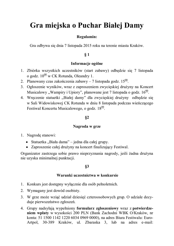 Gra miejska o Puchar Białej Damy Regulamin: Gra odbywa się dnia 7 listopada 2015 roku na terenie miasta Kraków. §1 Informacje ogólne 1. Zbiórka wszystkich uczestników (start zabawy) odbędzie się 7 listopada o godz. 1000 w CK Rotunda, Oleandry 1. 2. Planowany czas zakończenia zabawy – 7 listopada godz. 1500. 3. Ogłoszenie wyników, wraz z zaproszeniem zwycięskiej drużyny na Koncert Musicalowy „Wampiry i Upiory”, planowane jest 7 listopada o godz. 1600. 4. Wręczenie statuetki „Białej damy” dla zwycięskiej drużyny odbędzie się w Sali Widowiskowej CK Rotunda w dniu 8 listopada podczas wieńczącego Festiwal Koncertu Musicalowego, o godz. 1800. §2 Nagroda w grze 1. Nagrodę stanowi: Statuetka „Biała dama” – jedna dla całej grupy. Zaproszenie całej drużyny na koncert finalizujący Festiwal. Organizator zastrzega sobie prawo nieprzyznania nagrody, jeśli żadna drużyna nie uzyska minimalnej punktacji. §3 Warunki uczestnictwa w konkursie 1. Konkurs jest dostępny wyłącznie dla osób pełnoletnich. 2. Wymagany jest dowód osobisty. 3. W grze może wziąć udział dziesięć czteroosobowych grup. O udziale decyduje pierwszeństwo zgłoszeń. 4. Grupy nadsyłają wypełniony formularz zgłoszeniowy wraz z potwierdzeniem wpłaty w wysokości 200 PLN (Bank Zachodni WBK O/Kraków, nr konta: 51 1500 1142 1220 6034 0969 0000), na adres Biura Festiwalu: EuroArtpol, 30-389 Kraków, ul. Zbaraska 3, lub na adres e-mail: [email protected]. Tytuł wpłaty: WPISOWE – Gra terenowa Biała Dama. §4 Przebieg konkursu 1. Konkurs jest wieloetapowy. Rozpoczyna się w CK Rotunda, Oleandry 1. 2. Konkurs rozpoczyna się pierwszą eliminacją a kończy ogłoszeniem wyników i rozdaniem nagród. §5 Postanowienia końcowe 1. Organizator nie ponosi odpowiedzialności za usługi pocztowe, kurierskie lub usługi poczty elektronicznej, z której korzystać będą osoby uczestniczące w grze. Organizator nie ponosi również odpowiedzialności za działania osób trzecich, związanych z organizacją konkursu oraz za szkody spowodowane podaniem błędnych lub nieaktualnych danych przez osoby uczestniczące w grze. 2. Osoby uczestniczące w grze wyrażają zgodę na przetwarzanie przez Organizatora ich danych osobowych w rozumieniu ustawy z dnia 29.08.1997r. o ochronie danych osobowych (Dz.U. z 2002r., nr 101, poz. 926 z późn. zm.) w zakresie koniecznym do prawidłowego przeprowadzenia gry oraz ogłoszenia jej wyników. 3. Organizator nie zwraca wpisowego, w wypadku rezygnacji na pięć dni przed zabawą. 4. Regulamin wchodzi w życie z dniem 25 czerwca 2015 r. Formularz zgłoszeniowy do udziału w Grze terenowej o Puchar Białej Damy Uczestnik nr 1 Imię i nazwisko: .................................................................................................. Data urodzenia: ................................................................................................... Uczestnik nr 2 Imię i nazwisko: .................................................................................................. Data urodzenia: ................................................................................................... Uczestnik nr 3 Imię i nazwisko: .................................................................................................. Data urodzenia: ................................................................................................... Uczestnik nr 4 Imię i nazwisko: .................................................................................................. Data urodzenia: ................................................................................................... Kontakt telefoniczny 1: ....................................................................................... Kontakt telefoniczny 2: ....................................................................................... e-mail: ................................................................................................................. Oświadczam, że zapoznałem się z Regulaminem Gry i akceptuję jego warunki. (podpis kapitana grupy)