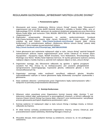 REGULAMIN GŁOSOWANIA „WYBIERAMY MISTRZA LEISURE DIVING” I. Postanowienia ogólne 1. Głosowanie pod nazwą „Wybieramy Mistrza Leisure Diving” (zwane dalej “Głosowanie”) organizowane jest przez firmę dotPR Dominik Wartecki z siedzibą w Środzie Wlkp., przy ul. Dąbrowskiego 37/11, 63-000, wpisanym do ewidencji działalności gospodarczej przez Burmistrza Miasta Środa Wlkp. pod numerem 7164, REGON: 300747333, NIP: 786-156-54-28 (zwany dalej „Organizatorem”). 2. Organizator przeprowadza Głosowanie na portalu społecznościowym Facebook http://www.facebook.com (zwany dalej „Serwis Facebook”) na stronie „citeam.pl”, która znajduje się pod linkiem: http://www.facebook.com/citeampl (zwana dalej „Stroną Konkursową”) za pośrednictwem aplikacji „Wybieramy Mistrza Leisure Diving” (zwany dalej „Aplikacja“), która znajduje się pod poniższym linkiem: http://www.facebook.com/Citeampl/app_368738016529583 3. Celem głosowania jest wyłonienie najlepszych zdjęć w stylu „leisure diving” spośród fotografii wykonywanych podczas imprez organizowanych przez serwis Citeam.pl na terenie pięciu Aquaparków : Aquaparku Sopot, WOSiR Drzonków, Term Maltańskich, Wrocławskiego Parku Wodnego oraz Nemo- Wodny Świat Dąbrowa Górnicza. W wyniku glosowania wybrane zostaną najlepsze zdjęcia z każdej imprezy a, spośród nich najlepsze zdjęcie w stylu „leisure diving”. 4. Organizator wymaga, aby Głosowanie odbywało się zgodnie z ogólnie przyjętymi zasadami Fair Play. Znaczy to, że niedopuszczalne: jest używanie jakiegokolwiek oprogramowania wspomagającego, kupowanie głosów, oddawanie głosów z kont niezweryfikowanych itp. 5. Organizator zastrzega sobie możliwość weryfikacji oddanych głosów. Wszelkie nieprawidłowości wykryte w trakcie głosowania będą skutkowały usunięciem użytkownika z głosowania. 6. Dane osobowe zbierane i przetwarzane przez Organizatora będą wykorzystywane tylko i wyłącznie na potrzeby przeprowadzenia Głosowania. II. Komisja Konkursowa 1. Głównym celem powołanej przez Organizatora komisji (zwanej dalej „Komisja “) jest dokonanie selekcji zdjęć wykonywanych w poszczególnych miastach, w których odbywała się impreza Citeam Leisure Diving Cup (zwana dalej „Impreza”) oraz monitorowanie i weryfikacja procesu głosowania pod kątem dopełnienia postanowień z pkt.I. 2. Komisja wybierze 12 najlepszych zdjęć w stylu Leisure Diving z każdego miasta, w którym odbywała się Impreza. 3. W skład Komisji wchodzą przedstawiciele Organizatora Imprezy, serwisu Citeam.pl, pod przewodnictwem Izabeli Jaskólskiej, Marketing Managera Citeam.pl. 4. Wszystkie decyzje, które podejmie Komisja są ostateczne, oznacza to, że nie podlegające zaskarżeniu. III Warunki uczestnictwa w głosowaniu 1. Każda osoba, która spełni wszystkie poniżej wymienione kryteria staje się głosującym (zwany dalej „Głosujący“): a. w profilu powinny być zawarte prawdziwe dane (w szczególności imię i nazwisko), b. konto w Serwisie Facebook powinno być zweryfikowane, c. odda głos na co najmniej jedno wybrane zdjęcie. 2. W Głosowaniu mogą uczestniczyć osoby, które ukończyły 13 lat. 3. Głosowaniu podlegają zdjęcia uczestników Imprezy, wykonane podczas pięciu imprez w: Sopocie, Drzonkowie, Poznaniu, Wrocławiu oraz Dąbrowie Górniczej w dniach 21.07.2012-19.08.2012. Głosowaniu zostanie poddana wyselekcjonowana wstępnie przez Komisję liczba zdjęć z każdej lokalizacji Imprezy, 12 zdjęć na jedno miasto. 4. Uczestnicy Imprezy po zapoznaniu się z Regulaminem Imprezy, podpisali oświadczenie i wyrazili zgodę na nieodpłatne wykorzystanie wizerunku zarejestrowanego przez Organizatorów podczas skoku do wody w trakcie Imprezy, w tym także do celów promocji Imprezy w dowolnej formie i zakresie, a także na opublikowanie swojego imienia i nazwiska na stronie internetowej poświęconej Imprezie. 5. Głosowanie trwa od dnia 24.08.2012 roku, godz. 16:30 do dnia 09.09.2012 roku, godz. 23:59. 6. Głosowanie podzielone jest na dwa etapy: a. Eliminacje – głosowanie na Mistrzów w poszczególnych kategoriach głosowania, tj. Sopot, Drzonków, Poznań, Wrocław, Dąbrowa Górnicza oraz osobna kategoria „Futbol amerykański”, głosowanie trwa od dnia 24.08 od godz. 15:00 do dnia 02.09 do godz. 23.59. b. Finał - głosowanie na Mistrza Leisure Diving spośród pięciu najlepszych zdjęć wyłonionych podczas etapu eliminacji, głosowanie trwa od dnia 03.09 od godz. 00:00 do dnia 09.09 do godz. 23.59. 7. Wyniki zostaną opublikowane dnia 10.09.2012 roku na Stronie Głosowania oraz w Aplikacji. 8. W przypadku równej liczby głosów, zwycięzcę wytypuje Komisja. IV Zasady uczestnictwa w Głosowaniu 1. Głosujący może oddać głos na więcej niż jedno zdjęcie. 2. Zwycięzcami Głosowania (zwani dalej „Zwycięzcy“) zostają osoby, które otrzymają najwięcej głosów od Głosujących w etapie Eliminacji (jeden Zwycięzca z każdego miasta) oraz jedna osoba, która spośród Zwycięzców etapu Eliminacji otrzyma w Finale najwięcej głosów i zostanie polskim Mistrzem Leisure Diving. 3. Organizator przygotował łącznie sześć nagród (więcej w pkt V, Nagrody). 4. Informacja o wygranym Głosowaniu oraz o warunkach odbioru Nagrody zostanie wysłana do Zwycięzcy drogą mailową/ poprzez wiadomość wysłaną w Serwisie Facebook. 5. Informacja o wygranych Nagrodach zostanie umieszczona na Stronie Głosowania, w Aplikacji. 6. Nagrody zostaną przesłane Zwycięzcom na koszt Organizatora. Organizator pokrywa koszt wysyłki jedynie do granic Polski. W przypadku konieczności wysyłki Nagrody poza granice Polski, Zwycięzca pokrywa różnicę. 7. Nagrody zostaną przesłane na adres wskazany przez Zwycięzcę w ciągu 14 dni od daty zakończenia Głosowania. 8. Organizator zastrzega sobie, że nie ponosi odpowiedzialności za brak możliwości przekazania nagrody z przyczyn leżących po stronie Uczestnik