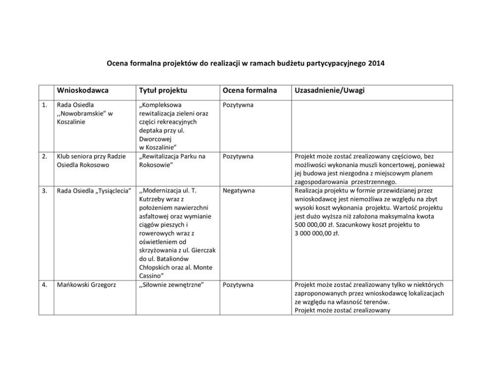 Ocena formalna projektów do realizacji w ramach budżetu partycypacyjnego 2014 Wnioskodawca Tytuł projektu Ocena formalna 1. Rada Osiedla ,,Nowobramskie” w Koszalinie Pozytywna 2. Klub seniora przy Radzie Osiedla Rokosowo „Kompleksowa rewitalizacja zieleni oraz części rekreacyjnych deptaka przy ul. Dworcowej w Koszalinie” „Rewitalizacja Parku na Rokosowie” 3. Rada Osiedla „Tysiąclecia” Negatywna 4. Mańkowski Grzegorz ,,Modernizacja ul. T. Kutrzeby wraz z położeniem nawierzchni asfaltowej oraz wymianie ciągów pieszych i rowerowych wraz z oświetleniem od skrzyżowania z ul. Gierczak do ul. Batalionów Chłopskich oraz al. Monte Cassino” ,,Siłownie zewnętrzne” Pozytywna Pozytywna Uzasadnienie/Uwagi Projekt może zostać zrealizowany częściowo, bez możliwości wykonania muszli koncertowej, ponieważ jej budowa jest niezgodna z miejscowym planem zagospodarowania przestrzennego. Realizacja projektu w formie przewidzianej przez wnioskodawcę jest niemożliwa ze względu na zbyt wysoki koszt wykonania projektu. Wartość projektu jest dużo wyższa niż założona maksymalna kwota 500 000,00 zł. Szacunkowy koszt projektu to 3 000 000,00 zł. Projekt może zostać zrealizowany tylko w niektórych zaproponowanych przez wnioskodawcę lokalizacjach ze względu na własność terenów. Projekt może zostać zrealizowany - na boisku przy ul. Rodła - na stadionie ABC - w parku Książąt Pomorskich (plac zabaw). 5. Paweł Bułło 6. Instytut Polityki Społecznej i Stosunków Międzynarodowych Politechniki Koszalińskiej – dr D. Magierek, dr M. Sikora–Gaca Paweł Iwanek „Kompleks restauracyjno – kawiarniany na terenie Parku Książąt Pomorskich” 7. 8. 9. Ewa Dobrzańska Dr Marek Górka, Instytut Polityki Społecznej i Stosunków Międzynarodowych, Politechnika Koszalińska 10. Dr Marek Górka, Instytut Polityki Społecznej i Stosunków Międzynarodowych, Politechnika Koszalińska „Chodnik: Słowackiego – Śródmieście” ,,Europejskie Centrum Pracy i Planowania Kariery” Pozytywna Pozytywna Negatywna „Remont Boisk w kompleksie rekreacyjno – sportowym na Osiedlu Bukowe” ,,Lider czy menadżer? Przywództwo w czasach kryzysu.” Pozytywna ,,Bezpieczeństwo publiczne w Koszalinie” Pozytywna Pozytywna Budowa kompleksu kawiarniano – restauracyjnego jest niezgodna z miejscowym planem zagospodarowania przestrzennego. Zgodnie z opinią konserwatora zabytków projekt jest też niezgodny z historycznym zagospodarowaniem parku. 11. Kamila Wójcik, Kacper Wiśniewski, Igor Karolak, Karolina Kossmann, Aleksandra Pulkowska, Krzysztof Kucab 12. Konstancja Śliżewska 13. Monika Łopińska – Mlonek 14. 15. 16. 17. 18. ,,Budowa boiska przy I LO im. ST. Dubois w Koszalinie” Pozytywna ,,Koszalin w 3D” ,,Bezpieczne schody dostosowane dla osób niepełnosprawnych i matek z wózkami” Błażej Papiernik ,,Ogólnopolskie Spotkanie Młodzieży” Wanda Szuster ,,Kompleks rekreacyjno – sportowy przy ul. Spasowskiego 2 - 4” Stowarzyszenie Muzyk ,,Zakup i montaż instalacji przy Zespole nagłośnieniowej w Auli Państwowych Szkół koncertowej Zespołu Muzycznych im. G. Państwowych Szkół Bacewicz w Koszalinie Muzycznych im. G. Bacewicz celem realizacji akcji koncertowych na rzecz mieszkańców Koszalina.” Rada Osiedla ,,Deptak na ul. Heleny ,,Śródmieście” Modrzejewskiej” Koszalińskie ,,Budowa 750m Stowarzyszenie Rowerowe wydzielonej ,,Roweria” dwukierunkowej drogi rowerowej po stronie Pozytywna Pozytywna Pozytywna Pozytywna Pozytywnie Pozytywnie Pozytywnie 19. Stowarzyszenie „Aperto” 20. Maria Kaszubowska 21. Rada Osiedla ,,Rokosowo” 22. Mariola Jackiewicz 23. Karolina i Maciej Wogórka 24. Adam Siepracki 25. Adam Siepracki północnej ul. Zwycięstwa na odcinku od ul. Traugutta kierunku centrum miasta w ramach istniejącego szerokiego chodnika i częściowo zieleńca.” ,,Prowadzenie biura Porad Obywatelskich w Koszalinie” ,,Tymczasowe oświetlenie drogi” ,,Rewitalizacja przestrzeni publicznej wokół Klubu Osiedlowego Zacisze i pomieszczeń RO Rokosowo wraz z aleją lipową prowadzącą do obiektu” ,,Wesoły świat u Julków Jamneńskich – edukacja i zabawa” „Nasze na zawsze” „Elementy małej architektury na terenie Koszalina” ,,Zielona ulica Zwycięstwa” Pozytywna Pozytywna Pozytywna Negatywna Projekt nie może zostać zrealizowany, ponieważ zaproponowana lokalizacja nie jest własnością miasta Koszalina, a miasto nie może prowadzić inwestycji na terenach prywatnych. Pozytywna Pozytywna Negatywnie Projekt nie może zostać zrealizowany z uwagi na przyszłe plany inwestycyjne w obszarze realizacji projektu. 26. Adam Siepracki ,,Skwer Jamneński” Negatywna 27. Bogdan Szerszenowicz 28. Łukasz Cieśliński ,,Port Koszalin” ,,Bezpieczny pas komunikacyjny dla mieszkańców ulic Krańcowej i Franciszkańskiej” Pozytywna Negatywna 29. Studenci kierunku Ochrona Środowiska prowadzonego na Wydziale Inżynierii Lądowej Politechniki Koszalińskiej – pod kierunkiem prof. dr hab. Inż. Tomasza Heese 30. Zofia Szreffel 31. Halina Zaremba ,,Miejska Stacja Meteo” Negatywna ,,Nauka tkania gobelinów” ,,Filharmonia – zdrowiem i życiem dla seniorów” ,,Uporządkowanie przestrzeni publicznej poprzez budowę chodnika” ,,Wake Park Koszalin” ,,Główna droga rowerowa Rokosowa” Pozytywna Pozytywna 32. Rafał Siwek 33. Paweł Znyk 34. Natalia Kłus-Szczeblewska Nie można zlikwidować zbiornika przeciwpożarowego, na którego miejscu miał zostać zrealizowany projekt ze względów bezpieczeństwa osiedla Jamno – Łabusz. Opinia skonsultowana ze Strażą Pożarną. Faktyczny koszt realizacji projektu to ok. 800 000,00 zł, co przekracza założone 500 000,00 zł. Obecnie w Koszalinie działa kilka stacji meteorologicznych między innymi profesjonalna stacja Instytutu Meteorologii i Gospodarki Wodnej, stacja Wojewódzkiej Inspekcji Ochrony Środowiska w Szczecinie, staja meteo Zespołu Szkół nr 2, dlatego n