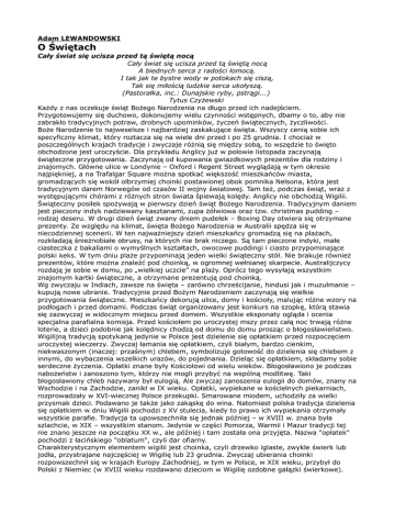 Adam LEWANDOWSKI O Świętach Cały świat się ucisza przed tą świętą nocą Cały świat się ucisza przed tą świętą nocą A biednych serca z radości łomocą. I tak jak te bystre wody w potokach się ciszą, Tak się miłością ludzkie serca ukołyszą. (Pastorałka, inc.: Dunajskie ryby, pstrągi...) Tytus Czyżewski Każdy z nas oczekuje świąt Bożego Narodzenia na długo przed ich nadejściem. Przygotowujemy się duchowo, dokonujemy wielu czynności wstępnych, dbamy o to, aby nie zabrakło tradycyjnych potraw, drobnych upominków, życzeń świątecznych, życzliwości. Boże Narodzenie to najweselsze i najbardziej zaskakujące święta. Wszyscy cenią sobie ich specyficzny klimat, który roztacza się na wiele dni przed i po 25 grudnia. I chociaż w poszczególnych krajach tradycje i zwyczaje różnią się między sobą, to wszędzie to święto obchodzone jest uroczyście. Dla przykładu Anglicy już w połowie listopada zaczynają świąteczne przygotowania. Zaczynają od kupowania gwiazdkowych prezentów dla rodziny i znajomych. Główne ulice w Londynie – Oxford i Regent Street wyglądają w tym okresie najpiękniej, a na Trafalgar Square można spotkać większość mieszkańców miasta, gromadzących się wokół olbrzymiej choinki postawionej obok pomnika Nelsona, która jest tradycyjnym darem Norwegów od czasów II wojny światowej. Tam też, podczas świąt, wraz z występującymi chórami z różnych stron świata śpiewają kolędy. Anglicy nie obchodzą Wigilii. Świąteczny posiłek spożywają w pierwszy dzień świąt Bożego Narodzenia. Tradycyjnym daniem jest pieczony indyk nadziewany kasztanami, zupa żółwiowa oraz tzw. christmas pudding – rodzaj deseru. W drugi dzień świąt zwany dniem pudełek – Boxing Day otwiera się otrzymane prezenty. Ze względu na klimat, święta Bożego Narodzenia w Australii spędza się w niecodziennej scenerii. W ten najważniejszy dzień mieszkańcy gromadzą się na plażach, rozkładają śnieżnobiałe obrusy, na których nie brak niczego. Są tam pieczone indyki, małe ciasteczka z bakaliami o wymyślnych kształtach, owocowe puddingi i ciasto przypominające polski keks. W tym dniu plaże przypominają jeden wielki świąteczny stół. Nie brakuje również prezentów, które można znaleźć pod choinką, w ogromnej wełnianej skarpecie. Australijczycy rozdają je sobie w domu, po „wielkiej uczcie” na plaży. Oprócz tego wysyłają wszystkim znajomym kartki świąteczne, a otrzymane prezentują pod choinką. Wg zwyczaju w Indiach, zawsze na święta – zarówno chrześcijanie, hindusi jak i muzułmanie – kupują nowe ubranie. Tradycyjnie przed Bożym Narodzeniem zaczynają się wielkie przygotowania świąteczne. Mieszkańcy dekorują ulice, domy i kościoły, malując różne wzory na podłogach i przed domami. Podczas świąt organizowany jest konkurs na szopkę, którą stawia się zazwyczaj w widocznym miejscu przed domem. Wszystkie eksponaty ogląda i ocenia specjalna parafialna komisja. Przed kościołem po uroczystej mszy przez całą noc trwają różne loterie, a dzieci podobnie jak kolędnicy chodzą od domu do domu prosząc o błogosławieństwo. Wigilijną tradycją spotykaną jedynie w Polsce jest dzielenie się opłatkiem przed rozpoczęciem uroczystej wieczerzy. Zwyczaj łamania się opłatkiem, czyli białym, bardzo cienkim, niekwaszonym (inaczej: przaśnym) chlebem, symbolizuje gotowość do dzielenia się chlebem z innymi, do wybaczenia wszelkich urazów, do pojednania. Dzieląc się opłatkiem, składamy sobie serdeczne życzenia. Opłatki znane były Kościołowi od wielu wieków. Błogosławiono je podczas nabożeństw i zanoszono tym, którzy nie mogli przybyć na wspólną modlitwę. Taki błogosławiony chleb nazywany był eulogią. Ale zwyczaj zanoszenia eulogii do domów, znany na Wschodzie i na Zachodzie, zanikł w IX wieku. Opłatki, wypiekane w kościelnych piekarniach, rozprowadzały w XVI-wiecznej Polsce przekupki. Smarowane miodem, uchodziły za wielki przysmak dzieci. Podawano je także jako zakąskę do wina. Natomiast polska tradycja dzielenia się opłatkiem w dniu Wigilii pochodzi z XV stulecia, kiedy to prawo ich wypiekania otrzymały wszystkie parafie. Tradycja ta upowszechniła się jednak później – w XVIII w. znana była szlachcie, w XIX – wszystkim stanom. Jedynie w części Pomorza, Warmii i Mazur tradycji tej nie znano jeszcze na początku XX w., ale później i tam została ona przyjęta. Nazwa "opłatek" pochodzi z łacińskiego "oblatum", czyli dar ofiarny. Charakterystycznym elementem wigilii jest choinka, czyli drzewko iglaste, zwykle świerk lub jodła, przystrajane najczęściej w Wigilię lub 23 grudnia. Zwyczaj ubierania choinki rozpowszechnił się w krajach Europy Zachodniej, w tym w Polsce, w XIX wieku, przybył do Polski z Niemiec (w XVIII wieku rozdawano dzieciom w Wigilię ozdobne gałązki świerkowe). Zwyczaj ustawiania w domach i przystrajania choinek w okresie Bożego Narodzenia pochodzi z Niemiec. Drzewko bożonarodzeniowe pojawiło się w XVI w., najprawdopodobniej w Alzacji. Tam właśnie zaczęto wstawiać choinki do domów i ubierać je jabłkami oraz papierowymi ozdobami. Zwolennikiem tego zwyczaju był sam Marcin Luter. Sztych Łukasza Cranacha Starszego z 1509 r. jest najstarszym zachowanym dowodem tej tradycji - przedstawia m.in. przystrojoną gwiazdami i świecami choinkę. W 1837 r. zwyczaj dekorowania drzewek bożonarodzeniowych wprowadziła we Francji księżniczka Helena Meklemburska. Wkrótce choinki rozpowszechniły się w całej Europie i Ameryce Północnej, a to za sprawą brytyjskiej królowej Wiktorii, która w 1840 poślubiła niemieckiego księcia Alberta Sachsen-Coburg-Gotha, przyczyniając się w ten sposób do wielkiej popularności rzeczy i zwyczajów niemieckich. Pierwszą choinkę w Białym Domu udekorowano w 1856 r., za prezydentury Franklina Pierce'a. Do Polski choinka dotarła na przełomie XVIII