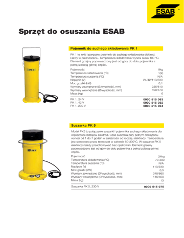 Sprzęt do osuszania ESAB Pojemnik do suchego składowania PK 1 PK 1 to lekki i poręczny pojemnik do suchego składowania elektrod. Łatwy w przenoszeniu. Temperatura składowania wynosi około 100 °C. Element grzejny poprowadzony jest od góry do dołu pojemnika z pełną izolacją górnej części. Pojemność Temperatura składowania (°C) Temperatura suszenia (°C) Napięcie (V) Moc grzałki (kW) Wymiary zewnętrzne (Ø/wysokość, mm) Wymiary wewnętrzne (Ø/wysokość, mm) Masa (kg) 9kg 100 N/A 24/42/110/230 0,1 225/610 100/470 6 PK 1, 24 V PK 1, 42 V PK 1, 230 V 0000 515 063 0000 515 052 0000 515 064 Suszarka PK 5 Model PK5 to połączenie suszarki i pojemnika suchego składowania dla większości rodzajów elektrod. Czas suszenia przy pełnym obciążeniu wynosi od 1 do 7 godzin w zależności od rodzaju elektrody. Temperatura jest sterowana przez termostat w zakresie 50-300°C. W suszarce PK 5 elektrody należy przechowywać bez opakowań. Element grzejny poprowadzony jest od góry do dołu pojemnika z pełną izolacją górnej części. Pojemność Temperatura składowania (°C) Temperatura suszenia (°C) Napięcie (V) Moc grzałki (kW) Wymiary zewnętrzne (Ø/wysokość, mm) Wymiary wewnętrzne (Ø/wysokość, mm) Masa (kg) Suszarka PK 5, 230 V 24kg 70-300 N/A 110/230 0,5 345/660 116/460 13 0000 515 075 Sprzęt do osuszania ESAB Szafa do suchego składowania SK 40 Model SK 40 to urządzenie do suszenia z czterema zdejmowanymi półkami przeznaczonymi do składowania elektrod. Elektrody należy składować bez opakowań. Szafa wyposażona jest w termometr, termostat i lampkę kontrolną. Zakres temperatury suszenia wynosi od 50 do 180°C. Pojemność Temperatura składowania (°C) Temperatura suszenia (°C) Napięcie (V) Moc grzałki (kW) Wymiary zewnętrzne (Ø/wysokość, mm) Wymiary wewnętrzne (Ø/wysokość, mm) Masa (kg) Szafa do suchego składowania SK 40, 230 V 120kg 50-180 N/A 230 0,7 530x640x750 470x510x520 55 0000 515 102 Akcesoria wysokiej jakości dla wybitnego spawacza. ESAB oferuje szeroki zakres akcesoriów. Pełna oferta dostępna na stronie www.esab.pl oraz u dystrybutorów. Wsparcie najwyższej klasy. Usługi oraz wsparcie na najwyższym poziomie gwarantujemy już od momentu potwierdzenia zamówienia. Nasi klienci mogą liczyć na najlepszą obsługę posprzedażową. Silna i utalentowana załoga jest gotowa pomóc w zakresie serwisu i konserwacji, kalibracji, legalizacji oraz modernizacji wyposażenia oraz oprogramowania. Oferujemy także zestandaryzowane rozwiązania w zakresie konserwacji oraz modyfikacji istniejących produktów. ESAB Polska Sp. z o.o. 40 – 114 Katowice Ul. Ściegiennego 3 NIP 527-26-27-655 KRS 000356431 Kontakt: Tel. +48 32 3511 100 Fax. +48 32 3511 120 E-mail: [email protected] www.esab.pl