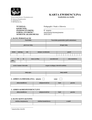 KARTA EWIDENCYJNA kandydata na studia Wyższa Szkoła Biznesu i Przedsiębiorczości w Ostrowcu Świętokrzyskim ul. Akademicka 12 27-400 Ostrowiec Św. WYDZIAŁ: KIERUNEK: POZIOM STUDIÓW: FORMA STUDIÓW1: SEMESTR AKADEMICKI: Pedagogiki i Nauk o Zdrowiu ………………………………………….. II stopnia stacjonarne/niestacjonarne 2016/2017 1. DANE PERSONALNE dzień Nazwisko Nazwisko panieńskie (jeśli zmienione) pierwsze imię drugie imię miesiąc M rok K miejsce urodzenia pesel narodowość stan cywilny obywatelstwo płeć organ wydający dowód osobisty seria i numer dowodu imię ojca imię matki 2. ADRES ZAMIESZKANIA: miasto ulica/osiedle/nr miejscowość/nr wieś kod poczta kod poczta 3. ADRES KORESPONDENCYJNY ulica/osiedle/nr miejscowość/nr 4. DANE KONTAKTOWE telefon stacjonarny 1 niepotrzebne skreślić telefon komórkowy e-mail 5. ŚWIADECTWO DOJRZAŁOŚCI numer świadectwa data wydania nazwa szkoły średniej miasto 6. NIEPEŁNOSPRAWNOŚĆ stopień niepełnosprawności rodzaj niepełnosprawności 7. PREFEROWANE JĘZYKI język 1 język 2 8. STUDIA W INNEJ UCZELNI (ukończone i kontynuowane) nazwa uczelni data rozpoczęcia i data zakończenia liczba punktów ECTS pozostała do wykorzystania w innej uczelni w rozbiciu na kierunki studiów suma już uzyskanych punktów ECTS kierunek/kierunki studiów z zaznaczeniem formy studiów stacjonarne/niestacjonarne I czy II stopień miasto rodzaj już przyznanych świadczeń pomocy materialnej i okres na jaki zostały przyznane w uczelni publicznej i niepublicznej Oświadczam, że dane zawarte w karcie są zgodnie ze stanem faktycznym. Wyrażam zgodę na wprowadzenie do bazy i przetwarzanie moich danych osobowych dla potrzeb realizacji procesu rekrutacji zgodnie z Ustawą a dnia 29 sierpnia 1997 roku o ochronie Danych osobowych Dz. U. nr 133, poz. 883 oraz w celu wypełnienia postanowień art. 170c Ustawy z dnia 18 marca 2011r. o zmianie ustawy – Prawo o szkolnictwie wyższym, ustawy o stopniach i tytule naukowym oraz stopniach i tytule w zakresie sztuki oraz o zmianie niektórych innych ustaw. Ostrowiec Św., dnia .................................... r. .................................................................... czytelny podpis kandydata