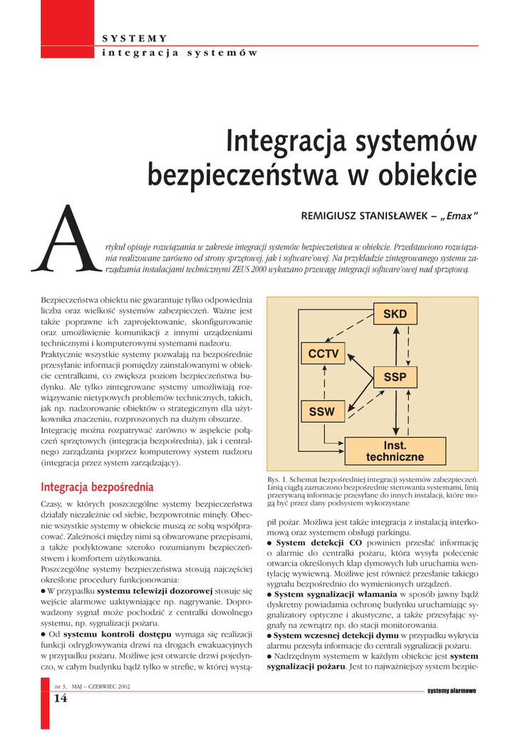 SYSTEMY integracja systemów Integracja systemów bezpieczeństwa w obiekcie A REMIGIUSZ STANISŁAWEK – „Emax“ rtykuł opisuje rozwiązania w zakresie integracji systemów bezpieczeństwa w obiekcie. Przedstawiono rozwiązania realizowane zarówno od strony sprzętowej, jak i software’owej. Na przykładzie zintegrowanego systemu zarządzania instalacjami technicznymi ZEUS 2000 wykazano przewagę integracji software’owej nad sprzętową. Bezpieczeństwa obiektu nie gwarantuje tylko odpowiednia liczba oraz wielkość systemów zabezpieczeń. Ważne jest także poprawne ich zaprojektowanie, skonfigurowanie oraz umożliwienie komunikacji z innymi urządzeniami technicznymi i komputerowymi systemami nadzoru. Praktycznie wszystkie systemy pozwalają na bezpośrednie przesyłanie informacji pomiędzy zainstalowanymi w obiekcie centralkami, co zwiększa poziom bezpieczeństwa budynku. Ale tylko zintegrowane systemy umożliwiają rozwiązywanie nietypowych problemów technicznych, takich, jak np. nadzorowanie obiektów o strategicznym dla użytkownika znaczeniu, rozproszonych na dużym obszarze. Integrację można rozpatrywać zarówno w aspekcie połączeń sprzętowych (integracja bezpośrednia), jak i centralnego zarządzania poprzez komputerowy system nadzoru (integracja przez system zarządzający). Integracja bezpośrednia Czasy, w których poszczególne systemy bezpieczeństwa działały niezależnie od siebie, bezpowrotnie minęły. Obecnie wszystkie systemy w obiekcie muszą ze sobą współpracować. Zależności między nimi są obwarowane przepisami, a także podyktowane szeroko rozumianym bezpieczeństwem i komfortem użytkowania. Poszczególne systemy bezpieczeństwa stosują najczęściej określone procedury funkcjonowania: l W przypadku systemu telewizji dozorowej stosuje się wejście alarmowe uaktywniające np. nagrywanie. Doprowadzony sygnał może pochodzić z centralki dowolnego systemu, np. sygnalizacji pożaru. l Od systemu kontroli dostępu wymaga się realizacji funkcji odryglowywania drzwi na drogach ewakuacyjnych w przypadku pożaru. Możliwe jest otwarcie drzwi pojedynczo, w całym budynku bądź tylko w strefie, w której wystąnr 3, MAJ – CZERWIEC 2002 14 Rys. 1. Schemat bezpośredniej integracji systemów zabezpieczeń. Linią ciągłą zaznaczono bezpośrednie sterowania systemami, linią przerywaną informacje przesyłane do innych instalacji, które mogą być przez dany podsystem wykorzystane pił pożar. Możliwa jest także integracja z instalacją interkomową oraz systemem obsługi parkingu. l System detekcji CO powinien przesłać informację o alarmie do centralki pożaru, która wysyła polecenie otwarcia określonych klap dymowych lub uruchamia wentylację wywiewną. Możliwe jest również przesłanie takiego sygnału bezpośrednio do wymienionych urządzeń. l System sygnalizacji włamania w sposób jawny bądź dyskretny powiadamia ochronę budynku uruchamiając sygnalizatory optyczne i akustyczne, a także przesyłając sygnały na zewnątrz np. do stacji monitorowania. l System wczesnej detekcji dymu w przypadku wykrycia alarmu przesyła informacje do centrali sygnalizacji pożaru. l Nadrzędnym systemem w każdym obiekcie jest system sygnalizacji pożaru. Jest to najważniejszy system bezpie- SYSTEMY integracja systemów czeństwa, często również największy, dlatego musi mieć zaprogramowaną złożoną mapę sterowań. Mapa ta opisuje, które sygnały z czujników pożarowych, grup czujników bądź sygnałów pochodzących z innych urządzeń będą zawierały polecenia do innych instalacji. Ze względu na liczbę czujników pożarowych nie jest możliwe stworzenie zależności w oparciu o stan pojedynczego czujnika. Stosowane są dodatkowo zależności liniowe (linii dozorowych), dwuczujnikowe, grupowe i międzygrupowe. Definiują one warunki wymagane do wysłania przez centralkę sygnału sterującego. Dla przykładu, zależność międzygrupowa wymaga, aby przynajmniej jedna czujka z każdej grupy czujek podanej w tej zależności została wprowadzona w stan alarmu. Bardzo ważne jest poprawne zaprojektowanie podziału instalacji pożarowej na linie dozorowe i grupy czujek. System sygnalizacji pożaru w sytuacjach alarmowych wykonuje dodatkowo następujące zadania: – otwiera klapy dymowe w celu usunięcia gromadzącego się dymu – zamyka klapy pożarowe oraz drzwi pożarowe, aby uniemożliwić rozprzestrzenianie się pożaru – sprowadza windy i blokuje je na parterze (lub na innym, wybranym piętrze) – uruchamia system tryskaczowy (pompy, zawory piętrowe, hydranty) – wysyła polecenia odczytania stosownych komunikatów do systemu nagłaśniającego – uruchamia sygnalizatory optyczne i akustyczne – przesyła sygnał do straży pożarnej bądź do oddalonej firmy monitorującej – przesyła sygnał o pożarze do wybranych instalacji zabezpieczeń (SKD) oraz do instalacji technicznych budynku. Centralki pożaru mają praktycznie nieograniczone możliwości przyłączania dodatkowych modułów I\O. Dlatego najczęściej do nich doprowadzane są, oprócz sygnałów alarmowych, także sygnały techniczne z urządzeń. Integracja przez system zarządzający Integracja na poziomie sprzętowym, realizowana poprzez łączenie wyjść sterujących z wejściami sygnałowymi centralek poszczególnych systemów, daje jedynie niezbędne i podstawowe możliwości przekazywania sygnałów. Interesującym rozwiązaniem jest jednak objęcie wszystkich systemów nadrzędnym komputerowym systemem zarządzającym. w Inteligentne sterowanie System komputerowy sprawuje dwustopniowy nadzór nad obiektem. Po pierwsze, możliwa jest kontrola podsystemów przez operatora (dotyczy to sterowania określonymi podsystemami w ramach uprawnień przypisanych danemu użytkownikowi). W takim przypadku system zapewnia kontrolę elementów wykonawczych. Drugim rodzajem kontroli jest samodzielne podejmowanie działań przez komputer nadzorujący bud