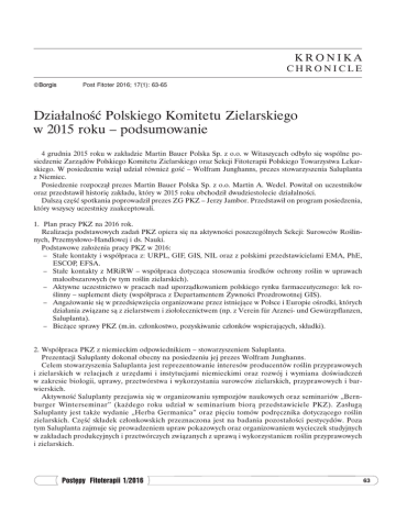 kronika chronicle Borgis Post Fitoter 2016; 17(1): 63-65 Działalność Polskiego Komitetu Zielarskiego w 2015 roku – podsumowanie 4 grudnia 2015 roku w zakładzie Martin Bauer Polska Sp. z o.o. w Witaszycach odbyło się wspólne posiedzenie Zarządów Polskiego Komitetu Zielarskiego oraz Sekcji Fitoterapii Polskiego Towarzystwa Lekarskiego. W posiedzeniu wziął udział również gość – Wolfram Junghanns, prezes stowarzyszenia Saluplanta z Niemiec. Posiedzenie rozpoczął prezes Martin Bauer Polska Sp. z o.o. Martin A. Wedel. Powitał on uczestników oraz przedstawił historię zakładu, który w 2015 roku obchodził dwudziestolecie działalności. Dalszą część spotkania poprowadził prezes ZG PKZ – Jerzy Jambor. Przedstawił on program posiedzenia, który wszyscy uczestnicy zaakceptowali. 1. Plan pracy PKZ na 2016 rok. Realizacja podstawowych zadań PKZ opiera się na aktywności poszczególnych Sekcji: Surowców Roślinnych, Przemysłowo-Handlowej i ds. Nauki. Podstawowe założenia pracy PKZ w 2016: –– Stałe kontakty i współpraca z: URPL, GIF, GIS, NIL oraz z polskimi przedstawicielami EMA, PhE, ESCOP, EFSA. –– Stałe kontakty z MRiRW – współpraca dotycząca stosowania środków ochrony roślin w uprawach małoobszarowych (w tym roślin zielarskich). –– Aktywne uczestnictwo w pracach nad uporządkowaniem polskiego rynku farmaceutycznego: lek roślinny – suplement diety (współpraca z Departamentem Żywności Prozdrowotnej GIS). –– Angażowanie się w przedsięwzięcia organizowane przez istniejące w Polsce i Europie ośrodki, których działania związane są z zielarstwem i ziołolecznictwem (np. z Verein für Arznei- und Gewürzpflanzen, Saluplanta). –– Bieżące sprawy PKZ (m.in. członkostwo, pozyskiwanie członków wspierających, składki). 2.Współpraca PKZ z niemieckim odpowiednikiem – stowarzyszeniem Saluplanta. Prezentacji Saluplanty dokonał obecny na posiedzeniu jej prezes Wolfram Junghanns. Celem stowarzyszenia Saluplanta jest reprezentowanie interesów producentów roślin przyprawowych i zielarskich w relacjach z urzędami i instytucjami niemieckimi oraz rozwój i wymiana doświadczeń w zakresie biologii, uprawy, przetwórstwa i wykorzystania surowców zielarskich, przyprawowych i barwierskich. Aktywność Saluplanty przejawia się w organizowaniu sympozjów naukowych oraz seminariów „Bernburger Winterseminar” (każdego roku udział w seminarium biorą przedstawiciele PKZ). Zasługą Saluplanty jest także wydanie „Herba Germanica” oraz pięciu tomów podręcznika dotyczącego roślin zielarskich. Część składek członkowskich przeznaczona jest na badania pozostałości pestycydów. Poza tym Saluplanta zajmuje się prowadzeniem upraw pokazowych oraz organizowaniem wycieczek studyjnych w zakładach produkcyjnych i przetwórczych związanych z uprawą i wykorzystaniem roślin przyprawowych i zielarskich. Postępy Fitoterapii 1/2016 63 Małgorzata Górska-Paukszta 3.Stałe kontakty PKZ z Urzędem Rejestracji Produktów Leczniczych, Wyrobów Medycznych i Produktów Biobójczych. Od kilku lat PKZ aktywnie uczestniczy w spotkaniach organizowanych przez URPLWMiPB. Przedstawia wówczas swoje stanowisko i propozycje w zakresie leczniczych produktów roślinnych. 4.Sprawozdanie z działalności Sekcji Fitoterapii Polskiego Towarzystwa Lekarskiego przedstawił prezes Waldemar Buchwald. SF współuczestniczyła w organizowaniu we współpracy z firmami zielarskimi dwóch konferencji: –– „Racjonalna fitoterapia”, 14-15 marca 2015 roku, –– „Interherba” – reaktywowana konferencja zainicjowana przez Instytut Roślin i Przetworów Zielarskich, obecnie organizowana przy udziale Wielkopolskiej Izby Lekarskiej, odbyła się w IWNiRZ 12 czerwca 2015 roku. W najbliższej przyszłości SF zamierza kształcić lekarzy w dziedzinie fitoterapii. 5.Organizacja Sejmiku Zielarskiego. Sejmik Zielarski odbędzie się 17-18 czerwca 2016 roku według dotychczasowej formuły. Natomiast w 2018 roku wypracowany zostanie model z pozyskaniem i wykorzystaniem środków unijnych i przy włączeniu innych krajów europejskich. Wolfram Junghanns zasugerował i podpowiedział, że można uzyskać finansowe wsparcie ze środków unijnych. Przygotowanie projektu wymaga dużo pracy oraz pokonania biurokracji, ale warto się zaangażować, by uzyskać środki. 6.Działania PKZ i podjęcie przedsięwzięć w celu „ucywilizowania” rynku suplementów diety. Jest to trudne zadanie, ale należy próbować. Sformułowano tematy do konferencji „okrągłego stołu” na ten temat. Miała się ona odbyć w październiku 2016, ale ze względu na zmiany polityczne termin przesunięto na rok następny. W spotkaniu ma wziąć udział kilkanaście osób, przedstawicieli PKZ, Krajowej Rady Suplementów i Odżywek, Urzędu Rejestracji, Głównego Inspektoratu Sanitarnego, Głównego Inspektoratu Farmaceutycznego, Urzędu Ochrony Konkurencji i Konsumentów. W przedsięwzięcie to powinna zaangażować się także Sekcja Fitoterapii PTLek. Na rynku aptecznym obserwuje się liczne suplementy diety zawierające w swoim składzie substancje roślinne stosowane w ziołowych produktach leczniczych. Sposób prezentowania suplementów diety w reklamie publicznej upodabnia je do leków wydawanych bez recepty (OTC), bowiem sugeruje korzystny wpływ farmakologiczny na dane dolegliwości. Wprowadza to w błąd pacjenta/klienta aptek, który sądzi, że jest to produkt leczniczy. Polski Komitet Zielarski stoi na stanowisku, że suplementy diety powinny zawierać surowce roślinne stosowane jako żywność, minerały, witaminy itp., natomiast nie powinny być stosowane surowce roślinne posiadające monografie farmakopealne, monografie opracowane przez HMPC (EMA) czy ESCOP. Ich stosowanie może narazić klientów na niekorzystne działania uboczne i nierzadko interakcje z lekami syntetycznymi. PKZ w swoich działaniach wskazuje na problemy wynikające z przedstaw