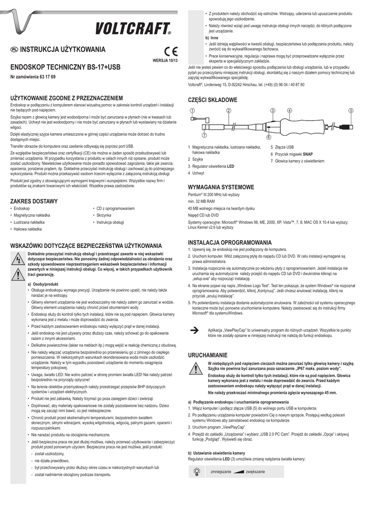 • Z produktem należy obchodzić się ostrożnie. Wstrząsy, uderzenia lub upuszczenie produktu spowodują jego uszkodzenie. • Należy również wziąć pod uwagę instrukcje obsługi innych narzędzi, do których podłączone jest urządzenie. b) Inne • Jeśli istnieją wątpliwości w kwestii obsługi, bezpieczeństwa lub podłączania produktu, należy zwrócić się do wykwalifikowanego fachowca. INSTRUKCJA UŻYTKOWANIA ENDOSKOP TECHNICZNY BS-17+USB WERSJA 10/13 Nr zamówienia 63 17 69 • Prace konserwacyjne, regulacja i naprawa mogą być przeprowadzane wyłącznie przez eksperta w specjalistycznym zakładzie. Jeśli nie jesteś pewien co do właściwego sposobu podłączenia lub obsługi urządzenia, lub w przypadku pytań po przeczytaniu niniejszej instrukcji obsługi, skontaktuj się z naszym działem pomocy technicznej lub zapytaj wykwalifikowanego specjalistę. Voltcraft®, Lindenweg 15, D-92242 Hirschau, tel. (+49) (0) 96 04 / 40 87 80 UŻYTKOWANIE ZGODNE Z PRZEZNACZENIEM Endoskop w podłączeniu z komputerem stanowi wizualną pomoc w zakresie kontroli urządzeń i instalacji nie będących pod napięciem. CZĘŚCI SKŁADOWE Szyjka razem z głowicą kamery jest wodoodporna i może być zanurzana w płynach (nie w kwasach lub zasadach). Uchwyt nie jest wodoodporny i nie może być zanurzany w płynach lub wystawiany na działanie wilgoci. Dzięki elastycznej szyjce kamera umieszczona w górnej części urządzenia może dotrzeć do trudno dostępnych miejsc. Transfer obrazów do komputera oraz zasilanie odbywają się poprzez port USB. Ze względów bezpieczeństwa oraz certyfikacji (CE) nie można w żaden sposób przebudowywać lub zmieniać urządzenia. W przypadku korzystania z produktu w celach innych niż opisane, produkt może zostać uszkodzony. Niewłaściwe użytkowanie może ponadto spowodować zagrożenia, takie jak zwarcia, oparzenia, porażenie prądem, itp. Dokładnie przeczytać instrukcję obsługi i zachować ją do późniejszego wykorzystania. Produkt można przekazywać osobom trzecim wyłącznie z załączoną instrukcją obsługi. Produkt jest zgodny z obowiązującymi wymogami krajowymi i europejskimi. Wszystkie nazwy firm i produktów są znakami towarowymi ich właścicieli. Wszelkie prawa zastrzeżone. 1 Magnetyczna nakładka, lustrzana nakładka, hakowa nakładka 5 Złącze USB 2 Szyjka 7 Głowica kamery z oświetleniem 3 Regulator oświetlenia LED 6 Przycisk migawki SNAP 4 Uchwyt WYMAGANIA SYSTEMOWE Pentium® III 200 MHz lub wyższy ZAKRES DOSTAWY min. 32 MB RAM • Endoskop • CD z oprogramowaniem 40 MB wolnego miejsca na twardym dysku • Magnetyczna nakładka • Skrzynka Napęd CD lub DVD • Lustrzana nakładka • Instrukcja obsługi Systemy operacyjne: Microsoft® Windows 98, ME, 2000, XP, Vista™, 7, 8; MAC OS X 10.4 lub wyższy; Linux Kernel v2.6 lub wyższy • Hakowa nakładka WSKAZÓWKI DOTYCZĄCE BEZPIECZEŃSTWA UŻYTKOWANIA Dokładnie przeczytać instrukcję obsługi i przestrzegać zawarte w niej wskazówki dotyczące bezpieczeństwa. Nie ponosimy żadnej odpowiedzialności za obrażenia oraz szkody spowodowane nieprzestrzeganiem wskazówek bezpieczeństwa i informacji zawartych w niniejszej instrukcji obsługi. Co więcej, w takich przypadkach użytkownik traci gwarancję. a) Osoby/produkt • Obsługa endoskopu wymaga precyzji. Urządzenie nie powinno upaść, nie należy także narażać je na wstrząsy. • Główny element urządzenia nie jest wodoszczelny nie należy zatem go zanurzać w wodzie. Główny element urządzenia należy chronić przed strumieniami wody. • Endoskop służy do kontroli tylko tych instalacji, które nie są pod napięciem. Głowica kamery wykonana jest z metalu i może doprowadzić do zwarcia. • Przed każdym zastosowaniem endoskopu należy wyłączyć prąd w danej instalacji. • Jeśli endoskop nie jest używany przez dłuższy czas, należy schować go do opakowania razem z innymi akcesoriami. INSTALACJA OPROGRAMOWANIA 1. Upewnij się, że endoskop nie jest podłączony do komputera. 2. Uruchom komputer. Włóż załączoną płytę do napędu CD lub DVD. W celu instalacji wymagane są prawa administratora. 3. Instalacja rozpocznie się automatycznie po włożeniu płyty z oprogramowaniem. Jeżeli instalacja nie uruchamia się automatycznie należy przejść do napędu CD lub DVD i dwukrotnie kliknąć na „setup.exe” aby rozpocząć instalację. 4. Na ekranie pojawi się napis „Windows Logo Test”. Test ten pokazuje, że system Windows® nie rozpoznał oprogramowania. Aby potwierdzić, kliknij „Kontynuuj”. Jeśli chcesz anulować instalację, kliknij na przycisk „anuluj instalację”. 5. Po potwierdzeniu instalacja dostanie automatycznie anulowana. W zależności od systemu operacyjnego konieczne może być ponowne uruchomienie komputera. Należy zastosować się do instrukcji firmy Microsoft® dla systemuWindows. Aplikacja „ViewPlayCap” to uniwersalny program do różnych urządzeń. Wszystkie te punkty które nie zostały opisane w niniejszej instrukcji nie należą do funkcji endoskopu. • Delikatne powierzchnie (lakier na meblach itp.) mogą wejść w reakcję chemiczną z obudową. • Nie należy włączać urządzenia bezpośrednio po przeniesieniu go z zimnego do ciepłego pomieszczenia. W niekorzystnych warunkach skondensowana woda może uszkodzić urządzenie. Należy w tym wypadku pozostawić urządzenie do momentu osiągnięcia temperatury pokojowej. • Uwaga, światło LED: Nie wolno patrzeć w stronę promieni światła LED! Nie należy patrzeć bezpośrednio na przyrządy optyczne! • Na terenie obiektów przemysłowych należy przestrzegać przepisów BHP dotyczących systemów i urządzeń elektrycznych. • Produkt nie jest zabawką. Należy trzymać go poza zasięgiem dzieci i zwierząt. • Dopilnować, aby materiały opakowaniowe nie zostały pozostawione bez nadzoru. Dzieci mogą się zacząć nimi bawić, co jest niebezpieczne. • Chronić pr