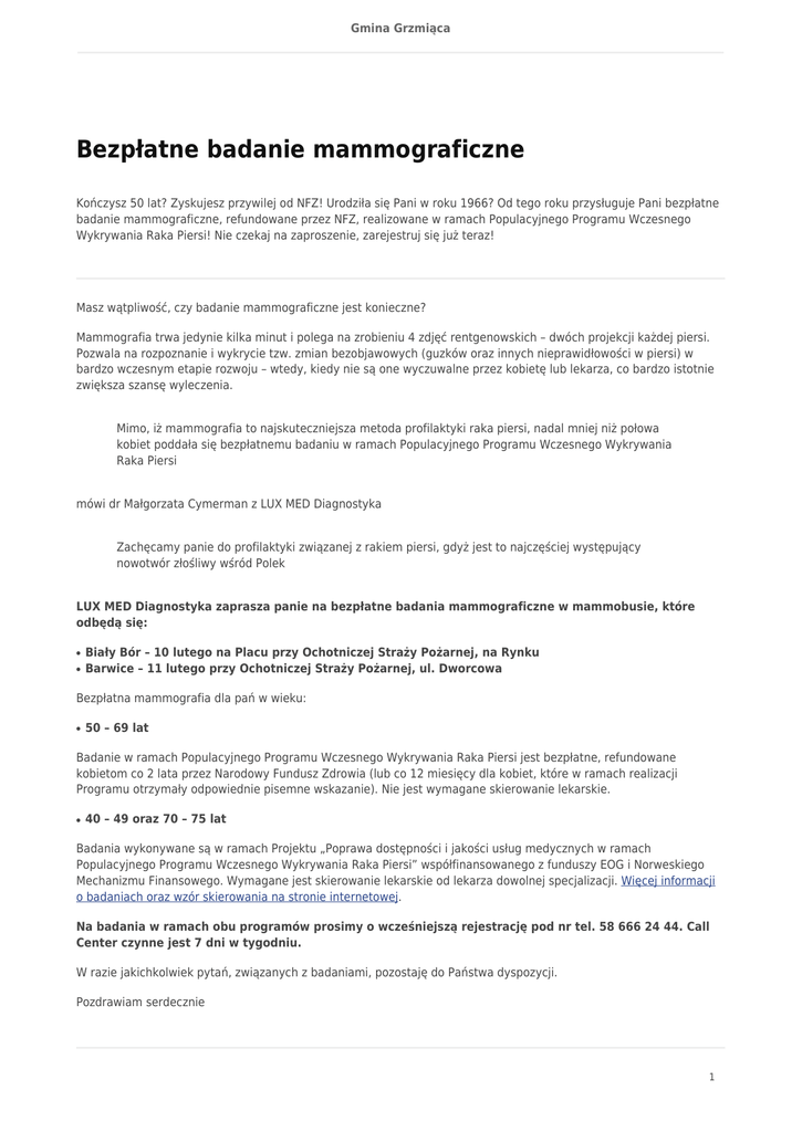 Gmina Grzmiąca Bezpłatne badanie mammograficzne Kończysz 50 lat? Zyskujesz przywilej od NFZ! Urodziła się Pani w roku 1966? Od tego roku przysługuje Pani bezpłatne badanie mammograficzne, refundowane przez NFZ, realizowane w ramach Populacyjnego Programu Wczesnego Wykrywania Raka Piersi! Nie czekaj na zaproszenie, zarejestruj się już teraz! Masz wątpliwość, czy badanie mammograficzne jest konieczne? Mammografia trwa jedynie kilka minut i polega na zrobieniu 4 zdjęć rentgenowskich – dwóch projekcji każdej piersi. Pozwala na rozpoznanie i wykrycie tzw. zmian bezobjawowych (guzków oraz innych nieprawidłowości w piersi) w bardzo wczesnym etapie rozwoju – wtedy, kiedy nie są one wyczuwalne przez kobietę lub lekarza, co bardzo istotnie zwiększa szansę wyleczenia. Mimo, iż mammografia to najskuteczniejsza metoda profilaktyki raka piersi, nadal mniej niż połowa kobiet poddała się bezpłatnemu badaniu w ramach Populacyjnego Programu Wczesnego Wykrywania Raka Piersi mówi dr Małgorzata Cymerman z LUX MED Diagnostyka Zachęcamy panie do profilaktyki związanej z rakiem piersi, gdyż jest to najczęściej występujący nowotwór złośliwy wśród Polek LUX MED Diagnostyka zaprasza panie na bezpłatne badania mammograficzne w mammobusie, które odbędą się: ● ● Biały Bór – 10 lutego na Placu przy Ochotniczej Straży Pożarnej, na Rynku Barwice – 11 lutego przy Ochotniczej Straży Pożarnej, ul. Dworcowa Bezpłatna mammografia dla pań w wieku: ● 50 – 69 lat Badanie w ramach Populacyjnego Programu Wczesnego Wykrywania Raka Piersi jest bezpłatne, refundowane kobietom co 2 lata przez Narodowy Fundusz Zdrowia (lub co 12 miesięcy dla kobiet, które w ramach realizacji Programu otrzymały odpowiednie pisemne wskazanie). Nie jest wymagane skierowanie lekarskie. ● 40 – 49 oraz 70 – 75 lat Badania wykonywane są w ramach Projektu „Poprawa dostępności i jakości usług medycznych w ramach Populacyjnego Programu Wczesnego Wykrywania Raka Piersi” współfinansowanego z funduszy EOG i Norweskiego Mechanizmu Finansowego. Wymagane jest skierowanie lekarskie od lekarza dowolnej specjalizacji. Więcej informacji o badaniach oraz wzór skierowania na stronie internetowej. Na badania w ramach obu programów prosimy o wcześniejszą rejestrację pod nr tel. 58 666 24 44. Call Center czynne jest 7 dni w tygodniu. W razie jakichkolwiek pytań, związanych z badaniami, pozostaję do Państwa dyspozycji. Pozdrawiam serdecznie 1 Gmina Grzmiąca Agata Jabłonowska Specjalista ds. Marketingu i PR LUX MED Diagnostyka, Region Mammografia, ul. Nocznickiego 8a 81-454 Gdynia m: 607 931 133 e: [email protected] 2