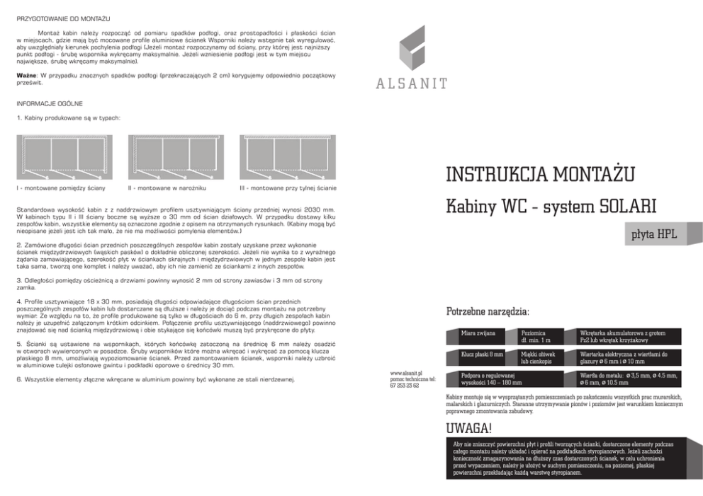 PRZYGOTOWANIE DO MONTAŻU Montaż kabin należy rozpocząć od pomiaru spadków podłogi, oraz prostopadłości i płaskości ścian w miejscach, gdzie mają być mocowane profile aluminiowe ścianek Wsporniki należy wstępnie tak wyregulować, aby uwzględniały kierunek pochylenia podłogi (Jeżeli montaż rozpoczynamy od ściany, przy której jest najniższy punkt podłogi - śrubę wspornika wykręcamy maksymalnie. Jeżeli wzniesienie podłogi jest w tym miejscu największe, śrubę wkręcamy maksymalnie). Ważne: W przypadku znacznych spadków podłogi (przekraczających 2 cm) korygujemy odpowiednio początkowy prześwit. INFORMACJE OGÓLNE 1. Kabiny produkowane są w typach: I - montowane pomiędzy ściany II - montowane w narożniku INSTRUKCJA MONTAŻU III - montowane przy tylnej ścianie Kabiny WC - system SOLARI Standardowa wysokość kabin z z naddrzwiowym profilem usztywniającym ściany przedniej wynosi 2030 mm. W kabinach typu II i III ściany boczne są wyższe o 30 mm od ścian działowych. W przypadku dostawy kilku zespołów kabin, wszystkie elementy są oznaczone zgodnie z opisem na otrzymanych rysunkach. (Kabiny mogą być nieopisane jeżeli jest ich tak mało, że nie ma możliwości pomylenia elementów.) płyta HPL 2. Zamówione długości ścian przednich poszczególnych zespołów kabin zostały uzyskane przez wykonanie ścianek międzydrzwiowych (wąskich pasków) o dokładnie obliczonej szerokości. Jeżeli nie wynika to z wyraźnego żądania zamawiającego, szerokość płyt w ściankach skrajnych i międzydrzwiowych w jednym zespole kabin jest taka sama, tworzą one komplet i należy uważać, aby ich nie zamienić ze ściankami z innych zespołów. 3. Odległości pomiędzy ościeżnicą a drzwiami powinny wynosić 2 mm od strony zawiasów i 3 mm od strony zamka. 4. Profile usztywniające 18 x 30 mm, posiadają długości odpowiadające długościom ścian przednich poszczególnych zespołów kabin lub dostarczane są dłuższe i należy je dociąć podczas montażu na potrzebny wymiar. Ze względu na to, że profile produkowane są tylko w długościach do 6 m, przy długich zespołach kabin należy je uzupełnić załączonym krótkim odcinkiem. Połączenie profilu usztywniającego (naddrzwiowego) powinno znajdować się nad ścianką międzydrzwiową i obie stykające się końcówki muszą być przykręcone do płyty. 5. Ścianki są ustawione na wspornikach, których końcówkę zatoczoną na średnicę 6 mm należy osadzić w otworach wywierconych w posadzce. Śruby wsporników które można wkręcać i wykręcać za pomocą klucza płaskiego 8 mm, umożliwiają wypoziomowanie ścianek. Przed zamontowaniem ścianek, wsporniki należy uzbroić w aluminiowe tulejki osłonowe gwintu i podkładki oporowe o średnicy 30 mm. 6. Wszystkie elementy złączne wkręcane w aluminium powinny być wykonane ze stali nierdzewnej. www.alsanit.pl pomoc techniczna tel: 67 253 23 62 Miara zwijana Poziomica ��������� dł. min. 1 m Wkrętarka akumulatorowa z grotem ������ Pz2 lub wkrętak krzyżakowy Miękki ołówek Klucz płaski 8 mm ��������� lub cienkopis Miękkiołówek ołówek Miękki ��������� lubcienkopis cienkopis lub Wiertarka elektryczna z wiertłami do ������ glazury 6 mm i 10 mm Podpora o regulowanej wysokości 140 – 180 mm ��������� Wiertła do metalu: 3,5 mm, 4.5 mm, ������ 6 mm, 10.5 mm Kabiny montuje się w wysprzątanych pomieszczeniach po zakończeniu wszystkich prac murarskich, malarskich i glazurniczych. Staranne utrzymywanie pionów i poziomów jest warunkiem koniecznym poprawnego zmontowania zabudowy. UWAGA! Aby nie zniszczyć powierzchni płyt i profili tworzących ścianki, dostarczone elementy podczas całego montażu należy układać i opierać na podkładkach styropianowych. Jeżeli zachodzi konieczność zmagazynowania na dłuższy czas dostarczonych ścianek, w celu uchronienia przed wypaczeniem, należy je ułożyć w suchym pomieszczeniu, na poziomej, płaskiej powierzchni przekładając każdą warstwę styropianem. informacje ogólne znajdziesz na ostatniej stronie Kabiny WC - system SOLARI UWAGA! W celu usprawnienia pracy prosimy zwracać uwagę na kolejność wykonywanych prac. Kolejne kroki oznaczone są dużymi cyframi. 1 osłona rdzenia wspornika reg. 2 2 podstawka pod wspornik reg. 3 1. Po zamontowaniu wszystkich elementów zamontuj naddrzwiowy profil usztywniający, (profil prostokątny 18 x 30 mm) który dostarczany jest z pewnym naddatkiem i należy go przyciąć do odpowiedniej długości. 2. Sprawdź długość profilu usztywniającego, jeżeli zachodzi potrzeba przytnij go na właściwą długość. 3. Umieść profil na górze, tuż za ścianką międzydrzwiową. Po wypionowaniu ścianki międzydrzwiowej, zaznacz na profilu w połowie jego wysokości punkty, naprzeciw nagwintowanych otworów do mocowania profilu. 4. W zaznaczonych punktach przewierć profil wiertłem 6 a następnie rozwierć tylny otwór wiertłem 10,5 . 5. Przykręć profil usztywniający do ścianek międzydrzwiowych. 3 kołek rozporowy 4 wkręt ścianka działowa 5 zaślepka okrągła 6 wkręt M6 7 zamkopochwyt 8 9 10 11 12 1. Po upewnieniu się że element przyścienny kabiny ustawiony jest pionowo, zaznacz na ścianie położenie profilu przylegającego do ściany, wyjmij płytę z profilu i w osiach otworów w profilu wyznacz na ścianie punkty. 2. Odstaw element przyścienny i w zaznaczonych punktach wywierć otwory 10 mm o głębokości 60 mm i wsuń w nie dostarczone w zestawie kołki rozporowe. 3. Przykręć profil do ściany, wsuń w gniazdo i wypionuj płytę. Po wywierceniu w linii zagłębienia na boku profilauotworów 3,5 mm przez wewnętrzna ściankę profilu i płytę przykręć płytę do profilu wkrętami 4,2 x 10 mm. Uwaga: Otwory w profilu należy rozwiercić wiertłem 4,5 mm 4. Przykręć do profilu ścianki międzydrzwiowej 