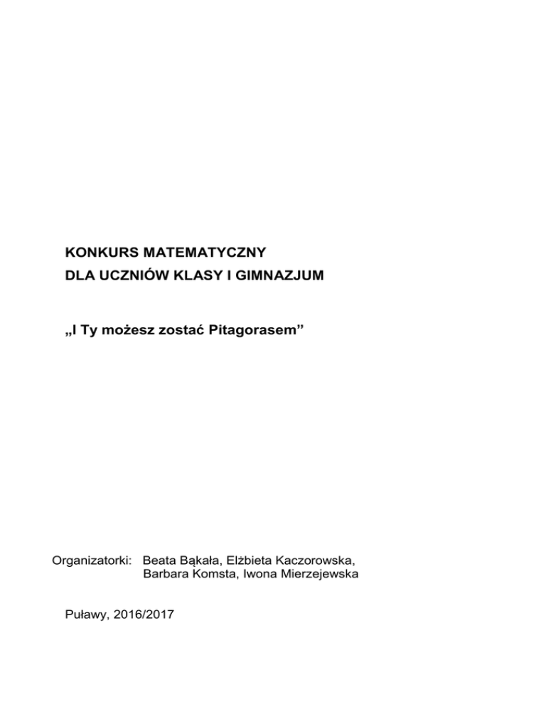 KONKURS MATEMATYCZNY DLA UCZNIÓW KLASY I GIMNAZJUM „I Ty możesz zostać Pitagorasem” Organizatorki: Beata Bąkała, Elżbieta Kaczorowska, Barbara Komsta, Iwona Mierzejewska Puławy, 2016/2017 REGULAMIN KONKURSU W ROKU SZKOLNYM 2016/2017 I. POSTANOWIENIA OGÓLNE §1 1. Konkurs przygotowują i przeprowadzają nauczycielki matematyki w Zespole Szkół Ogólnokształcących nr 1 w Puławach: Beata Bąkała, Elżbieta Kaczorowska, Barbara Komsta, Iwona Mierzejewska. 2. Konkurs jest adresowany do uczniów klas pierwszych IV Gimnazjum w ZSO nr 1 w Puławach. 3. Pierwszy etap konkursu ma charakter indywidualny, drugi i trzeci zespołowy. 4. Do rozwiązania zadań wystarczą wiadomości z programu nauczania matematyki w pierwszej klasie gimnazjum. §2 1. Regulamin jest niezmienny w ciągu roku szkolnego. 2. Regulamin konkursu zawiera w szczególności: Liczbę stopni konkursu oraz ich charakterystykę. Preferencje wynikające z udziału w konkursie. 3. Uczniowie przystępują do konkursu dobrowolnie. §3 1. Zadania przygotowują organizatorki. 2. Zadania konkursowe do czasu rozpoczęcia etapu są objęte tajemnicą. II. ORGANIZACJA 1. W pierwszym indywidualnym etapie konkursu uczniowie klas pierwszych gimnazjum będą rozwiązywać sprawdzian wiedzy matematycznej (test wyboru). Trzy osoby z każdej klasy, które uzyskają najlepsze wyniki zakwalifikują się do drugiego etapu. W przypadku kilku osób, które uzyskałyby taką samą liczbę punktów, rozstrzygające będą oceny z matematyki. 2. W drugim etapie konkursu uczniowie będą pracować w trzyosobowych zespołach klasowych. Organizatorki przygotowują zadania w czterech wariantach: za jeden punkt, za dwa punkty, za trzy punkty, za cztery punkty, w zależności od stopnia trudności. Zespoły przez dwadzieścia minut będą rozwiązywały zadania, każdorazowo wybierając rodzaj zadania. Uczniowie mogą korzystać z pomocy podręcznika lub kalkulatora, ale wtedy otrzymują połowę punktów przewidzianych za rozwiązanie zadania. Należy wykonać i zapisać wszystkie niezbędne etapy rozwiązania na przygotowanych arkuszach papieru. Po upływie określonego czasu organizatorki sprawdzają rozwiązania i podliczają punkty. Trzy zespoły, które uzyskały najwięcej punktów przechodzą do następnego etapu. W przypadku gdy na trzecim miejscu znajdą się dwa zespoły z taką samą liczbą punktów odbędzie się dogrywka. Każdy zespół będzie miał do rozwiązania jedno zadanie (jednakowe dla obu grup). Do dalszego etapu przechodzi ten zespół, który pierwszy rozwiąże to zadanie. 3. W trzecim etapie rywalizują ze sobą trzy zespoły. Mają w ciągu 60 minut rozwiązać trzy zadania otwarte, jednakowe dla wszystkich zespołów. Dodatkowym elementem będzie prezentacja rozwiązania jednego zadania przez każdy zespół. Wybór zadania oraz osoby rozwiązującej odbędzie się na drodze losowania. W przypadku błędnego rozwiązania lub braku rozwiązania przez wylosowaną osobę zespół traci punkty uzyskane za rozwiązanie tego zadania. W tym etapie nie można korzystać z kalkulatora. Numer etapu 1 2 3 Termin 19.12.2016 09.01.2017 13.02.2017 4. Decyzję szkolnych organizatorek konkursu uważa się za ostateczną. III. PREFERENCJE 1. Osoby, które zakwalifikują się do drugiego etapu otrzymują ocenę bardzo dobrą z matematyki. 2. Osoby, które przejdą do trzeciego etapu otrzymują ocenę bardzo dobrą z matematyki. 3. Zespół zwycięski otrzymuje ocenę celującą z matematyki. CEL KONKURSU 1. Rozbudzanie i rozwijanie wśród uczniów zainteresowań matematycznych. 2. Stworzenie uczniom zainteresowanym matematyką szansy na konfrontację swoich możliwości z możliwościami innych uczniów. 3. Umożliwienie uczniom uzdolnionym matematycznie odniesienie sukcesu na początku edukacji w gimnazjum (większość konkursów jest adresowana dla uczniów klas trzecich). 4. Poszukiwanie, a następnie promowanie, uczniów utalentowanych matematycznie. 5. Budowanie odpowiedniej strategii gry. 6. Uczenie się podejmowania decyzji uzgodnionych w wyniku negocjacji. 7. Nabywanie umiejętności pracy w zespole. 8. Uczenie się od uczniów w grupie, przekazywanie swojej wiedzy kolegom. PROGRAM MERYTORYCZNY KONKURSU 1. Działania w zbiorze liczb wymiernych. 2. Obliczenia procentowe. 3. Działania na wyrażeniach algebraicznych. 4. Równania i nierówności liniowe. 5. Pola figur płaskich. 6. Podstawowe konstrukcje geometryczne. OCENIANE UMIEJĘTNOŚCI 1. Rozumienie tekstu matematycznego. 2. Umiejętność uporządkowania i czytelnego przedstawienia rozwiązania. 3. Umiejętność analizowania napotkanych problemów o charakterze matematycznym i ich rozwiązywania. 4. Sprawność w wykonywaniu przekształceń rachunkowych, w wykonywaniu rysunków geometrycznych. 5. Wybór najlepszej strategii postępowania. 6. Umiejętność współdziałania w zespole. NARZĘDZIA POMIARU DYDAKTYCZNEGO Każdy etap konkursu będzie przeliczany na punkty, warunkiem przejścia na wyższy etap jest uzyskanie większej liczby punktów niż pozostali uczestnicy.
