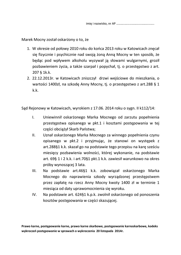 imię i nazwisko, nr AP ………..……………………………….. Marek Mocny został oskarżony o to, że 1. W okresie od połowy 2010 roku do końca 2013 roku w Katowicach znęcał się fizycznie i psychicznie nad swoją żoną Anną Mocny w ten sposób, że będąc pod wpływem alkoholu wyzywał ją słowami wulgarnymi, groził pozbawieniem życia, a także szarpał i popychał, tj. o przestępstwo z art. 207 § 1k.k. 2. 22.12.2013r. w Katowicach zniszczył drzwi wejściowe do mieszkania, o wartości 1400zł, na szkodę Anny Mocny, tj. o przestępstwo z art.288 § 1 k.k. Sąd Rejonowy w Katowicach, wyrokiem z 17.06. 2014 roku o sygn. II k112/14: I. II. III. IV. Uniewinnił oskarżonego Marka Mocnego od zarzutu popełnienia przestępstwa opisanego w pkt.1 i kosztami postępowania w tej części obciążył Skarb Państwa; Uznał oskarżonego Marka Mocnego za winnego popełnienia czynu opisanego w pkt.2 i przyjmując, że stanowi on występek z art.288§1 k.k. skazał go na podstawie tego przepisu na karę sześciu miesięcy pozbawienia wolności, której wykonanie, na podstawie art. 69§ 1 i 2 k.k. i art.70§1 pkt.1 k.k. zawiesił warunkowo na okres próby wynoszącej 3 lata. Na podstawie art.46§1 k.k. zobowiązał oskarżonego Marka Mocnego do naprawienia szkody wyrządzonej przestępstwem przez zapłatę na rzecz Anny Mocny kwoty 1400 zł w terminie 1 miesiąca od daty uprawomocnienia się wyroku. Na podstawie art. 624§1 k.p.k. zwolnił oskarżonego od ponoszenia kosztów postępowania w części skazującej. Prawo karne, postępowanie karne, prawo karne skarbowe, postępowanie karnoskarbowe, kodeks wykroczeń postępowanie w sprawach o wykroczenia 20 listopada 2014r. Materiał dowodowy sprawy . Oskarżony (ur.10.o1.1969 r. w Katowicach syn Jana) w toku postępowania złożył wyjaśnienia w których: Przyznał się do zniszczenia drzwi i podał, że zrobił to sprowokowany przez żonę, która nie chciała ich otworzyć. Mieszkanie stanowi odrębny majątek żony. Nie zapłacił za spowodowaną szkodę, bo nie ma pieniędzy. Pracuje dorywczo, zarabiając tylko po kilkaset złotych miesięcznie. Nie przyznał się natomiast do znęcania nad żoną. Podał, że zdarza mu się wypić alkohol i wówczas żona ,która tego nie akceptuje, awanturuje się. W czasie kłótni czasem wyzwał żonę i jej groził, ale zawsze był do tego prowokowany i miało to charakter wzajemny, podobnie jak szarpanie się. Anna Mocny w swoich zeznaniach w dochodzeniu i na rozprawie konsekwentnie potwierdziła postawiony oskarżonemu zarzut znęcania się nad nią przez wielokrotne wyzywanie, grożenie i naruszanie jej nietykalności cielesnej, począwszy od połowy 2010 r., każdorazowo pod wpływem alkoholu. Zaprzeczyła, by prowokowała męża. Zeznała, że ich małżeństwo, z którego pochodzi córka Monika, obecnie lat 18, układało się dobrze do początku 2010 roku, kiedy to oskarżony stracił stałą pracę i zaczął nadużywać alkoholu, czemu się sprzeciwiała. Do awantur dochodziło czasem również w obecności córki i jej ojca Tadeusza Brzozy, z którym wspólnie zamieszkiwali i który zmarł w lutym 2014 roku. Zeznała, że oskarżony zarabia tylko dorywczo, a pieniądze przeznacza głównie na alkohol. To ona utrzymuje dom i córkę. 22.12.2013 roku rzeczywiście nie wpuściła męża do domu, gdyż był nietrzeźwy i już przed drzwiami się awanturował. Drzwi do mieszkania, które oskarżony całkowicie zniszczył przy użyciu siekiery, kosztowały 1400 zł. ale ich wymiana kosztowała ją łącznie z robocizną 1520 zł., na co okazała rachunek . Domagając się ukarania męża za zniszczenie mienia stanowiącego jej odrębną własność wniosła o to, by Sąd zobowiązał oskarżonego do zapłaty na jej rzecz 1520zł. Córka stron, Monika Mocny, w postępowaniu przygotowawczym złożyła zeznania częściowo obciążające oskarżonego. Na rozprawie odmówiła składania zeznań. Prawo karne, postępowanie karne, prawo karne skarbowe, postępowanie karnoskarbowe, kodeks wykroczeń postępowanie w sprawach o wykroczenia 20 listopada 2014r. W postępowaniu przygotowawczym zeznania złożył także Tadeusz Brzoza, ojciec Anny Mocny, który był wielokrotnie świadkiem awantur i potwierdził zeznania córki. Na rozprawie nie został przesłuchany, bo wcześniej zmarł. Zeznań tych świadków (Moniki Mocnej i Tadeusza Brzozy) Sąd Rejonowy nie ujawnił. Sąd ujawnił wywiad środowiskowy, z którego wynika, że oskarżony nadużywa alkoholu, oraz kartę karną, wskazującą na to, że nie był on dotychczas karany. Z uzasadnienia wyroku wynika, że co do zarzutu drugiego, Sąd oparł się na wyjaśnieniach oskarżonego i zeznaniach pokrzywdzonej z tym, że obowiązek naprawienia szkody ograniczył do kwoty 1400 zł. ze względu na to, że tyle wyniosła wartość zniszczonych drzwi. W ocenie Sądu brak jest natomiast wystarczających dowodów winy oskarżonego w zakresie pierwszego zarzutu. Oskarżony nie przyznał się do znęcania nad żoną, a jej zeznania w tym przedmiocie nie znajdują potwierdzenia w innych dowodach. Córka odmówiła bowiem zeznań, a ojciec zmarł, co – w świetle uregulowań wynikających z art. 391§1 i 182§1 k.p.k.- nie pozwalało Sądowi na odczytanie ich zeznań z dochodzenia i włączenie do materiału dowodowego sprawy. Zwalniając oskarżonego od kosztów postępowania dotyczącego drugiego czynu Sąd miał na uwadze, że nie ma on stałej pracy zarobkowej. Proszę przygotować apelację radcy prawnego od w/w wyroku w imieniu oskarżycielki posiłkowej Anny Mocnej, bądź opinię o braku podstaw do jej wniesienia. Oskarżycielka posiłkowa otrzymała odpis wyroku z uzasadnieniem 10.07.2014 roku. Prawo karne, postępowanie karne, prawo karne skarbowe, postępowanie karnoskarbowe, kodeks wykroczeń postępowanie w sprawach o wykroczenia 20 listopada 2014r.