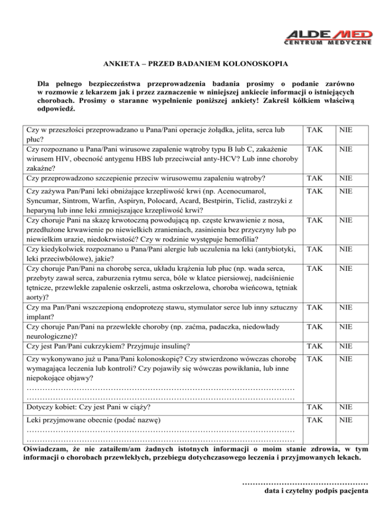 ANKIETA – PRZED BADANIEM KOLONOSKOPIA Dla pełnego bezpieczeństwa przeprowadzenia badania prosimy o podanie zarówno w rozmowie z lekarzem jak i przez zaznaczenie w niniejszej ankiecie informacji o istniejących chorobach. Prosimy o staranne wypełnienie poniższej ankiety! Zakreśl kółkiem właściwą odpowiedź. Czy w przeszłości przeprowadzano u Pana/Pani operacje żołądka, jelita, serca lub płuc? Czy rozpoznano u Pana/Pani wirusowe zapalenie wątroby typu B lub C, zakażenie wirusem HIV, obecność antygenu HBS lub przeciwciał anty-HCV? Lub inne choroby zakaźne? Czy przeprowadzono szczepienie przeciw wirusowemu zapaleniu wątroby? TAK NIE TAK NIE TAK NIE Czy zażywa Pan/Pani leki obniżające krzepliwość krwi (np. Acenocumarol, Syncumar, Sintrom, Warfin, Aspiryn, Polocard, Acard, Bestpirin, Ticlid, zastrzyki z heparyną lub inne leki zmniejszające krzepliwość krwi? Czy choruje Pani na skazę krwotoczną powodującą np. częste krwawienie z nosa, przedłużone krwawienie po niewielkich zranieniach, zasinienia bez przyczyny lub po niewielkim urazie, niedokrwistość? Czy w rodzinie występuje hemofilia? Czy kiedykolwiek rozpoznano u Pana/Pani alergie lub uczulenia na leki (antybiotyki, leki przeciwbólowe), jakie? Czy choruje Pan/Pani na chorobę serca, układu krążenia lub płuc (np. wada serca, przebyty zawał serca, zaburzenia rytmu serca, bóle w klatce piersiowej, nadciśnienie tętnicze, przewlekłe zapalenie oskrzeli, astma oskrzelowa, choroba wieńcowa, tętniak aorty)? Czy ma Pan/Pani wszczepioną endoprotezę stawu, stymulator serce lub inny sztuczny implant? Czy choruje Pan/Pani na przewlekłe choroby (np. zaćma, padaczka, niedowłady neurologiczne)? Czy jest Pan/Pani cukrzykiem? Przyjmuje insulinę? TAK NIE TAK NIE TAK NIE TAK NIE TAK NIE TAK NIE TAK NIE Czy wykonywano już u Pana/Pani kolonoskopię? Czy stwierdzono wówczas chorobę wymagająca leczenia lub kontroli? Czy pojawiły się wówczas powikłania, lub inne niepokojące objawy? ………………………………………………………………………………………… ………………………………………………………………………………………… Dotyczy kobiet: Czy jest Pani w ciąży? TAK NIE TAK NIE Leki przyjmowane obecnie (podać nazwę) TAK NIE ………………………………………………………………………………………… ………………………………………………………………………………………… Oświadczam, że nie zataiłem/am żadnych istotnych informacji o moim stanie zdrowia, w tym informacji o chorobach przewlekłych, przebiegu dotychczasowego leczenia i przyjmowanych lekach. ………………………………………… data i czytelny podpis pacjenta