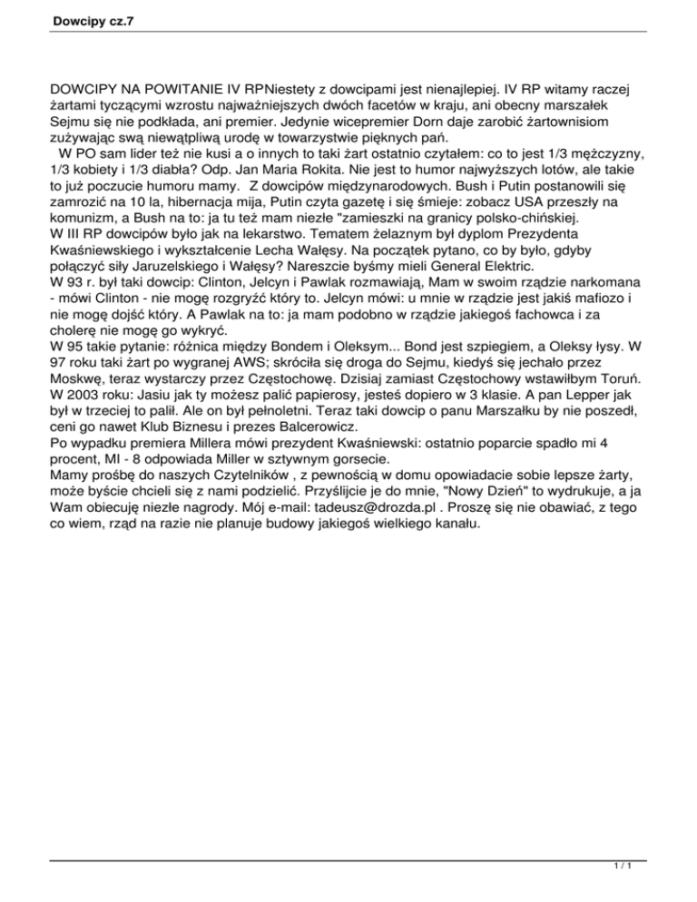 Dowcipy cz.7 DOWCIPY NA POWITANIE IV RPNiestety z dowcipami jest nienajlepiej. IV RP witamy raczej żartami tyczącymi wzrostu najważniejszych dwóch facetów w kraju, ani obecny marszałek Sejmu się nie podkłada, ani premier. Jedynie wicepremier Dorn daje zarobić żartownisiom zużywając swą niewątpliwą urodę w towarzystwie pięknych pań. W PO sam lider też nie kusi a o innych to taki żart ostatnio czytałem: co to jest 1/3 mężczyzny, 1/3 kobiety i 1/3 diabła? Odp. Jan Maria Rokita. Nie jest to humor najwyższych lotów, ale takie to już poczucie humoru mamy. Z dowcipów międzynarodowych. Bush i Putin postanowili się zamrozić na 10 la, hibernacja mija, Putin czyta gazetę i się śmieje: zobacz USA przeszły na komunizm, a Bush na to: ja tu też mam niezłe "zamieszki na granicy polsko-chińskiej. W III RP dowcipów było jak na lekarstwo. Tematem żelaznym był dyplom Prezydenta Kwaśniewskiego i wykształcenie Lecha Wałęsy. Na początek pytano, co by było, gdyby połączyć siły Jaruzelskiego i Wałęsy? Nareszcie byśmy mieli General Elektric. W 93 r. był taki dowcip: Clinton, Jelcyn i Pawlak rozmawiają, Mam w swoim rządzie narkomana - mówi Clinton - nie mogę rozgryźć który to. Jelcyn mówi: u mnie w rządzie jest jakiś mafiozo i nie mogę dojść który. A Pawlak na to: ja mam podobno w rządzie jakiegoś fachowca i za cholerę nie mogę go wykryć. W 95 takie pytanie: różnica między Bondem i Oleksym... Bond jest szpiegiem, a Oleksy łysy. W 97 roku taki żart po wygranej AWS; skróciła się droga do Sejmu, kiedyś się jechało przez Moskwę, teraz wystarczy przez Częstochowę. Dzisiaj zamiast Częstochowy wstawiłbym Toruń. W 2003 roku: Jasiu jak ty możesz palić papierosy, jesteś dopiero w 3 klasie. A pan Lepper jak był w trzeciej to palił. Ale on był pełnoletni. Teraz taki dowcip o panu Marszałku by nie poszedł, ceni go nawet Klub Biznesu i prezes Balcerowicz. Po wypadku premiera Millera mówi prezydent Kwaśniewski: ostatnio poparcie spadło mi 4 procent, MI - 8 odpowiada Miller w sztywnym gorsecie. Mamy prośbę do naszych Czytelników , z pewnością w domu opowiadacie sobie lepsze żarty, może byście chcieli się z nami podzielić. Przyślijcie je do mnie, "Nowy Dzień" to wydrukuje, a ja Wam obiecuję niezłe nagrody. Mój e-mail: [email protected] . Proszę się nie obawiać, z tego co wiem, rząd na razie nie planuje budowy jakiegoś wielkiego kanału. 1/1