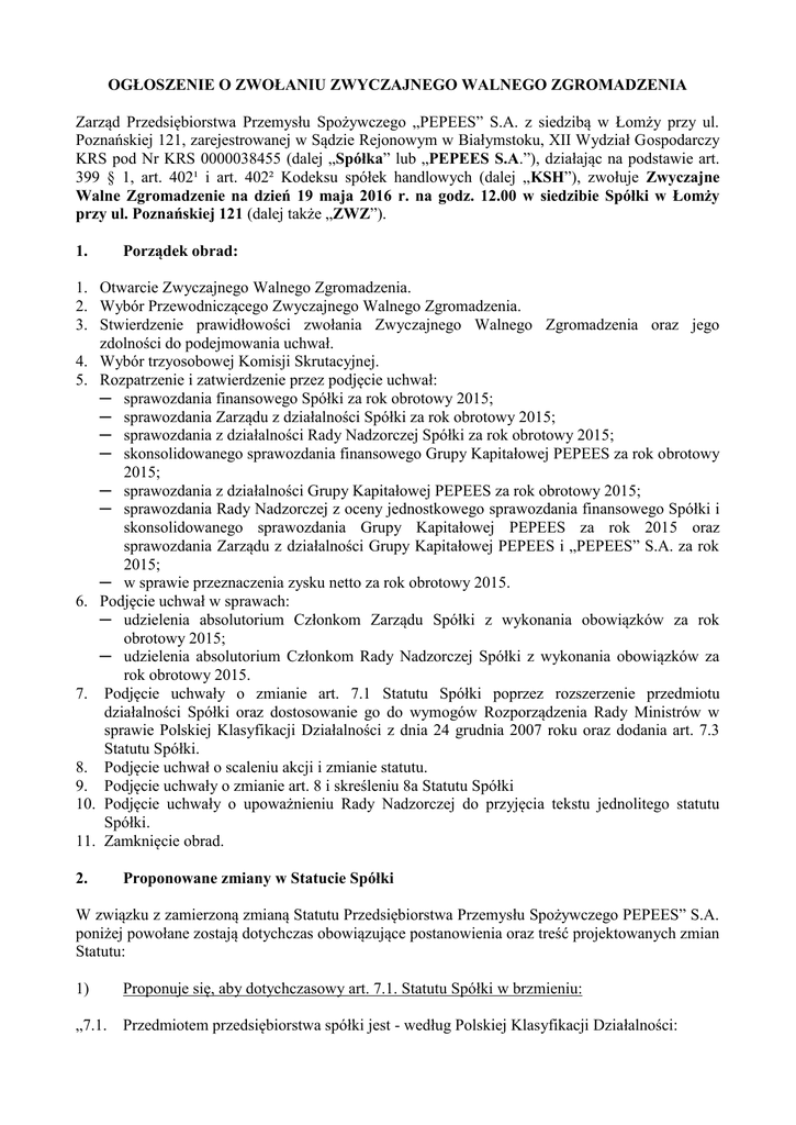 OGŁOSZENIE O ZWOŁANIU ZWYCZAJNEGO WALNEGO ZGROMADZENIA Zarząd Przedsiębiorstwa Przemysłu Spożywczego „PEPEES” S.A. z siedzibą w Łomży przy ul. Poznańskiej 121, zarejestrowanej w Sądzie Rejonowym w Białymstoku, XII Wydział Gospodarczy KRS pod Nr KRS 0000038455 (dalej „Spółka” lub „PEPEES S.A.”), działając na podstawie art. 399 § 1, art. 402¹ i art. 402² Kodeksu spółek handlowych (dalej „KSH”), zwołuje Zwyczajne Walne Zgromadzenie na dzień 19 maja 2016 r. na godz. 12.00 w siedzibie Spółki w Łomży przy ul. Poznańskiej 121 (dalej także „ZWZ”). 1. Porządek obrad: 1. Otwarcie Zwyczajnego Walnego Zgromadzenia. 2. Wybór Przewodniczącego Zwyczajnego Walnego Zgromadzenia. 3. Stwierdzenie prawidłowości zwołania Zwyczajnego Walnego Zgromadzenia oraz jego zdolności do podejmowania uchwał. 4. Wybór trzyosobowej Komisji Skrutacyjnej. 5. Rozpatrzenie i zatwierdzenie przez podjęcie uchwał: ─ sprawozdania finansowego Spółki za rok obrotowy 2015; ─ sprawozdania Zarządu z działalności Spółki za rok obrotowy 2015; ─ sprawozdania z działalności Rady Nadzorczej Spółki za rok obrotowy 2015; ─ skonsolidowanego sprawozdania finansowego Grupy Kapitałowej PEPEES za rok obrotowy 2015; ─ sprawozdania z działalności Grupy Kapitałowej PEPEES za rok obrotowy 2015; ─ sprawozdania Rady Nadzorczej z oceny jednostkowego sprawozdania finansowego Spółki i skonsolidowanego sprawozdania Grupy Kapitałowej PEPEES za rok 2015 oraz sprawozdania Zarządu z działalności Grupy Kapitałowej PEPEES i „PEPEES” S.A. za rok 2015; ─ w sprawie przeznaczenia zysku netto za rok obrotowy 2015. 6. Podjęcie uchwał w sprawach: ─ udzielenia absolutorium Członkom Zarządu Spółki z wykonania obowiązków za rok obrotowy 2015; ─ udzielenia absolutorium Członkom Rady Nadzorczej Spółki z wykonania obowiązków za rok obrotowy 2015. 7. Podjęcie uchwały o zmianie art. 7.1 Statutu Spółki poprzez rozszerzenie przedmiotu działalności Spółki oraz dostosowanie go do wymogów Rozporządzenia Rady Ministrów w sprawie Polskiej Klasyfikacji Działalności z dnia 24 grudnia 2007 roku oraz dodania art. 7.3 Statutu Spółki. 8. Podjęcie uchwał o scaleniu akcji i zmianie statutu. 9. Podjęcie uchwały o zmianie art. 8 i skreśleniu 8a Statutu Spółki 10. Podjęcie uchwały o upoważnieniu Rady Nadzorczej do przyjęcia tekstu jednolitego statutu Spółki. 11. Zamknięcie obrad. 2. Proponowane zmiany w Statucie Spółki W związku z zamierzoną zmianą Statutu Przedsiębiorstwa Przemysłu Spożywczego PEPEES” S.A. poniżej powołane zostają dotychczas obowiązujące postanowienia oraz treść projektowanych zmian Statutu: 1) Proponuje się, aby dotychczasowy art. 7.1. Statutu Spółki w brzmieniu: „7.1. Przedmiotem przedsiębiorstwa spółki jest - według Polskiej Klasyfikacji Działalności: 15.31.Z 15.33.B 15.32.Z 15.62.Z 15.71.Z 15.92.Z 15.96.Z 15.97.Z 15.98.Z 28.51.Z 28.72.Z 29.24.A 40.30.A 40.30.B 41.00.A 41.00.B 51.31.Z 51.34.A 51.34.B 51.38.B 52.21.Z 52.25.Z 60.24.A 60.24.B 60.24.C 63.12.C 70.20.Z 71.10.Z 71.21.Z 71.34.Z 73.10.E 74.14.A 74.15.Z 74.60.Z 74.70.Z 90.00.C 90.00.D 93.05.Z Przetwórstwo ziemniaków Działalność usługowa związana z przetwórstwem i konserwowaniem warzyw i owoców Produkcja soków z owoców i warzyw Wytwarzanie skrobi i produktów skrobiowych Produkcja pasz dla zwierząt gospodarskich Produkcja alkoholu etylowego Produkcja piwa Produkcja słodów Produkcja wód mineralnych i napojów bezalkoholowych Obróbka metali i nakładanie powłok na metale Produkcja opakowań z metali lekkich Produkcja pozostałych maszyn ogólnego przeznaczenia gdzie indziej nie sklasyfikowana, z wyjątkiem działalności usługowej Produkcja ciepła (pary wodnej i gorącej wody) Dystrybucja ciepła (pary wodnej i gorącej wody) Pobór i uzdatnianie wody, z wyjątkiem działalności usługowej Działalność usługowa w zakresie rozprowadzania wody Sprzedaż hurtowa owoców i warzyw Sprzedaż hurtowa napojów alkoholowych Sprzedaż hurtowa napojów bezalkoholowych Sprzedaż hurtowa pozostałej żywności Sprzedaż detaliczna owoców i warzyw Sprzedaż detaliczna napojów alkoholowych i bezalkoholowych Towarowy transport drogowy pojazdami specjalizowanymi Towarowy transport drogowy pojazdami uniwersalnymi Wynajem samochodów ciężarowych z kierowcą Magazynowanie i przechowywanie towarów w pozostałych składowiskach Wynajem nieruchomości na własny rachunek Wynajem samochodów osobowych Wynajem pozostałych środków transportu lądowego Wynajem pozostałych maszyn i urządzeń Prace badawczo-rozwojowe w dziedzinie nauk leśnych, rolniczych i weterynaryjnych Doradztwo w zakresie prowadzenia działalności gospodarczej i zarządzania Działalność związana z zarządzaniem holdingiem Działalność dochodzeniowa, detektywistyczna i ochroniarska Sprzątanie i czyszczenie obiektów Usługi sanitarne i pokrewne Odprowadzanie ścieków Pozostała działalność usługowa, gdzie indziej nie sklasyfikowana" został rozszerzony oraz dostosowany do wymogów Rozporządzenia Rady Ministrów w sprawie Polskiej Klasyfikacji Działalności z dnia 24 grudnia 2007 roku i otrzymał następujące brzmienie: „7.1. Przedmiotem działalności Spółki jest - według Polskiej Klasyfikacji Działalności: 10.31.Z Przetwarzanie i konserwowanie ziemniaków 10.32.Z Produkcja soków z owoców i warzyw 10.39.Z Pozostałe przetwarzanie i konserwowanie owoców i warzyw 10.62.Z Wytwarzanie skrobi i wyrobów skrobiowych 10.91.Z Produkcja gotowej paszy dla zwierząt gospodarskich 11.01.Z 11.05.Z 11.06.Z 11.07.Z 25.61.Z 25.92.Z 28.29.Z 35.11.Z 35.12.Z 35.13.Z 35.14.Z 35.30.Z 36.00.Z 37.00.Z 38.11.Z 38.21.Z 39.00.Z 46.31.Z 46.34.A 46.34.B 47.21.Z 47.25.Z 49.41.Z 52.10.A 52.10.B 64.20.Z 68.20.Z 70.10.Z 70.21.Z 70.22.Z 72.19.Z 74.90.Z 77.11.Z 77.12.Z 77.39.Z 80.20.Z 81.21.Z 81.22.Z 81.29.Z 85.60.Z 96.09.Z Destylowanie, rektyfikowanie i mieszanie alkoholi Produkcj