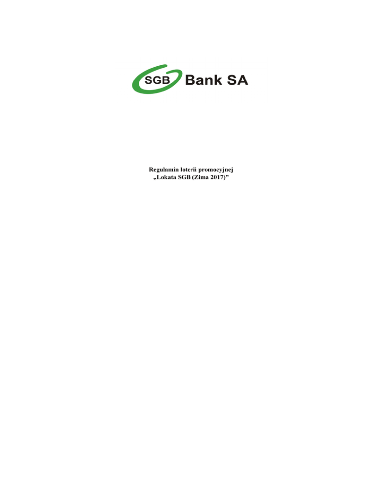 Regulamin loterii promocyjnej „Lokata SGB (Zima 2017)” SPIS TREŚCI Rozdział 1 Postanowienia ogólne ………………………………………………..………..…2 Rozdział 2 Losowanie, powiadomienie o wynikach, odbiór nagród ……………………....4 Rozdział 3 Prawidłowość urządzania loterii ………………………………..………..……..6 Rozdział 4 Reklamacje, przedawnienia roszczeń ………………………………….….…....7 Rozdział 5 Postanowienia końcowe ………………………………...………………….…….8 ZAŁĄCZNIKI: 1. Załącznik nr 1 – Lista banków spółdzielczych SGB ze wskazaniem grupy Uczestników oraz rodzaju, ilości losowanych nagród II stopnia w danym banku w loterii promocyjnej „Lokata SGB (Zima 2017)” 2. Załącznik nr 2 oraz Załącznik nr 3 – Oświadczenie Klienta 1 Rozdział 1 Postanowienia ogólne 1. 2. 3. 4. 5. §1 Organizatorem loterii promocyjnej o nazwie „Lokata SGB (Zima 2017)” (zwanej dalej też „Loterią”) jest SGB-Bank S.A. z siedzibą w Poznaniu, przy ul. Szarych Szeregów 23a, 60-462 Poznań, zarejestrowana w rejestrze przedsiębiorców Krajowego Rejestru Sądowego pod nr KRS: 0000058205, prowadzonego przez Sąd Rejonowy Poznań - Nowe Miasto i Wilda w Poznaniu VIII Wydział Gospodarczy Krajowego Rejestru Sądowego, posiadająca kapitał zakładowy w wysokości 248 207 300,00 zł (z czego wpłacono: 248 207 300,00 zł), NIP 777-00-05-362 (dalej „Organizator”). Loteria organizowana jest na obszarze całego kraju, z zastrzeżeniem ust. 5 niniejszego paragrafu regulaminu Loterii (zwanego dalej „Regulaminem”). Loteria trwa od 23.01.2017 r. do 20.03.2018 r., z tym, że okres promocji (sprzedaży) lokat, o których mowa w § 2 Regulaminu, trwa od 23.01.2017 r. do 21.04.2017 r. Loteria jest urządzana na podstawie zezwolenia Dyrektora Izby Celnej w Poznaniu, ul. Krańcowa 28, 61-037 Poznań. Banki spółdzielcze umożliwiają skorzystanie z Loterii tylko na terenie, na którym prowadzą swoją działalność, zgodnie ze swoim Statutem oraz przepisami Ustawy z dnia 7 grudnia 2000 r. o funkcjonowaniu banków spółdzielczych, ich zrzeszaniu się i bankach zrzeszających (j.t. Dz. U. 2016, poz. 1826). §2 1. W Loterii wezmą udział: 1) 6-miesięczne lokaty terminowe "SGB" oraz 6-miesięczne terminowe lokaty oszczędnościowe „SGB”, oraz 2) 3-miesięczne lokaty terminowe "SGB" oraz 3-miesięczne terminowe lokaty oszczędnościowe „SGB”, 2. zwane dalej „Lokatami SGB”, otwarte w placówkach banków spółdzielczych SGB, których lista stanowi załącznik nr 1 do niniejszego Regulaminu, lub otwarte przez Internet (wyłącznie w bankach objętych Loterią, które świadczą taką usługę). Z udziału w Loterii wyłączone są Lokaty SGB otwarte w Oddziałach SGB-Banku S.A. §3 1. Do udziału w Loterii dopuszczone są Lokaty SGB należące do: 1) grupy I: osób fizycznych posiadających pełną zdolność do czynności prawnych; oraz 2) grupy II: osób fizycznych prowadzących działalność gospodarczą lub rolniczą, osób prawnych oraz jednostek organizacyjnych nieposiadających osobowości prawnej. 2. Grupy Uczestników, którzy mogą wziąć udział w Loterii w danym banku spółdzielczym SGB, szczegółowo określa załącznik nr 1 do niniejszego Regulaminu. 3. Z udziału w Loterii wyłączone są Lokaty SGB należące do członków Zarządu i pracowników Organizatora i banków spółdzielczych SGB wskazanych w załączniku nr 1 do niniejszego Regulaminu oraz Lokaty SGB należące do członków ich rodzin, tj. małżonków oraz dzieci. Pracownikiem w rozumieniu niniejszego Regulaminu jest zarówno osoba zatrudniona na podstawie umowy o pracę, jak i osoba współpracująca na podstawie umowy cywilnoprawnej (w szczególności na podstawie umowy o dzieło, umowy zlecenia). §4 W Loterii oraz w losowaniu biorą udział Lokaty SGB spełniające łącznie następujące warunki: 1) minimalna kwota Lokaty SGB wynosi 500 zł (słownie: pięćset złotych 00/100); 2) Lokata SGB została otwarta w okresie promocji, tj. od 23.01.2017 r. do 21.04.2017 r.; 3) Lokata SGB nie została zlikwidowana przed upływem: a) 6 miesięcy od daty otwarcia 6-miesięcznej Lokaty SGB, 2 b) 3 miesięcy od daty otwarcia 3-miesięcznej Lokaty SGB; 4) w losowaniu nagród I i II stopnia biorą udział wyłącznie Lokaty SGB spełniające warunki określone w pkt 1-3 niniejszego paragrafu, należące do podmiotów określonych w par. 3 Regulaminu, które na dzień losowania nagród posiadają pełną zdolność do czynności prawnych. §5 Udziały w losowaniu nagród I i II stopnia (zwane dalej „udziałami”) przyznawane są w następujący sposób: 1) w przypadku 6-miesięcznej Lokaty SGB: dwa udziały w losowaniu nagród I i II stopnia przypadają na każde pełne 500 zł lokaty spełniającej warunki określone w § 4 pkt 1, 2, 3a oraz 4 Regulaminu, 2) w przypadku 3-miesięcznej Lokaty SGB: jeden udział w losowaniu nagród I i II stopnia przypada na każde pełne 500 zł lokaty spełniającej warunki określone w § 4 pkt 1, 2, 3b oraz 4 Regulaminu. 1. 2. 3. 4. 5. 6. 1. 2. 3. 4. §6 W placówkach banków spółdzielczych SGB objętych Loterią znajdować się będą materiały reklamowe zawierające informacje o Loterii. W celu przystąpienia do Loterii osoba otwierająca Lokatę SGB jest zobowiązana potwierdzić na formularzu („Oświadczenie Klienta”), stanowiącym załącznik nr 2 do Regulaminu (w przypadku osób fizycznych będących konsumentami) lub załącznik nr 3 (w przypadku osób fizycznych prowadzących działalność gospodarczą lub rolniczą, osób prawnych oraz jednostek organizacyjnych nieposiadających osobowości prawnej), lub poprzez formularz internetowy, że: a) wyraża zgodę na udział w Loterii, b) Regulamin został jej udostępniony, c) zapoznała się z jego treścią, d) zobowiązuje się do jego przestrzegania. Osoba otwierająca Lokatę SGB jest inf