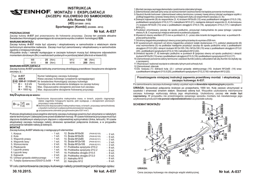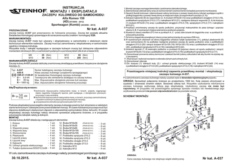 INSTRUKCJA MONTA¯U I EKSPLOATACJI ZACZEPU KULOWEGO DO SAMOCHODU: Alfa Romeo 159 (4D) (07/2005 - 2012) Sportwagon (Kombi) (03/2006 - 2012) Nr kat. A-037 PRZEZNACZENIE Zaczep kulowy A-037 jest przeznaczony do holowania przyczepy. Zaczep ten posiada aktualne Œwiadectwo Homologacji uprawniaj¹ce do oznaczenia wyrobu znakiem homologacji E20. WARUNKI MONTA¯U Zaczep kulowy A-037 mo¿e byæ u¿ywany i eksploatowany w samochodzie o w³aœciwym stanie technicznym elementów nadwozia. Zaczep musi byæ zamontowany i eksploatowany w samochodzie zgodnie z niniejsz¹ instrukcj¹. Wszystkie œruby i nakrêtki wystêpuj¹ce w zaczepie kulowym musz¹ byæ dokrêcone odpowiednim momentem obrotowym (Mo) o wartoœciach podanych w poni¿szej tabeli (dla œrub w klasie 8.8): M8 25 (Nm) M12 85 (Nm) M10 50 (Nm) M16 - 200 (Nm) WARUNKI EKSPLOATACJI Zaczep kulowy A-037 posiada tabliczkê znamionow¹ okreœlaj¹c¹ prawid³owe i bezpieczne obci¹¿enie zaczepu, tj. : Typ: A-037 A50-X E20 55R-01 3129-01 D = 9,9 kN S = 80 kg R = 1800 kg Numer katalogowy zaczepu kulowego Klasa zaczepu kulowego (urz¹dzenia sprzêgaj¹cego) Nr œwiadectwa Homologacji zaczepu kulowego Teoretyczna si³a odniesienia dzia³aj¹ca na zaczep kulowy Max. Dopuszczalne obci¹¿enie pionowe kuli zaczepu Max. dopuszczalne obci¹¿enie holowanej przyczepy Si³ê D wylicza siê ze wzoru: D= gx TxR kN T+R T-technicznie dopuszczalna maksymalna masa, w tonach, pojazdu ci¹gn¹cego (tak¿e ci¹gników holuj¹cych) ³¹cznie, jeœli wystêpuje, z obci¹¿eniem pionowym przyczepy z osiê centraln¹. R-technicznie dopuszczalna maksymalna masa, w tonach, przyczepy samochodowej z dyszlem ruchomym w p³aszczyŸnie pionowej lub naczepy. g- przyspieszenie ziemskie (przyjmowane jako 9,81 m/s2) Podczas eksploatacji poszczególne elementy zaczepu kulowego powinny byæ utrzymane w nale¿ytym stanie technicznym i zabezpieczone przed dzia³aniem korozji. W czasie holowania przyczepa musi byæ z³¹czona dodatkowym elastycznym z³¹czem o odpowiedniej wytrzyma³oœci (linka, ³añcuch). W czasie eksploatacji zaczepu kulowego nale¿y okresowo sprawdzaæ po³¹czenia œrubowe, a w przypadku poluzowania nakrêtek nale¿y je dokrêciæ. MONTA¯ Zaczep kulowy A-037 sk³ada siê z nastêpuj¹cych elementów: - 1 szt. 12. Œruba M10x30 (PN/M-82105) 1. Korpus - 2 szt. - 1 szt. 13. Œruba M10x35 (PN/M-82105) 2. Kula - 6 szt. - 1 szt. 14. Œruba M12x65 (PN/M-82101) 3. Wspornik prawy - 2 szt. - 1 szt. 15. Œruba M12x100 (PN/M-82101) 4. Wspornik lewy - 2 szt. - 2 szt. 16. Œruba M12x105 (PN/M-82101) 5. Wzmocnienie - 2 szt. - 4 szt. 6. P³askownik 17. Podk³adka sprê¿ysta Ø10,2 - 8 szt. - 1 szt. 7. £¹cznik prawy 18. Podk³adka sprê¿ysta Ø12,2 - 6 szt. - 1 szt. 8. £¹cznik lewy 19. Podk³adka okr¹g³a Ø10,5 - 8 szt. - 2 szt. 9. K¹townik - 8 szt. 20. Podk³adka okr¹g³a Ø13,0 - 1 szt. 10. Uchwyt gniazda elektrycznego - 6 szt. 21. Nakrêtka M10 11. Tulejka dystansowa Ø25/Ø12,5x58 - 4 szt. - 6 szt. 22. Nakrêtka M12 W celu zamontowania zaczepu kulowego nale¿y przestrzegaæ poni¿szego opisu: 30.10.2015. Nr kat. A-037 1.Monta¿ zaczepu wymaga demonta¿u i podcinania zderzaka tylnego. 2.Zdemontowaæ zderzak tylny wraz ze wzmocnieniem (wzmocnienie nie bêdzie ponownie montowane). 3.Opuœciæ t³umiki koñcowe i zdemontowaæ os³ony termiczne z prawej i lewej strony (obci¹æ wystaj¹ce szpilki z pod³ogi baga¿nika z prawej i lewej strony w miejscach styku ze wspornikami zaczepu (3, 4)) 4.Dokrêciæ k¹towniki (9) do wsporników (3, 4) œrubami M10x30 (12) wraz podk³adkami okr¹g³ymi Ø10,5 (19), podk³adkami sprê¿ystymi Ø10,2 (17) i nakrêtkami M10 (21), nastêpnie dokrêciæ wsporniki (3, 4) do korpusu (1) œrubami M10x35 (13) wraz z podk³adkami okr¹g³ymi Ø10,5 (19), sprê¿ystymi Ø10,2 (17) i nakrêtkami M10 (21). 5.Przy³o¿yæ zmontowany zaczep do spodu pod³u¿nic, przysun¹æ maksymalnie do pasa tylnego i poprzez otwory A, B, C wyznaczyæ miejsca wiercenia w podwoziu pojazdu. 6.Wywierciæ otwory wiert³em Ø13 mm w punktach A, C - przez obie œcianki do baga¿nika oraz w punktach B przez jedn¹ œciankê. 7.Od strony baga¿nika powiêkszyæ otwory przez jedn¹ œciankê do wymiaru Ø26 mm. 8.W wywierconych otworach od strony baga¿nika umieœciæ tulejki dystansowe (11), po³o¿yæ p³askowniki (6) oraz wzmocnienia (5) na pod³odze nastêpnie przy³o¿yæ zaczep do spodu pod³u¿nic wraz z podk³adkami okr¹g³ymi Ø13,0 (20) i skrêciæ œrubami M12x105 (16) i M12x100 (15) wraz z podk³adkami okr¹g³ymi Ø13,0 (20) , podk³adkami sprê¿ystymi Ø12,2 (18) i nakrêtkami M12 (22). 9.Umieœciæ ³¹czniki (7, 8) wewn¹trz pod³u¿nic w punktach B (poprzez otwory od spodu pod³u¿nic) i skrêciæ œrubami M10x35 (13) wraz z podk³adkami okr¹g³ymi Ø10,5 (19) i podk³adkami sprê¿ystymi Ø10,2 (17). 10.Zamontowaæ ponownie os³ony termiczne i zawiesiæ t³umiki (os³ony odkszta³ciæ tak aby t³umiki nie styka³y siê z zaczepem). 11.Wyznaczyæ i wykonaæ wyciêcie w zderzaku tylnym pod uchwyty kuli. 12.Zamontowaæ zderzak. 13.Do korpusu (1) dokrêciæ kulê (2) i uchwyt gniazda elektrycznego (10) œrubami M12x65 (14) wraz z podk³adkami okr¹g³ymi Ø13,0 (20), podk³adkami sprê¿ystymi Ø12,2 (18) i nakrêtkami M12 (22). Przestrzeganie niniejszej instrukcji zapewnia prawid³owy monta¿ i eksploatacjê zaczepu kulowego A-037. Po zamontowaniu zaczepu kulowego nale¿y uzyskaæ wpis w dowodzie rejestracyjnym pojazdu. UWAGA: Sprawdzaæ po³¹czenia œrubowe po przejechaniu 1000 km. Kulê zawsze utrzymywaæ w czystoœci i smarowaæ smarem sta³ym. Stosowaæ os³onê kuli. Wszystkie uszkodzenia mechaniczne zaczepu kulowego wykluczaj¹ dalsz¹ jego eksploatacjê. Uszkodzony zaczep nie mo¿e byæ naprawiany. W przypadku nie przestrzegania opisanego sposobu monta¿u lub niew³aœciwego jego u¿ytkowania producent nie ponosi odpowiedzialnoœci za powsta³e szkody. 15 11 20 20 18 22 SCHEMAT MONTA¯U 16 11 20 18 22 5 6 C 3 15 11 20 20 18 22 16 11 20 18 22 5 6 6