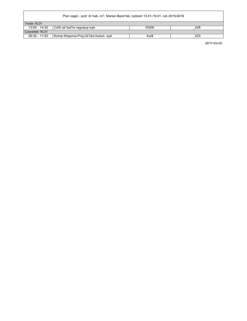 Plan zajęć - prof. dr hab. in?. Marian Bara?ski, tydzień 13.01-19.01, rok 2015/2016 ?roda 15.01 13:00 - 14:30 Czwartek 16.01 09:30 - 11:00 CAD uk?ad?w regulacji wyk KSS8 _428 Komp.Wspoma.Proj.Uk?ad.Autom. wyk Aut8 _423 2017-03-03