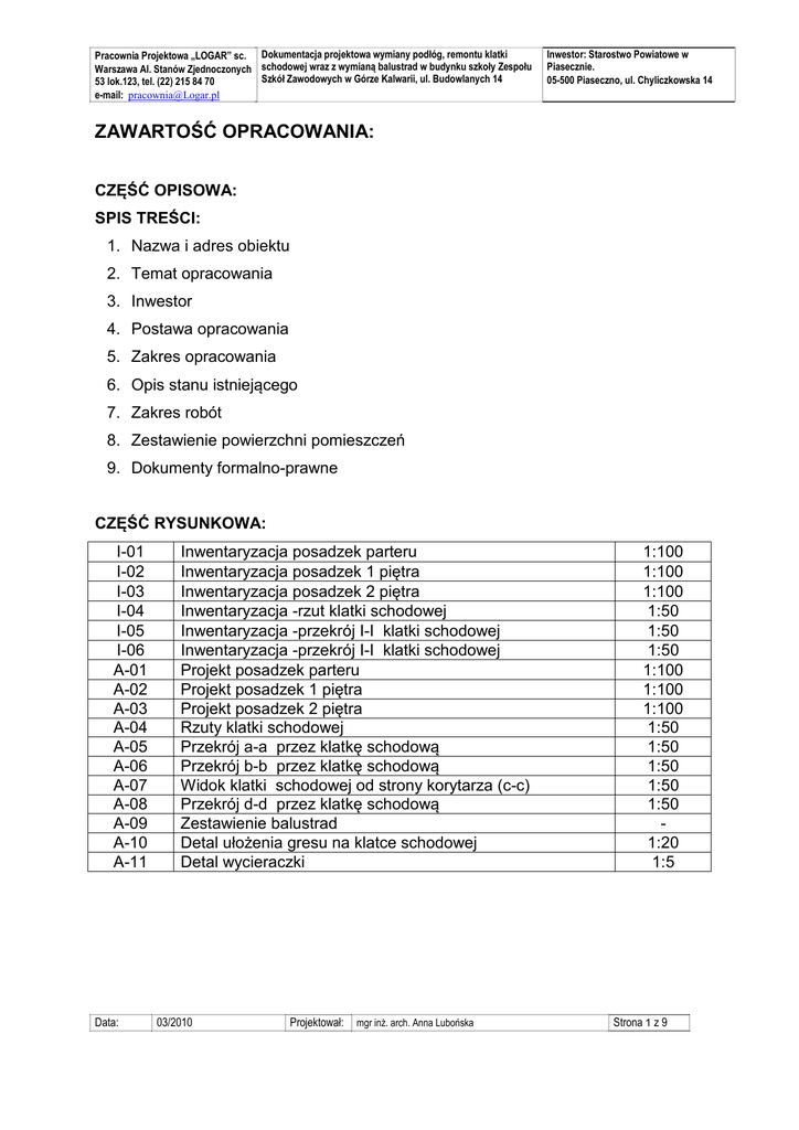 Pracownia Projektowa „LOGAR” sc. Dokumentacja projektowa wymiany podłóg, remontu klatki Warszawa Al. Stanów Zjednoczonych schodowej wraz z wymianą balustrad w budynku szkoły Zespołu Szkół Zawodowych w Górze Kalwarii, ul. Budowlanych 14 53 lok.123, tel. (22) 215 84 70 e-mail: [email protected] Inwestor: Starostwo Powiatowe w Piasecznie. 05-500 Piaseczno, ul. Chyliczkowska 14 ZAWARTOŚĆ OPRACOWANIA: CZĘŚĆ OPISOWA: SPIS TREŚCI: 1. Nazwa i adres obiektu 2. Temat opracowania 3. Inwestor 4. Postawa opracowania 5. Zakres opracowania 6. Opis stanu istniejącego 7. Zakres robót 8. Zestawienie powierzchni pomieszczeń 9. Dokumenty formalno-prawne CZĘŚĆ RYSUNKOWA: I-01 I-02 I-03 I-04 I-05 I-06 A-01 A-02 A-03 A-04 A-05 A-06 A-07 A-08 A-09 A-10 A-11 Data: Inwentaryzacja posadzek parteru Inwentaryzacja posadzek 1 piętra Inwentaryzacja posadzek 2 piętra Inwentaryzacja -rzut klatki schodowej Inwentaryzacja -przekrój I-I klatki schodowej Inwentaryzacja -przekrój I-I klatki schodowej Projekt posadzek parteru Projekt posadzek 1 piętra Projekt posadzek 2 piętra Rzuty klatki schodowej Przekrój a-a przez klatkę schodową Przekrój b-b przez klatkę schodową Widok klatki schodowej od strony korytarza (c-c) Przekrój d-d przez klatkę schodową Zestawienie balustrad Detal ułożenia gresu na klatce schodowej Detal wycieraczki 03/2010 Projektował: mgr inŜ. arch. Anna Lubońska 1:100 1:100 1:100 1:50 1:50 1:50 1:100 1:100 1:100 1:50 1:50 1:50 1:50 1:50 1:20 1:5 Strona 1 z 9 Pracownia Projektowa „LOGAR” sc. Dokumentacja projektowa wymiany podłóg, remontu klatki Warszawa Al. Stanów Zjednoczonych schodowej wraz z wymianą balustrad w budynku szkoły Zespołu Szkół Zawodowych w Górze Kalwarii, ul. Budowlanych 14 53 lok.123, tel. (22) 215 84 70 e-mail: [email protected] Inwestor: Starostwo Powiatowe w Piasecznie. 05-500 Piaseczno, ul. Chyliczkowska 14 1. OPIS: 1. Nazwa i adres obiektu Budynek Zespołu Szkół Zawodowych położony jest przy ul. Budowlanych 14 w Górze Kalwarii 2. Temat opracowania Dokumentacja projektowa wymiany podłóg, remontu klatki schodowej wraz z wymianą balustrad w budynku szkoły Zespołu Szkół Zawodowych w Górze Kalwarii, ul. Budowlanych 14 3. Inwestor Starostwo Powiatowe w Piasecznie, 05-500 Piaseczno ul. Chyliczkowska 14 4. Podstawa opracowania Umowa 10/RIMIII/2010 z dnia 22.02.2010 zawarta pomiędzy Starostwem Powiatowym w Piasecznie, a firmą Logar s. c. 5. Zakres opracowania Opracowanie obejmuje wymianę posadzek w większości pomieszczeń w budynku szkoły na 3 kondygnacjach i remont klatki schodowej wraz z wymiana balustrad. Wszystkie pomieszczenia będące w zakresie opracowania zostały zinwentaryzowane. 6. Opis istniejących pomieszczeń W budynku szkoły większość posadzek pochodzi z lat siedemdziesiątych XX w. W klasach, na korytarzach i 1 piętra posadzki są wykończone płytkami PCV. Jedynie na parterze hall wejściowy i korytarz wykończono płytkami gresowymi 20x20 cm w kolorze szaro-kremowym. Na parterze w szatni i na korytarzu znajdują się otwory rewizyjne instalacji c.o. (do zachowania). Z późniejszego okresu pochodzą nowsze wykładziny typu Tarkett w pomieszczeniach na parterze w części administracyjnej (sekretariat, pokoje: dyrektora, księgowych, kasa itp.) oraz w czytelni i pomieszczeniach biblioteki. Ten sam typ wykładziny został zastosowany również na Data: 03/2010 Projektował: mgr inŜ. arch. Anna Lubońska Strona 2 z 9 Pracownia Projektowa „LOGAR” sc. Dokumentacja projektowa wymiany podłóg, remontu klatki Warszawa Al. Stanów Zjednoczonych schodowej wraz z wymianą balustrad w budynku szkoły Zespołu Szkół Zawodowych w Górze Kalwarii, ul. Budowlanych 14 53 lok.123, tel. (22) 215 84 70 e-mail: [email protected] Inwestor: Starostwo Powiatowe w Piasecznie. 05-500 Piaseczno, ul. Chyliczkowska 14 piętrach w niektórych pomieszczeniach (np. Pracownia budowlana, komputerowa) i pokoju nauczycielskim, czy gabinecie zastępcy Dyrektora. Podłoga w Sali Gimnastycznej na legarach została wykonana stosunkowo niedawno (około 4 lata temu). Z tego powodu należy zachować wykładzina obiektowa gumowa w tym pomieszczeniu. Pomieszczenia zaplecza znajdujące się za Salą Gimnastyczną są położone poniżej poziomu podłogi Sali. Do jednego z nich wejście z Sali Gimnastycznej jest po pochylni. W najgorszym stanie są posadzki w części zaplecza Sali Gimnastycznej. W przebieralniach zostały jeszcze zniszczone posadzki z lastrico. W węzłach sanitarnych przy szatniach podłogi są wykonane z terakoty (do wymiany). Część pomieszczeń zaplecza WF prowizorycznie pokryta jest wykładziną. Jedynie w sali Fitness należy zachować istniejącą niedawno położoną wykładzinę dywanową. Najpóźniej została wykonana posadzka w niektórych pomieszczeniach sanitarnych został tam położony nowa terakota 30x30 cm. W tych pomieszczeniach posadzka nie będzie remontowana. Data: 03/2010 Projektował: mgr inŜ. arch. Anna Lubońska Strona 3 z 9 Pracownia Projektowa „LOGAR” sc. Dokumentacja projektowa wymiany podłóg, remontu klatki Warszawa Al. Stanów Zjednoczonych schodowej wraz z wymianą balustrad w budynku szkoły Zespołu Szkół Zawodowych w Górze Kalwarii, ul. Budowlanych 14 53 lok.123, tel. (22) 215 84 70 e-mail: [email protected] Inwestor: Starostwo Powiatowe w Piasecznie. 05-500 Piaseczno, ul. Chyliczkowska 14 Istniejące posadzki, zwłaszcza z płytek PCV są miejscami zniszczone. W klasach, gdzie wykonano nowa instalacje c.o. są liczne uszkodzenia płytek. We wszystkich pomieszczeniach były pierwotnie cokoły, lub listwy przypodłogowe. Obecnie w wielu miejscach zostały zdemontowane. Poziom istniejących posadzek na jednej kondygnacji jest bardzo różny. Wynika to z niedokładności wykonawczych, jak i zastosowania różnych materiałów przy późniejszych remontach posadzek. W drzwiach pomiędzy pomieszczeniami przylegającymi o różnych rzędnych posadzek zastosowano progi drewniane