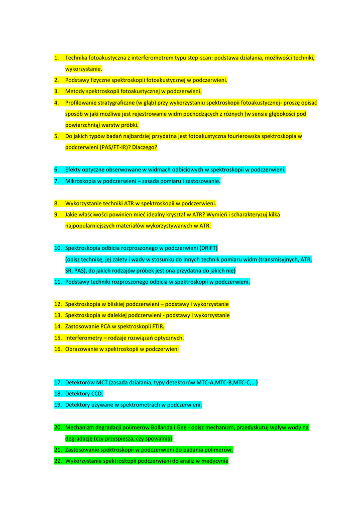 1. Technika fotoakustyczna z interferometrem typu step-scan: podstawa działania, możliwości techniki, wykorzystanie. 2. Podstawy fizyczne spektroskopii fotoakustycznej w podczerwieni. 3. Metody spektroskopii fotoakustycznej w podczerwieni. 4. Profilowanie stratygraficzne (w głąb) przy wykorzystaniu spektroskopii fotoakustycznej- proszę opisać sposób w jaki możliwe jest rejestrowanie widm pochodzących z różnych (w sensie głębokości pod powierzchnią) warstw próbki. 5. Do jakich typów badań najbardziej przydatna jest fotoakustyczna fourierowska spektroskopia w podczerwieni (PAS/FT-IR)? Dlaczego? 6. Efekty optyczne obserwowane w widmach odbiciowych w spektroskopii w podczerwieni. 7. Mikroskopia w podczerwieni – zasada pomiaru i zastosowanie. 8. Wykorzystanie techniki ATR w spektroskopii w podczerwieni. 9. Jakie właściwości powinien mieć idealny kryształ w ATR? Wymień i scharakteryzuj kilka najpopularniejszych materiałów wykorzystywanych w ATR. 10. Spektroskopia odbicia rozproszonego w podczerwieni (DRIFT) (opisz technikę, jej zalety i wady w stosunku do innych technik pomiaru widm (transmisyjnych, ATR, SR, PAS), do jakich rodzajów próbek jest ona przydatna do jakich nie) 11. Podstawy techniki rozproszonego odbicia w spektroskopii w podczerwieni. 12. Spektroskopia w bliskiej podczerwieni – podstawy i wykorzystanie 13. Spektroskopia w dalekiej podczerwieni - podstawy i wykorzystanie 14. Zastosowanie PCA w spektroskopii FTIR. 15. Interferometry – rodzaje rozwiązań optycznych. 16. Obrazowanie w spektroskopii w podczerwieni 17. Detektorów MCT (zasada działania, typy detektorów MTC-A,MTC-B,MTC-C,...) 18. Detektory CCD. 19. Detektory używane w spektrometrach w podczerwieni. 20. Mechanizm degradacji polimerów Bollanda i Gee - opisz mechanizm, przedyskutuj wpływ wody na degradację (czy przyspiesza, czy spowalnia) 21. Zastosowanie spektroskopii w podczerwieni do badania polimerów. 22. Wykorzystanie spektroskopii podczerwieni do analiz w medycynie chomikuj.pl/papdeglab hasło (WCHUJ) temat6-Introduction_ to_ PAS.pdf 5,7 MB 12 paź 11 o 14:10 temat5-bolland-gee.PDF 11,6 MB 12 paź 11 o 14:02 temat3-IR_detectors.pdf 860 kB 12 paź 11 o 14:02 temat2-drift.pdf 842 kB 12 paź 11 o 14:02 temat1-crystal_ref.pdf