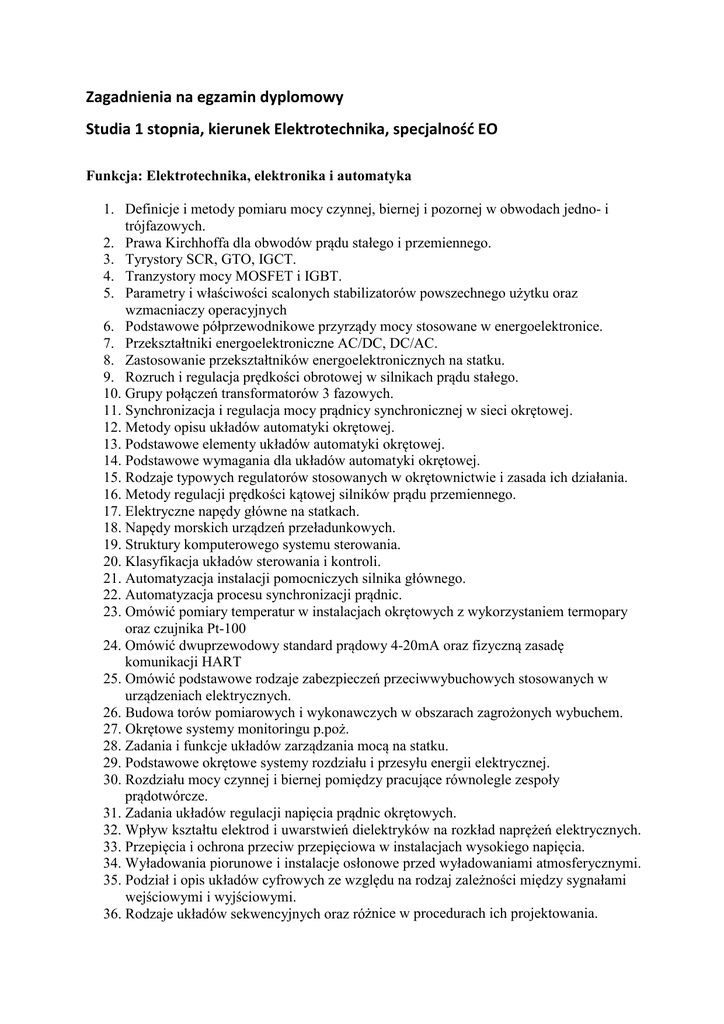 Zagadnienia na egzamin dyplomowy Studia 1 stopnia, kierunek Elektrotechnika, specjalność EO Funkcja: Elektrotechnika, elektronika i automatyka 1. Definicje i metody pomiaru mocy czynnej, biernej i pozornej w obwodach jedno- i trójfazowych. 2. Prawa Kirchhoffa dla obwodów prądu stałego i przemiennego. 3. Tyrystory SCR, GTO, IGCT. 4. Tranzystory mocy MOSFET i IGBT. 5. Parametry i właściwości scalonych stabilizatorów powszechnego użytku oraz wzmacniaczy operacyjnych 6. Podstawowe półprzewodnikowe przyrządy mocy stosowane w energoelektronice. 7. Przekształtniki energoelektroniczne AC/DC, DC/AC. 8. Zastosowanie przekształtników energoelektronicznych na statku. 9. Rozruch i regulacja prędkości obrotowej w silnikach prądu stałego. 10. Grupy połączeń transformatorów 3 fazowych. 11. Synchronizacja i regulacja mocy prądnicy synchronicznej w sieci okrętowej. 12. Metody opisu układów automatyki okrętowej. 13. Podstawowe elementy układów automatyki okrętowej. 14. Podstawowe wymagania dla układów automatyki okrętowej. 15. Rodzaje typowych regulatorów stosowanych w okrętownictwie i zasada ich działania. 16. Metody regulacji prędkości kątowej silników prądu przemiennego. 17. Elektryczne napędy główne na statkach. 18. Napędy morskich urządzeń przeładunkowych. 19. Struktury komputerowego systemu sterowania. 20. Klasyfikacja układów sterowania i kontroli. 21. Automatyzacja instalacji pomocniczych silnika głównego. 22. Automatyzacja procesu synchronizacji prądnic. 23. Omówić pomiary temperatur w instalacjach okrętowych z wykorzystaniem termopary oraz czujnika Pt-100 24. Omówić dwuprzewodowy standard prądowy 4-20mA oraz fizyczną zasadę komunikacji HART 25. Omówić podstawowe rodzaje zabezpieczeń przeciwwybuchowych stosowanych w urządzeniach elektrycznych. 26. Budowa torów pomiarowych i wykonawczych w obszarach zagrożonych wybuchem. 27. Okrętowe systemy monitoringu p.poż. 28. Zadania i funkcje układów zarządzania mocą na statku. 29. Podstawowe okrętowe systemy rozdziału i przesyłu energii elektrycznej. 30. Rozdziału mocy czynnej i biernej pomiędzy pracujące równolegle zespoły prądotwórcze. 31. Zadania układów regulacji napięcia prądnic okrętowych. 32. Wpływ kształtu elektrod i uwarstwień dielektryków na rozkład naprężeń elektrycznych. 33. Przepięcia i ochrona przeciw przepięciowa w instalacjach wysokiego napięcia. 34. Wyładowania piorunowe i instalacje osłonowe przed wyładowaniami atmosferycznymi. 35. Podział i opis układów cyfrowych ze względu na rodzaj zależności między sygnałami wejściowymi i wyjściowymi. 36. Rodzaje układów sekwencyjnych oraz różnice w procedurach ich projektowania. 37. Budowa i działanie elementów pamięciowych w układach sekwencyjnych. 38. Zastosowanie rejestrów i ich rodzaje. 39. Modele referencyjne sieci komputerowych. 40. Sygnały, media i metody dostępu do medium w sieciach komputerowych. 41. Adresacja i trasowanie w sieciach LAN i WAN. 42. Cele tworzenia i właściwości sieci informacyjnych oraz sieci przemysłowych. 43. Zasady i narzędzia strukturyzacji programu sterownika PLC. 44. Typy przerwań stosowanych w PLC, ich zastosowanie i zasady konfiguracji. 45. Instrukcje przekaźników czasowych zgodnych z normą IEC. 46. Funkcje czasowe typowe w programowaniu PLC 47. Wytrzymałość elektryczna i mechanizmy przebicia dielektryka. 48. Wpływ temperatury na trwałość materiałów elektroizolacyjnych. 49. Analogowe i cyfrowe narzędzia pomiarowe. 50. Błąd a niepewność pomiaru. 51. Podstawowe metody pomiaru parametrów (R, L, C) i wielkości elektrycznych (U, I, P, S Q, E, cosϕ, itd.). 52. Pomiary w warunkach przemysłowych (wielkości elektryczne i nieelektryczne, obszary niebezpieczne, interfejsy, systemy pomiarowe). 53. Wady i zalety prądnic wałowych. Funkcja: Konserwacja i naprawa 1. 2. 3. 4. Charakterystyka i wpływ środowiska okrętowego na urządzenia elektryczne. Przyczyny i skutki zwarć w sieciach prądu stałego i przemiennego. Budowa i podstawowe kryteria doboru kabli do zastosowań okrętowych. Konstrukcję podstawowych łączników elektrycznych stosowanych w okrętownictwie z uwzględnieniem sposobów gaszenia łuku elektrycznego. 5. Podstawowe sposoby zabezpieczania obwodów i urządzeń elektrycznych. 6. Oświetlenie podstawowe, awaryjne i nawigacyjne statków. 7. Zasady prawidłowej eksploatacji akumulatorów okrętowych. 8. Automatyka chłodni okrętowej 9. Budowa i eksploatacja kontenerów chłodniczych. 10. Struktura i działanie typowej instalacji chłodniczej. 11. Wymagania stawiane awaryjnym zespołom prądotwórczym na statkach. 12. Typowe mechanizmy pomocnicze siłowni okrętowej. 13. Przywracanie do ruchu siłowni okrętowej po zaniku zasilania (black-out). 14. Przygotowanie okrętowych silników głównych i pomocniczych do startu. 15. Podstawowe zagadnienia przepisów dotyczących budowy, remontu i klasyfikacji statków z uwzględnieniem działu elektrycznego. 16. Podstawowe zagadnienia związane z teorią diagnostyczną i niezawodnościową okrętowych urządzeń elektrycznych. 17. Proces eksploatacyjno diagnostyczno naprawczy w okrętowych urządzeniach elektrycznych. 18. Proces postępowania diagnostyczno lokalizacyjnego w diagnostyce bezkomputerowej w okrętowych urządzeniach elektrycznych. 19. Proces postępowania diagnostyczno lokalizacyjnego w diagnostyce komputerowej w okrętowych urządzeniach elektrycznych oraz problem tworzenia bazy części zapasowych. 20. Podstawowe wymagania konwencji SOLAS dotyczące wyposażenie elektrycznego statków. 21. Zasady eksploatacji ochrony katodowej kadłuba statku. 22. Zadania towarzystw klasyfikacyjnych i wydawane przez nie dokumenty. 23. Wyposażenie ratunkowe na statku handlowym. 24. Rodzaje pomieszczeń na statku i ich cechy. 25. Budowa, napęd i sterownie urządzeń cumowniczo-kotwicznych. 26. Typy statków i stosowane na nich urządzenia pokładowe. 27. Rodzaje kompasów i 